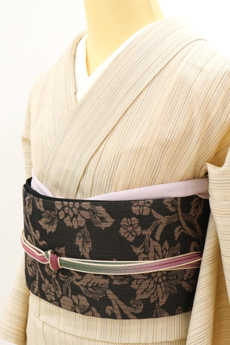 落ち着いた色遣いで表現された優美な古典意匠が装いにしっとりとした気品を添えるお品、絹ならではの穏やかな光沢を帯びたさっくりと軽やかな地風も魅力的ですね。ドレッシーな紬や小紋などに合わせて大人の女性らしい品格ある装いをお楽しみ頂けることと思います。ちょっとした集まりや観劇などにいかがでしょうか。