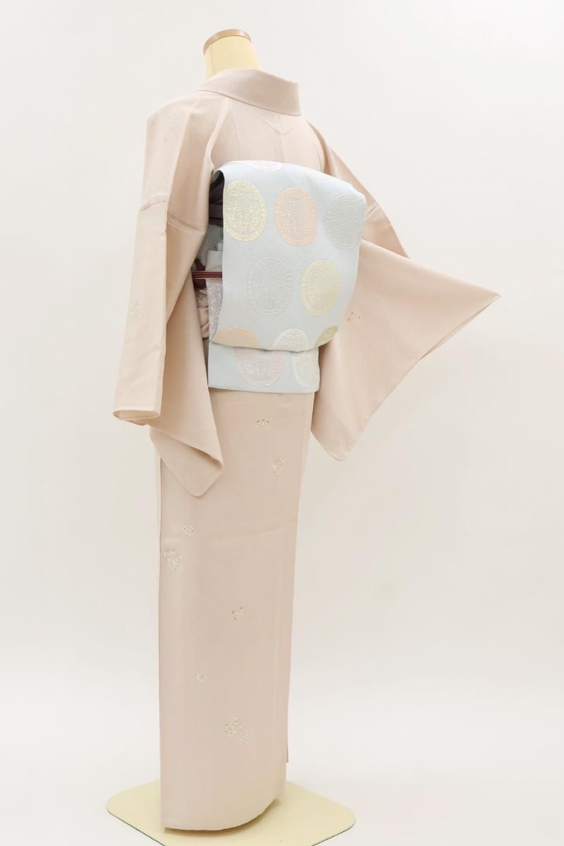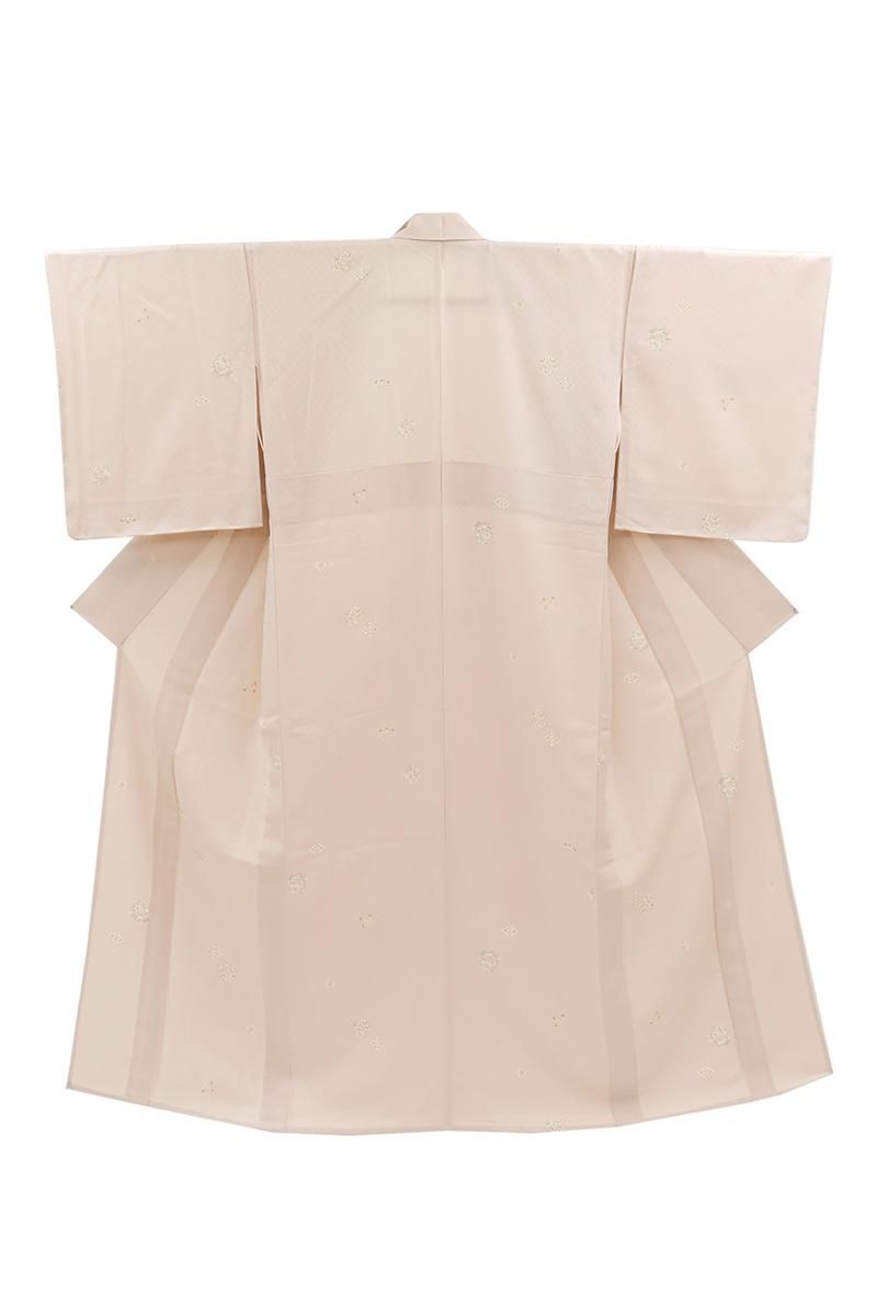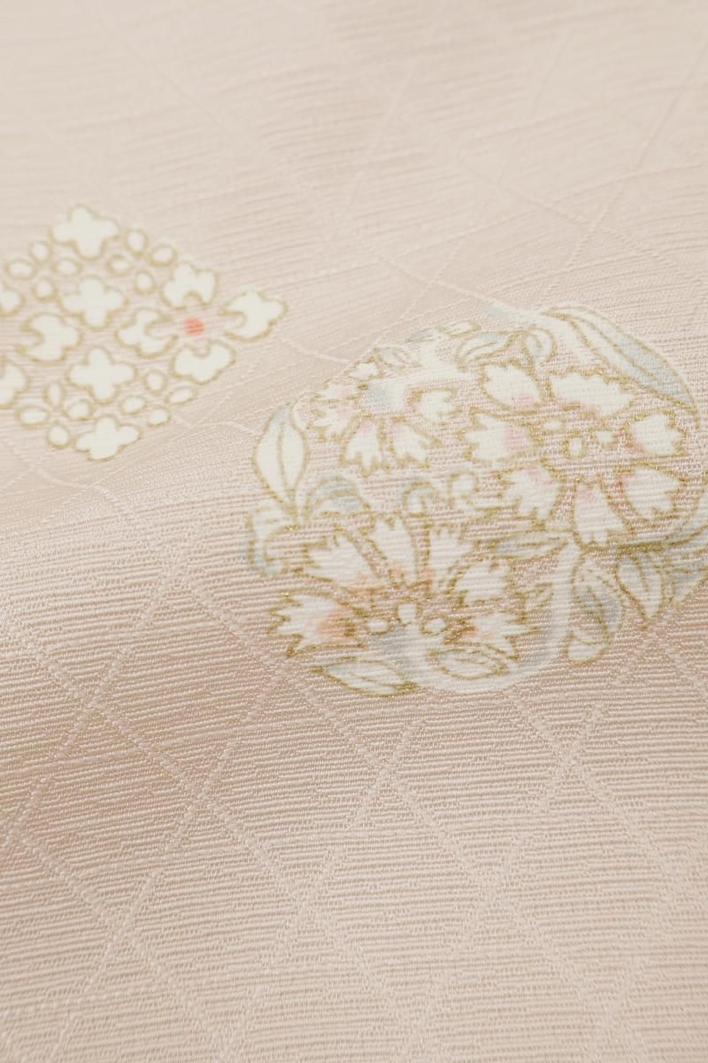 やや色を薄めたシェルピンクが近いでしょうか、灰みの淡いピンクの地に菊や撫子などの花の丸や花菱、松葉文などを散らした単衣の小紋です。