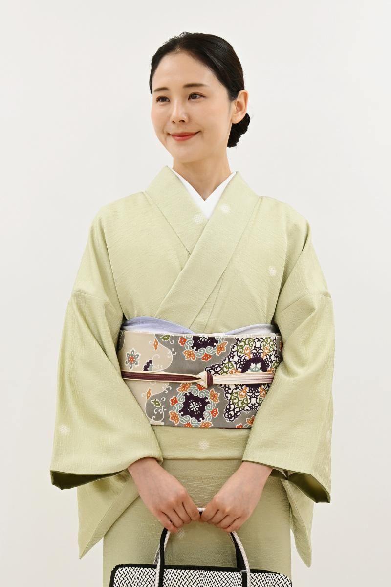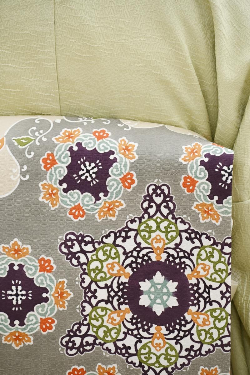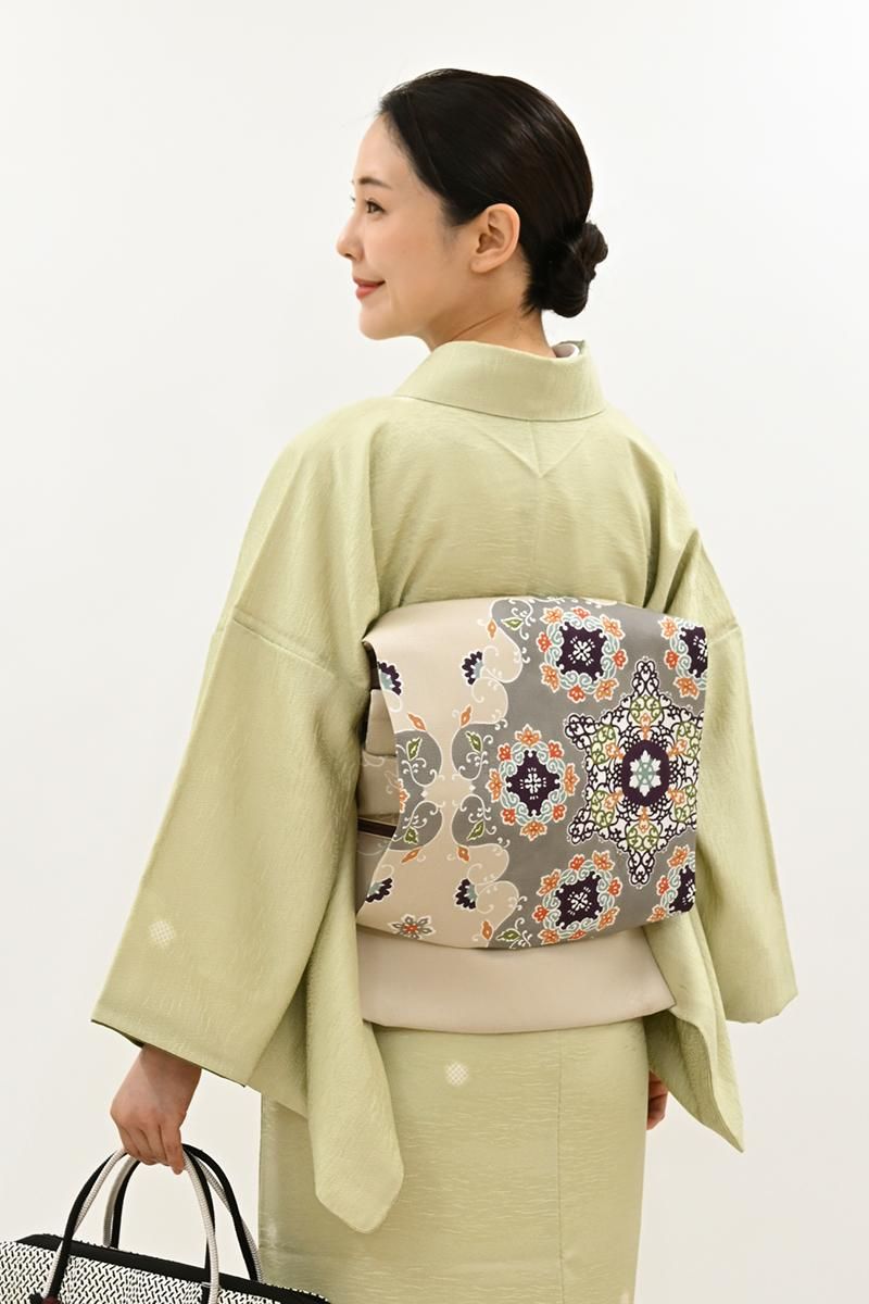 やや色を薄めたベージュが近いでしょうか、青海波の地紋の浮かぶ灰みの薄茶系の地に彩り豊かな華文を染めたお品、程よく落ち着いたしっとりとした色遣いが大人の女性らしい華やぎを見せていますね。紬から小紋、紋無しの色無地などに合わせて趣味性豊かな装いをお楽しみくださいませ。