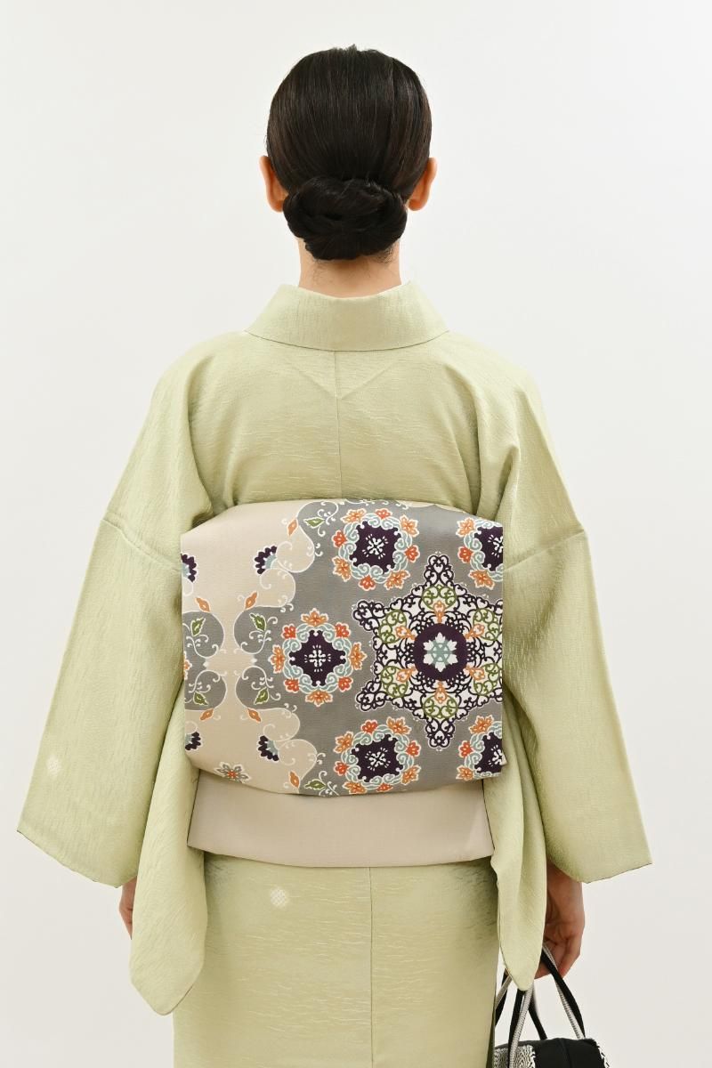 京都の山懐にて和染紅型の名で洗練された型染めの着物や帯を創り続ける栗山工房より、西田裕子さんの型絵染名古屋帯です。