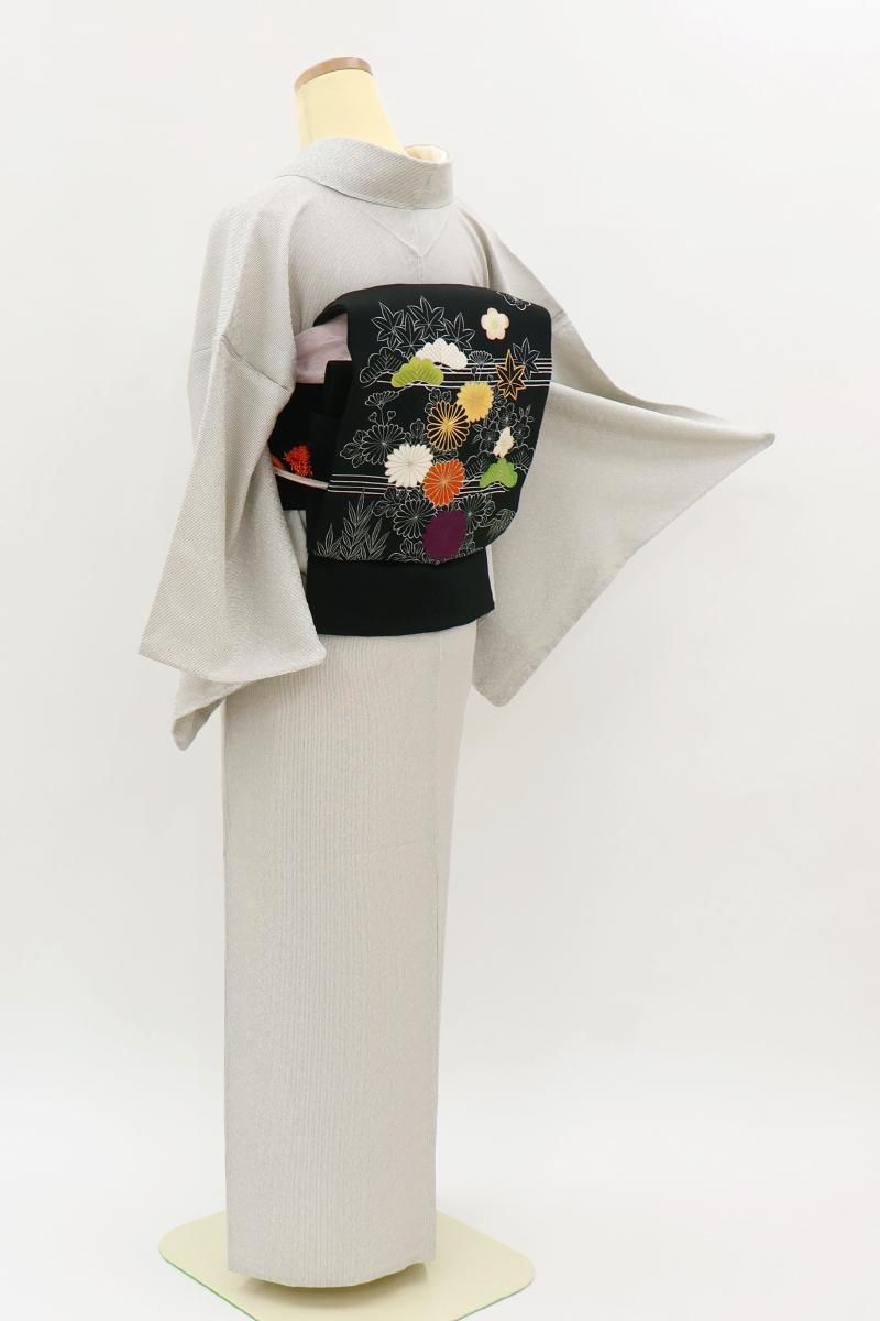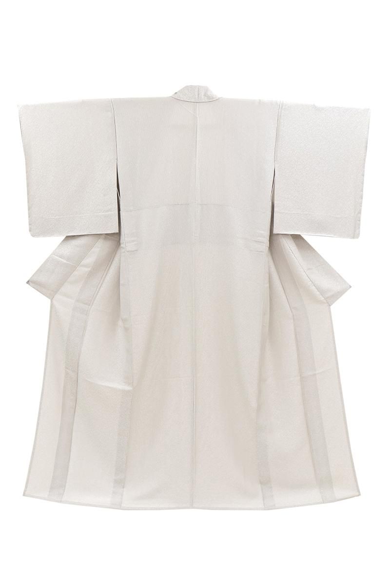 穏やかな光沢感のある気品豊かな地に、光の加減で浮かぶ優美な花唐草の意匠がニュアンスある景色を創る一枚、シンプルな色柄ゆきはお召しになる方の年齢を選ばず、無地感覚で幅広い帯合わせを御楽しみいただけそうですね。季節の染め帯や少し格高の名古屋帯、軽めの袋帯などを合わせて、観劇やお友達とのお食事会などに洗練された装いをいかがでしょうか。