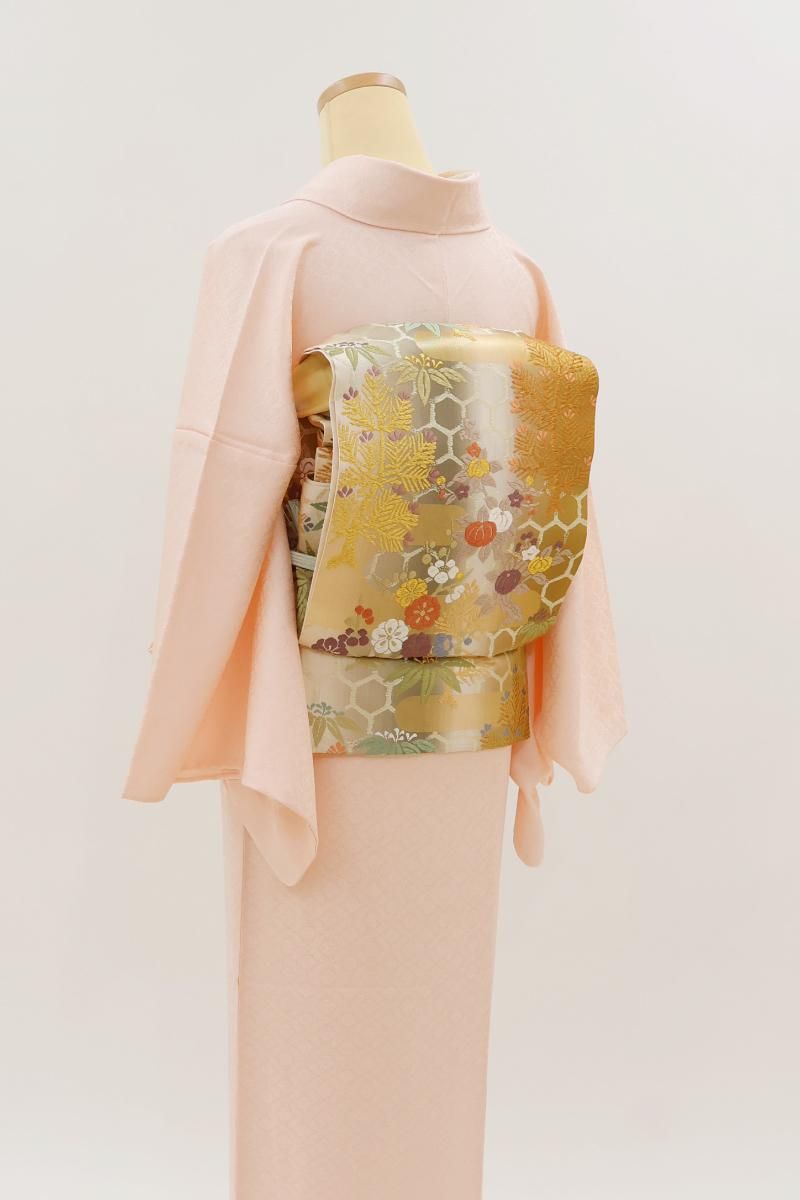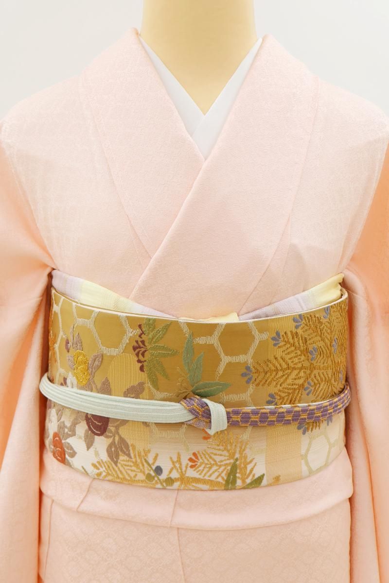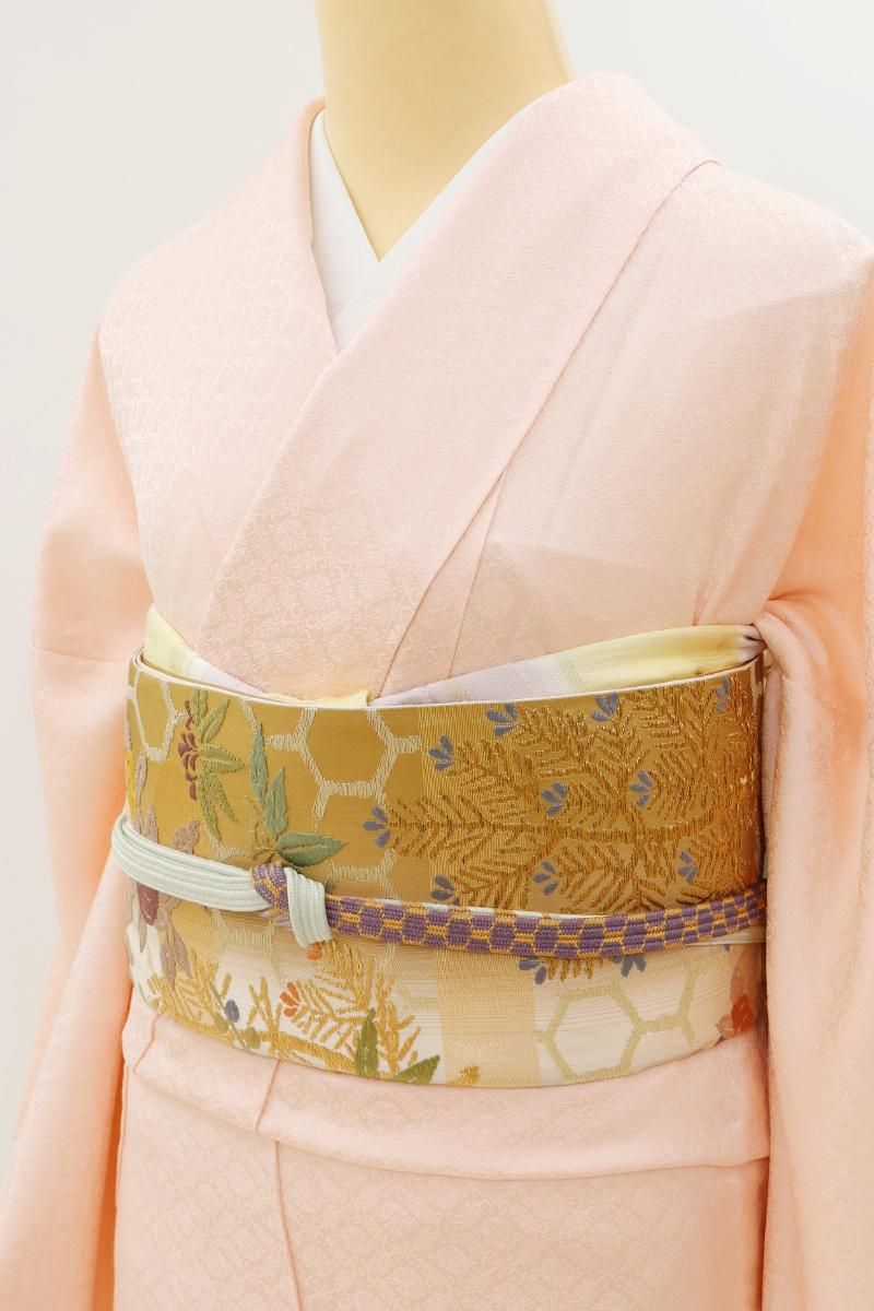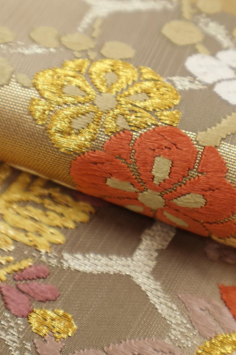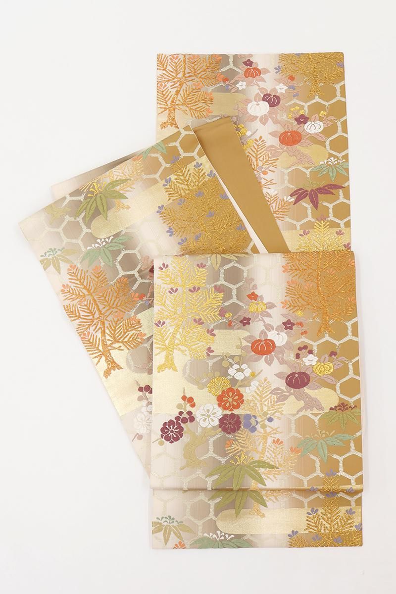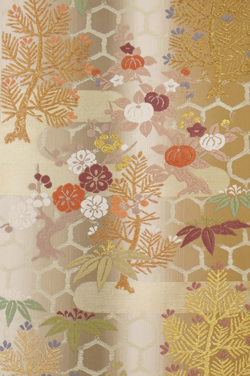 こちらはこっくりとした黄みの茶色や淡いベージュ、緑みのグレーなどで竪暈かしを配した地に、亀甲に松竹梅などを織りだしたお品、上質な唐織独特の光沢や立体感が晴れの日の装いを格調高く引き立ててくれることと思います。訪問着などはもちろん、紋付色無地などに合わせて帯を主役とした着こなしも素敵ですね。ぜひこの機会にお手に取ってご覧くださいませ。