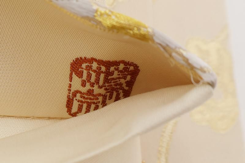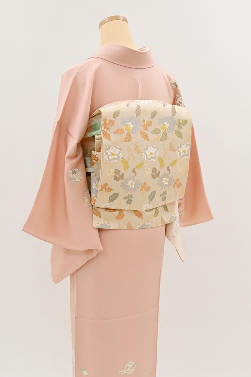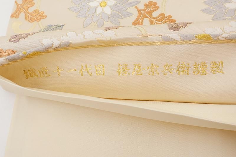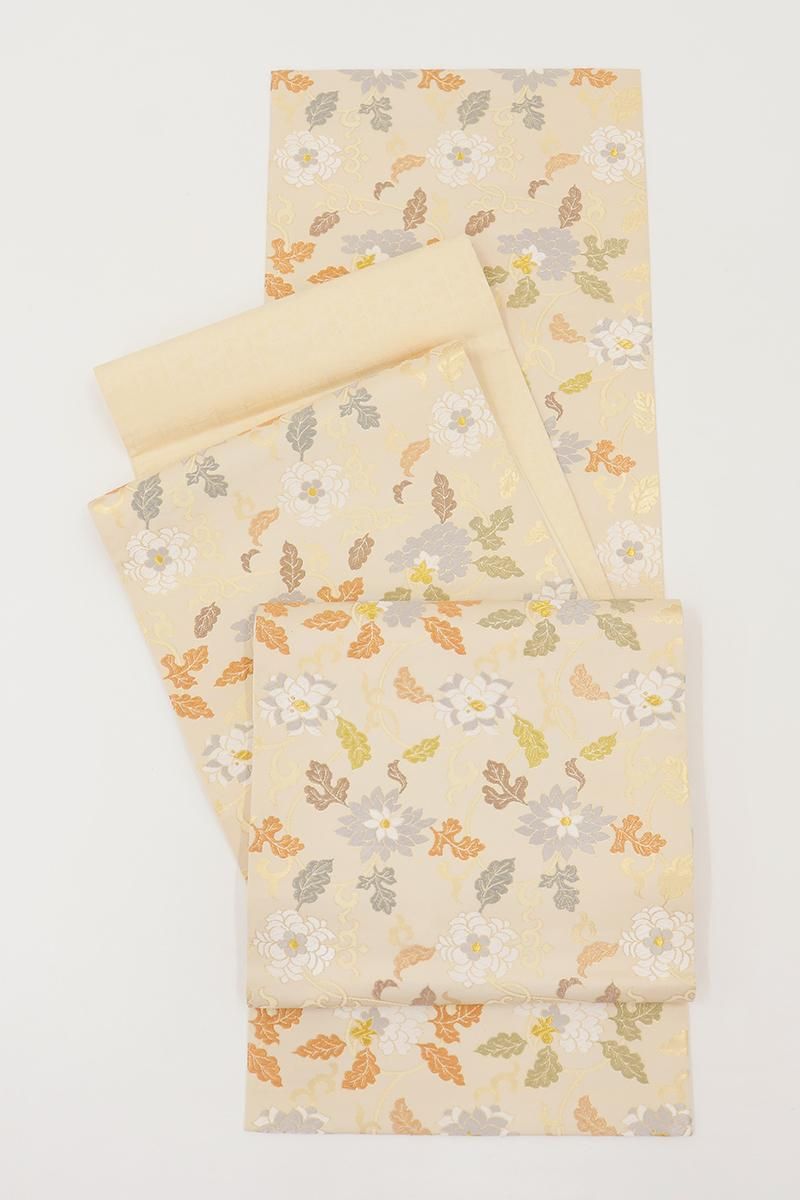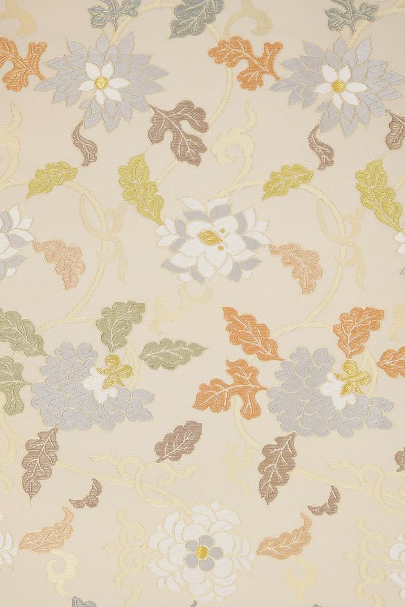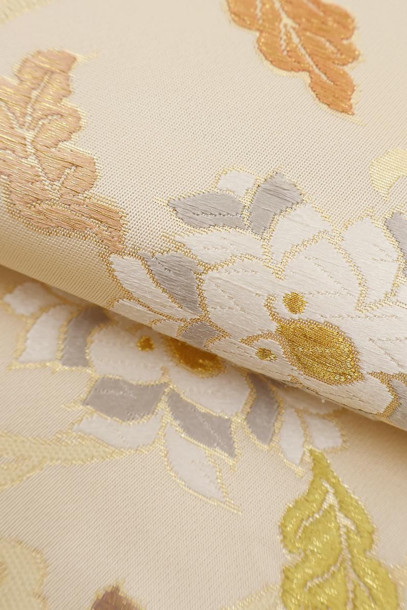 こちらは淡いクリームの地に、優美な花唐草文様を配したお品、端正な織りの表情に、甘撚りの絹糸の美しい光沢や金糸の明るい煌めきが豊かな気品を添えてくれることと思います。柔らかな色遣いで季節を問わず長くお召しいただけるひと品、色無地や付下げ、訪問着などに合わせてエレガントな装いをお楽しみくださいませ。