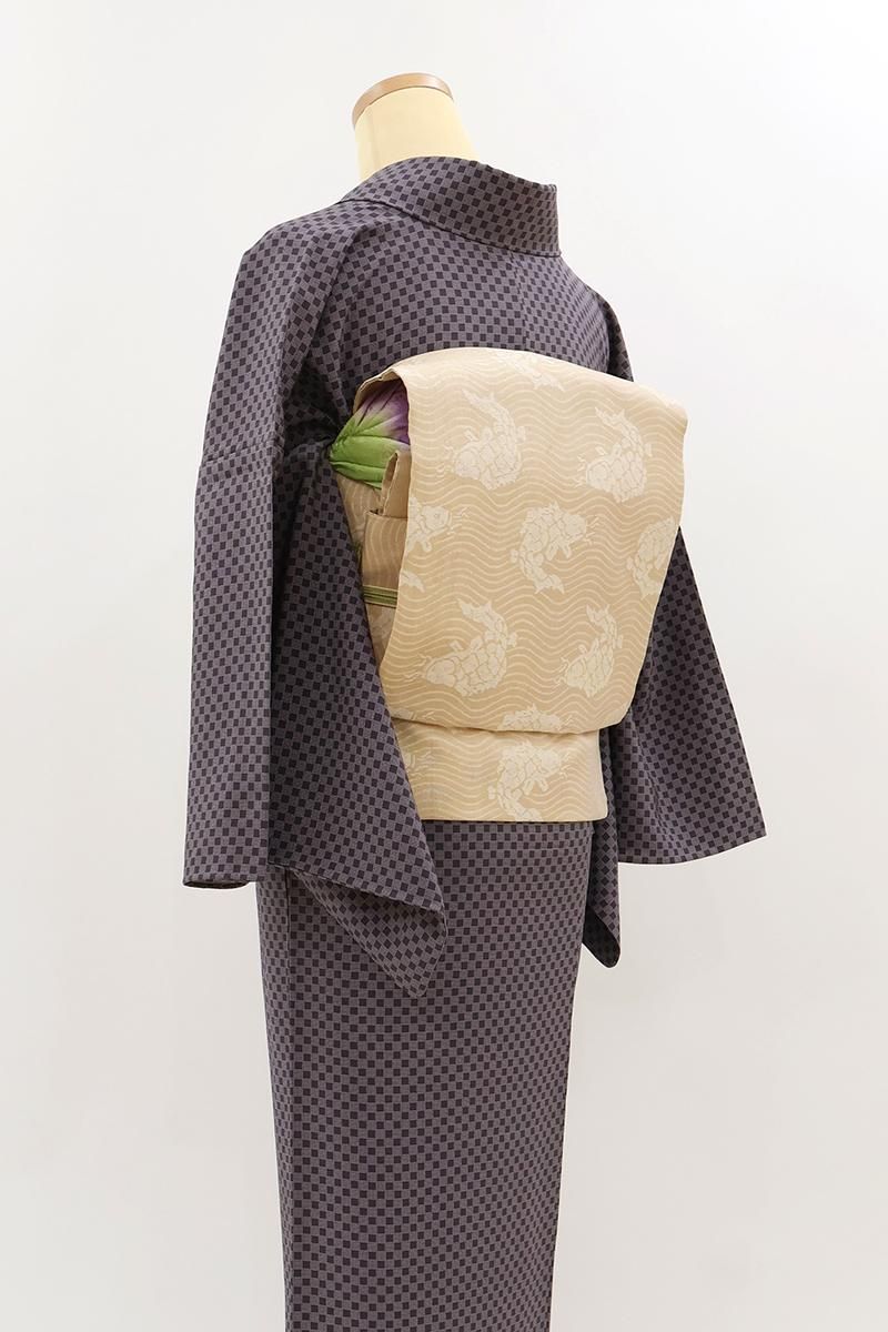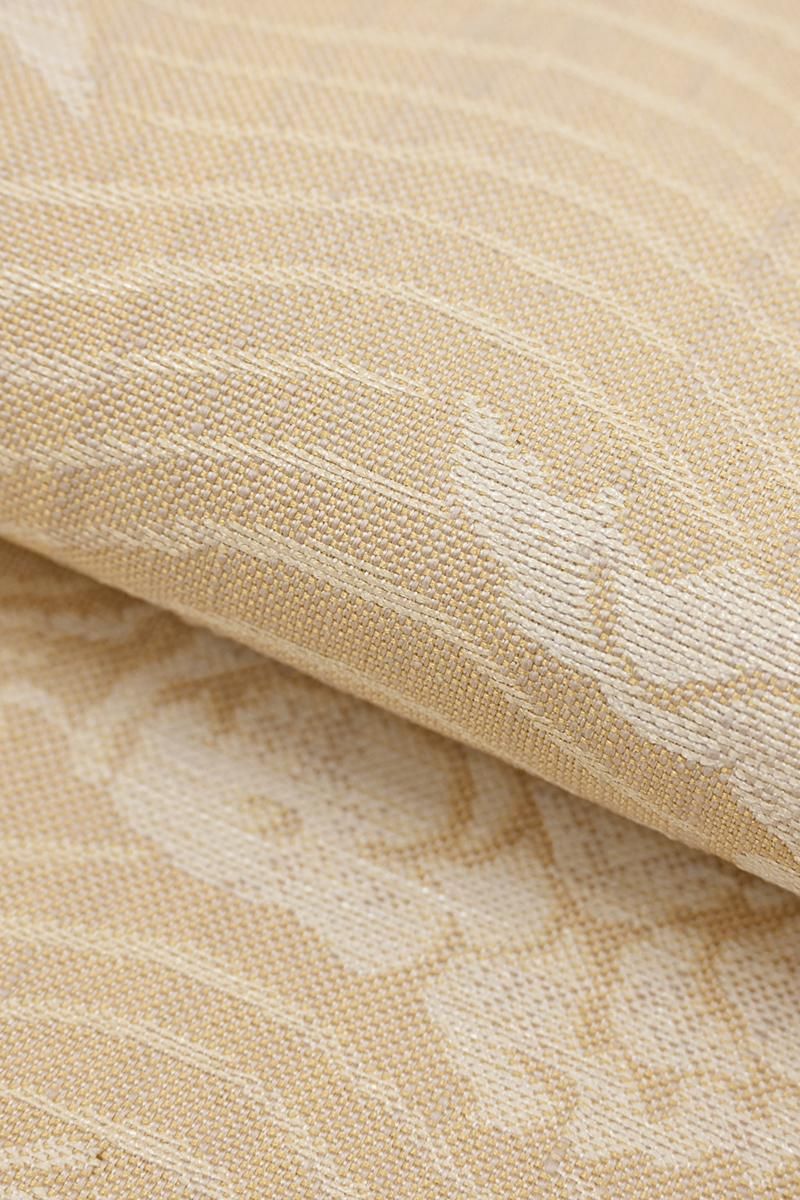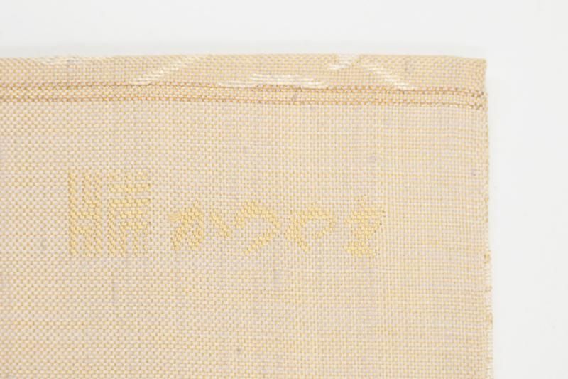こちらは香色が近いでしょうか、さっくりとした地風の灰みの強いベージュの地に、荒磯文を織り出したお品、ラメ糸のほのかなきらめきが気品を添え、装いを格調高く引き立ててくれることと思います。何かと活躍の機会の多いきちんとした印象の織名古屋帯は一本あると安心ですね。この機会にいかがでしょうか。