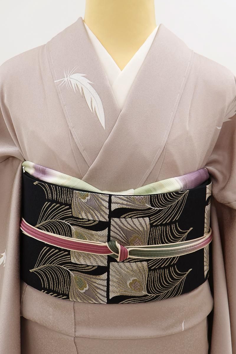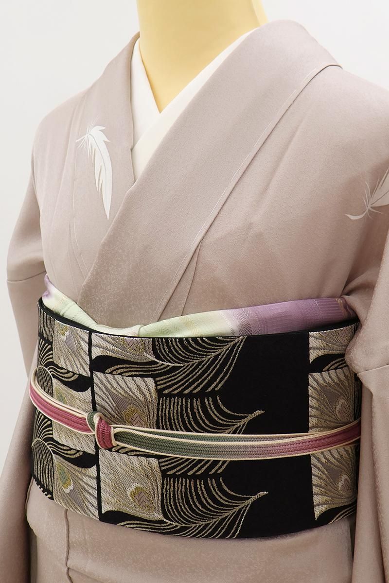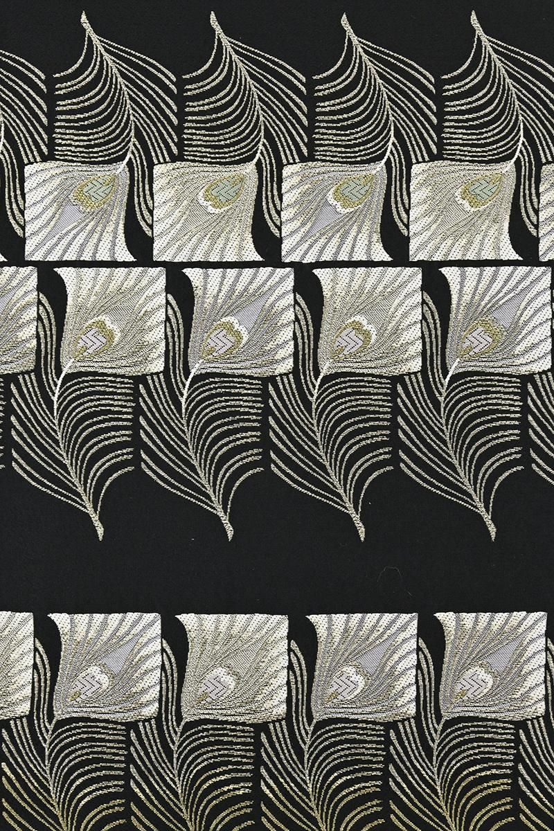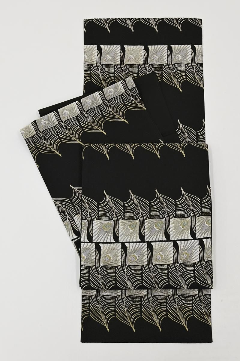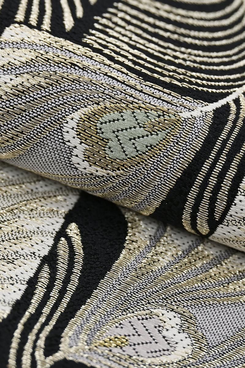 ニュアンスのある地紋が浮かぶ、黒色の地に横段に孔雀の羽根の図を織り出した袋帯です。