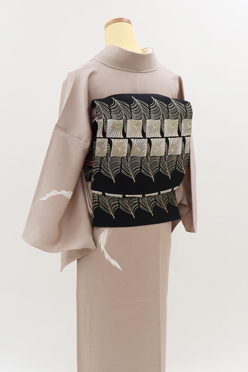 きりりとシックなお色目に並べられた優雅なモチーフが後ろ姿を印象的に引き立てるお品、ホテルなどの洋の空間や現代の街並みにも美しく映えそうですね。色無地や付下げ、訪問着などに合わせてエレガントな装いをお楽しみ下さいませ。
