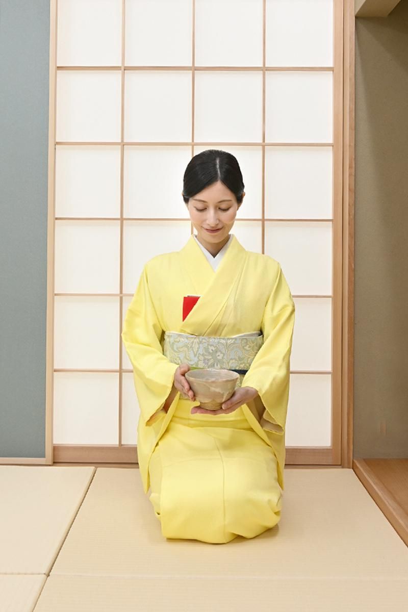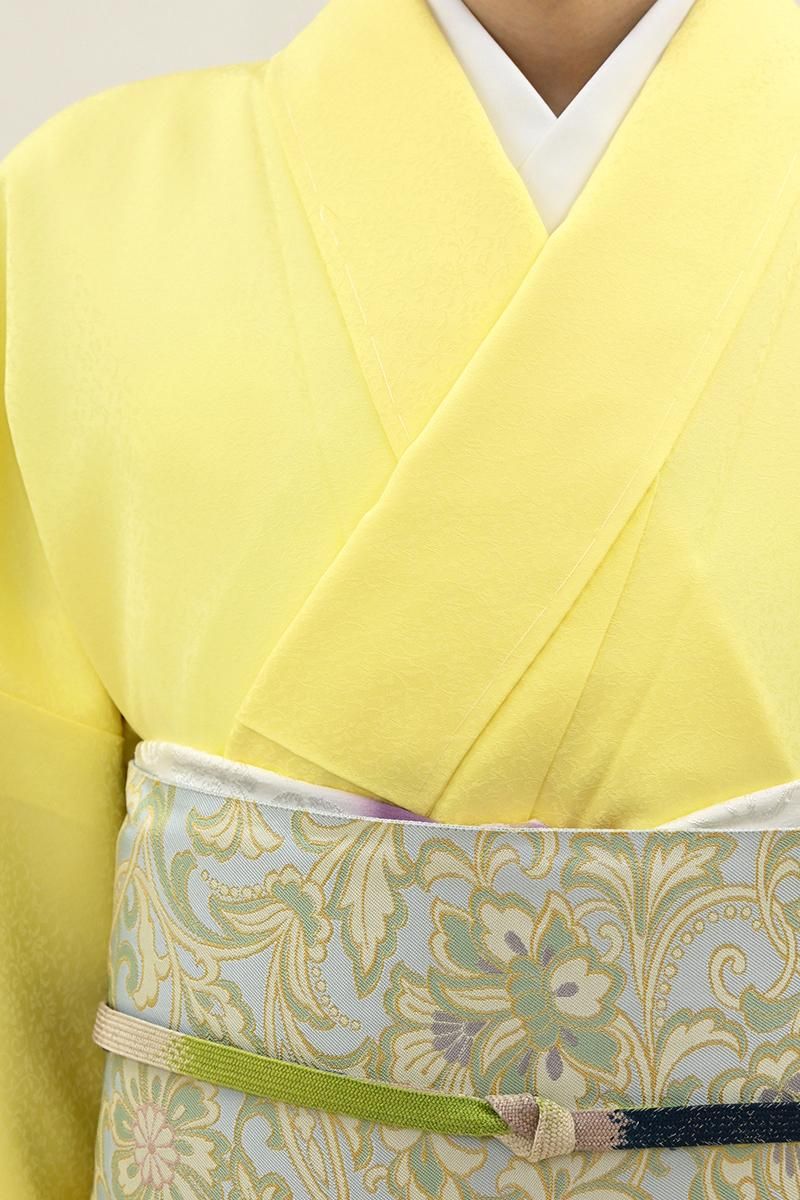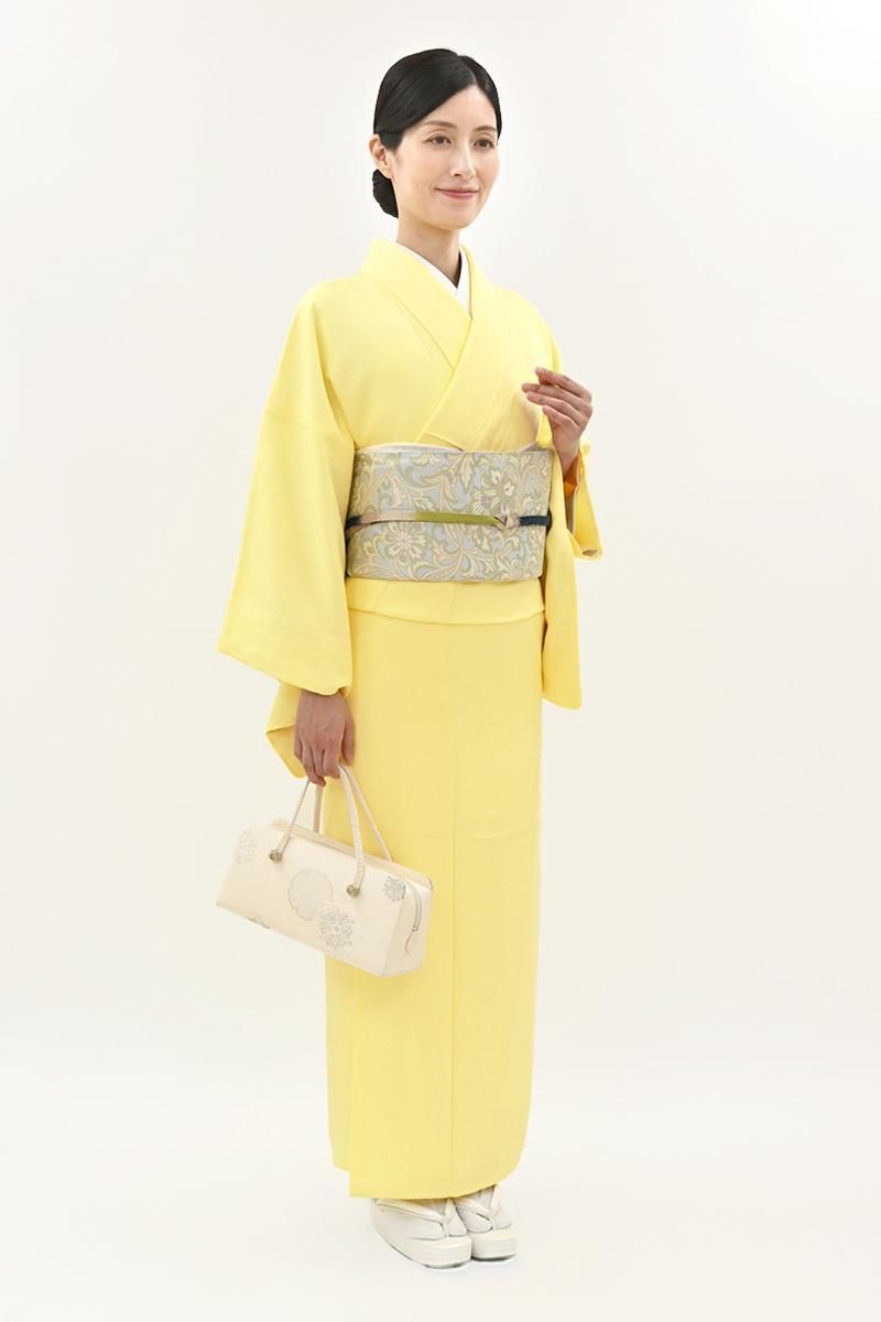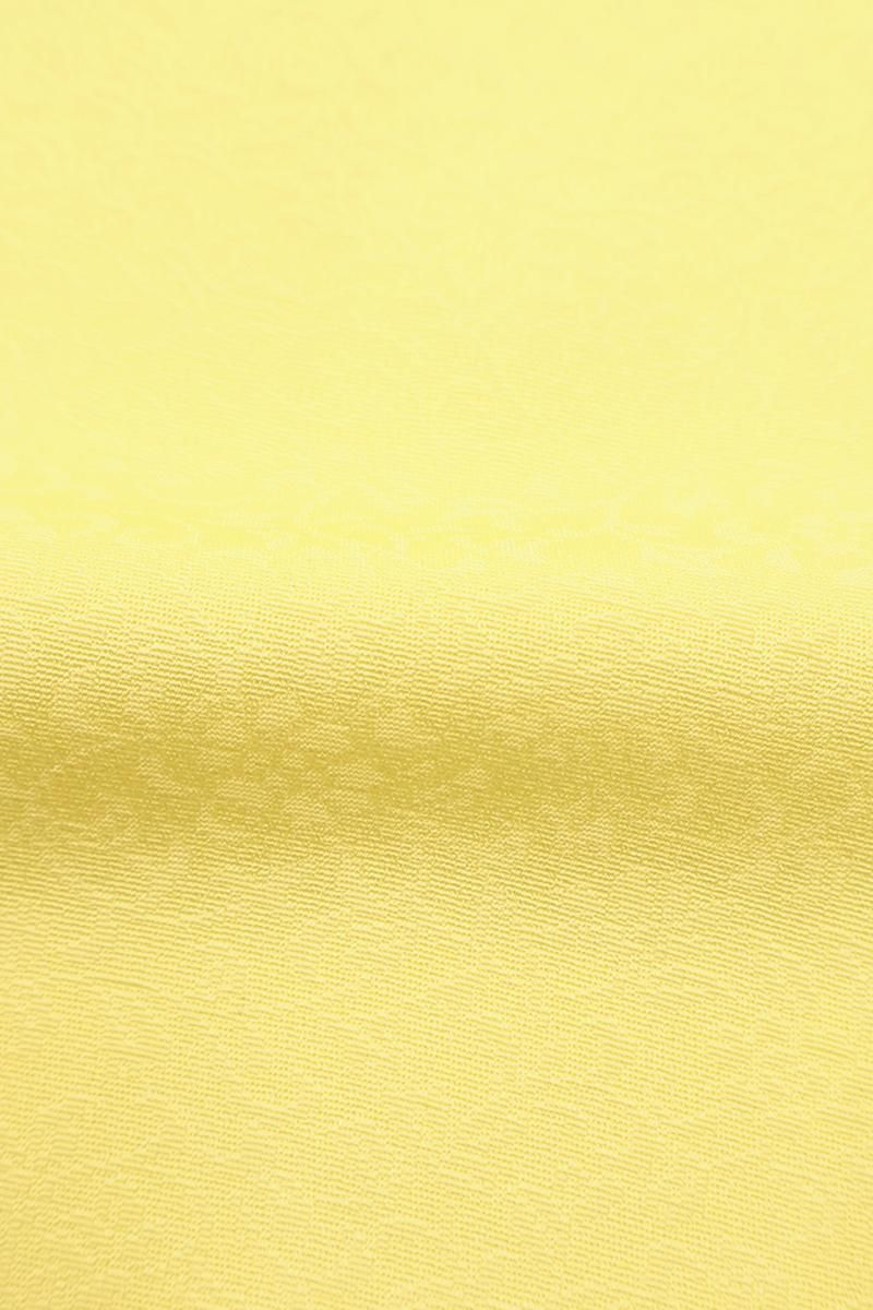 女郎花色が近いでしょうか、明るいレモンイエローの地に牡丹唐草の地紋の浮かぶ色無地です。柔らかな光沢を帯びた地風が品良い華やぎを感じさせるお品、優美なお色目は肌映りも良く、ぱっと目を惹く爽やかな装いをお楽しみいただけることと思います。紋は入っておりませんので、帯合わせ次第で街着から少し改まったお席まで幅広い場面でお使いいただけることと思います。この機会にいかがでしょうか。