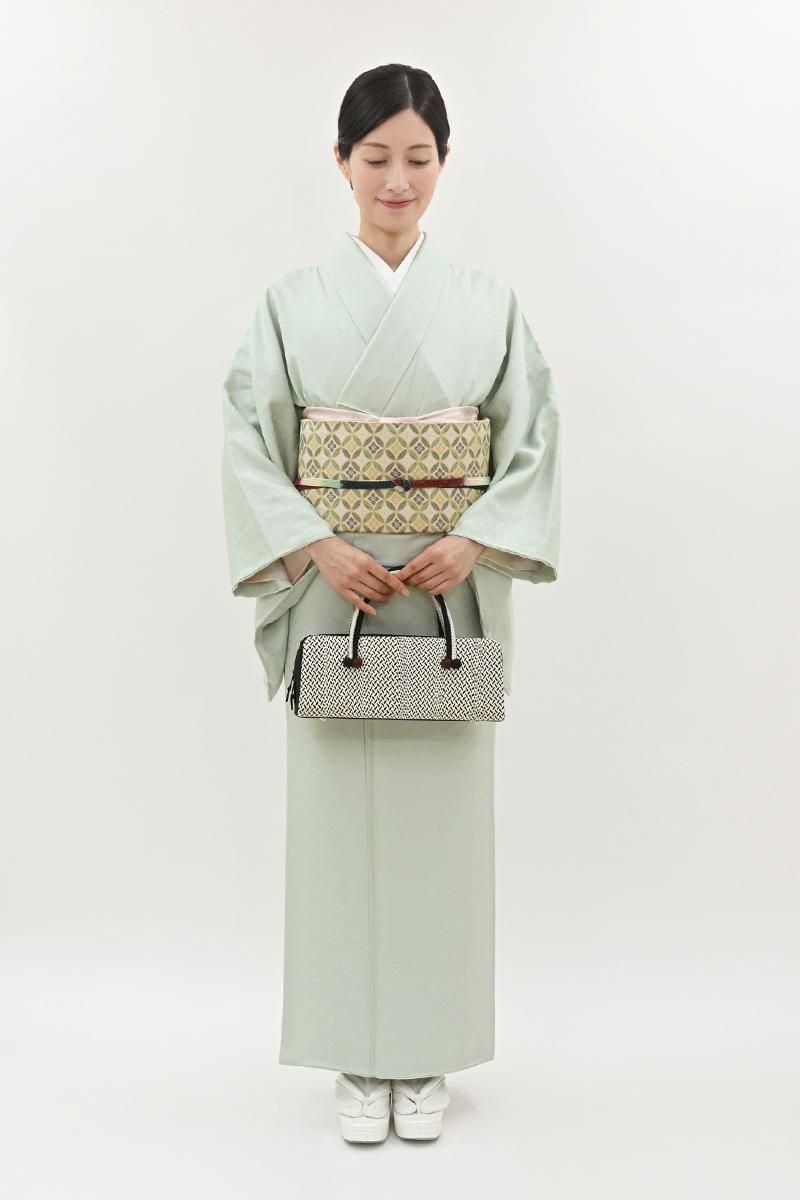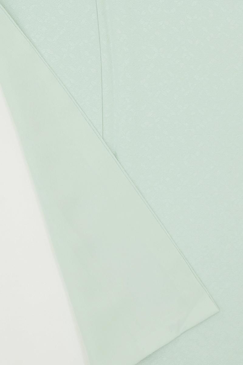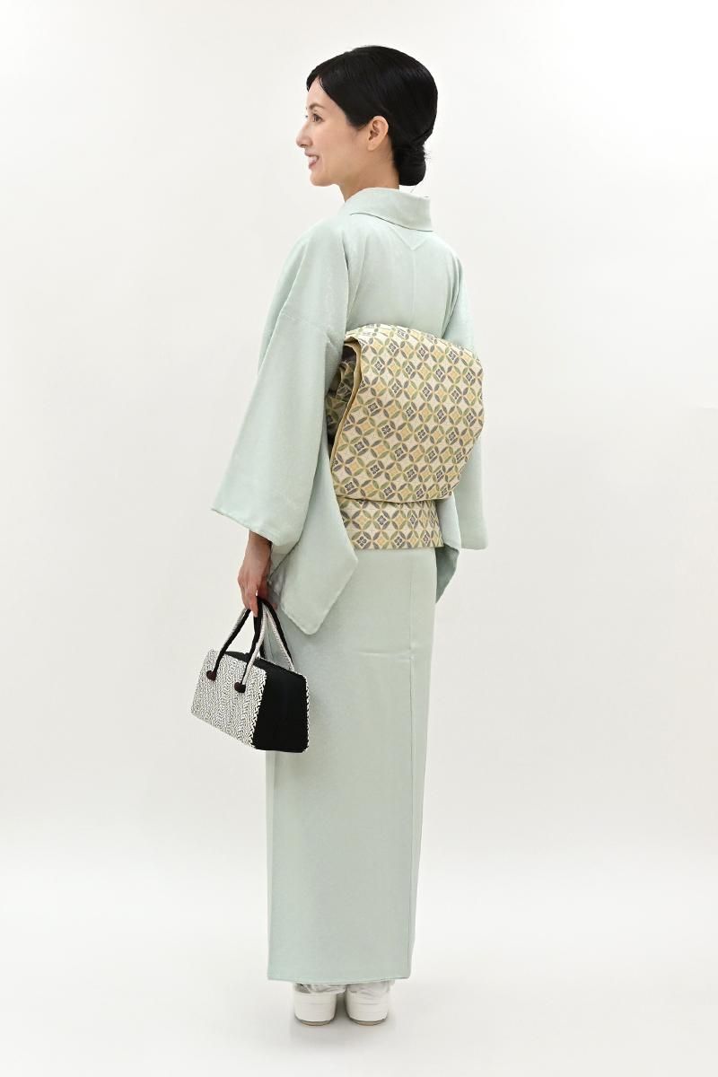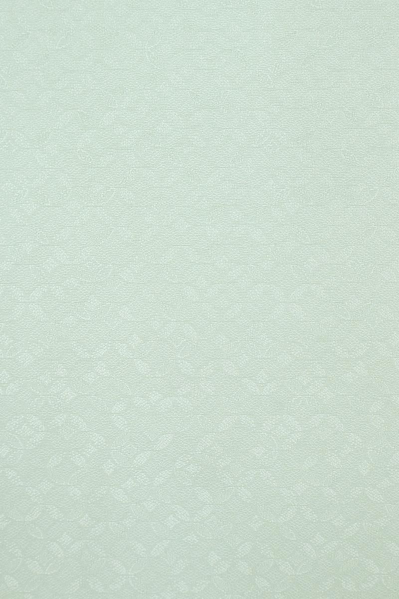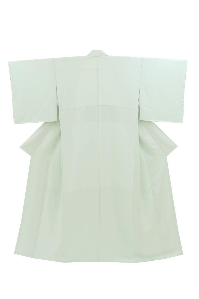 やや色を薄めた水縹色が近いでしょうか、ほんのり緑みを帯びた淡い水色系の地に七宝の地紋が浮かぶ色無地です。柔らかな光沢を帯びた地風に気品が香る一枚、爽やかなお色目は大人の女性らしい優し気な表情を引き立ててくれそうですね。紋は入っておりませんので、合わせる帯によって様々な場面で重宝にお召し頂けることと思います。季節の染め帯から織名古屋、袋帯など幅広い帯合わせで優雅な装いをお楽しみくださいませ。