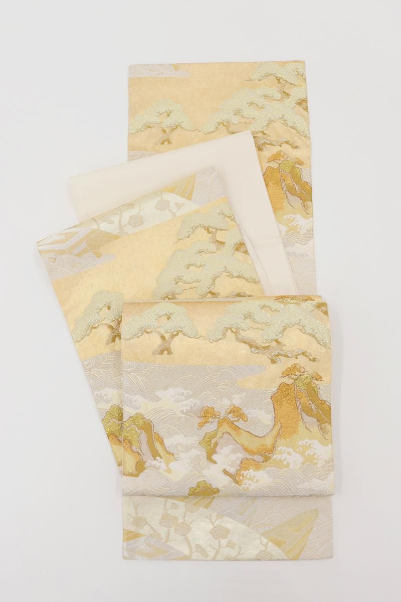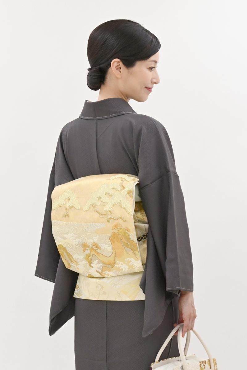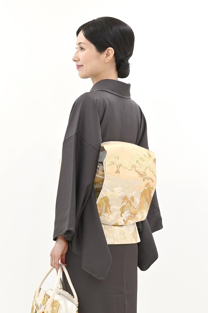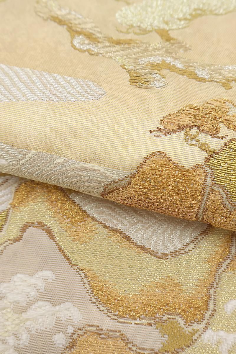 全体の印象としては薄香色が近いでしょうか、淡いベージュの地に、波や松、船などの海賦文を織りだした袋帯です。金糸を織り込んだやさしいお色目に、躍動感あふれる意匠が奥行きのある表情を創り出すお品、ふっくらとした織りの風合いや金銀糸の煌めきが一層の気品を添え、装いを格調高く引き立ててくれることと思います。紋付色無地や付下げ、訪問着などに合わせて、改まったお出かけやお祝いのお席にいかがでしょうか。