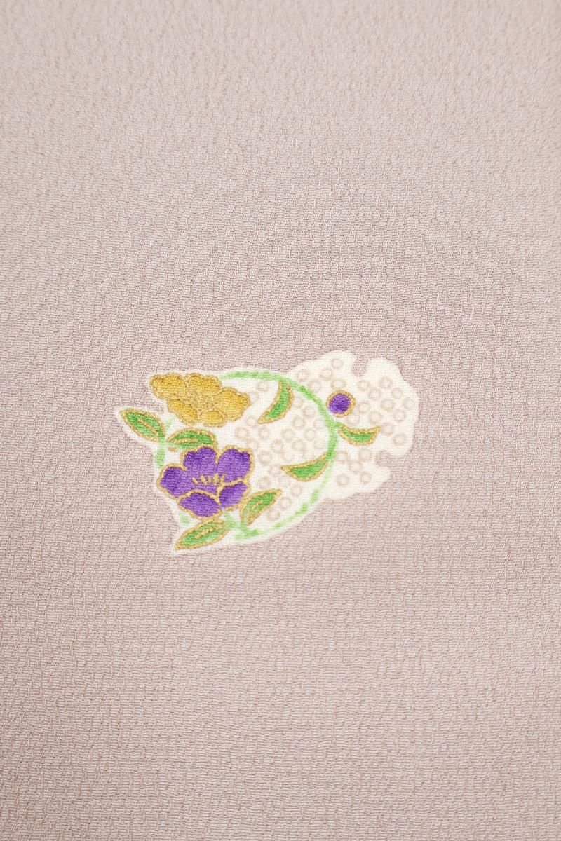 明度を上げた薄色が近いでしょうか、紫みのグレーの地に、雪輪に花の丸を描いた単衣の小紋です。
