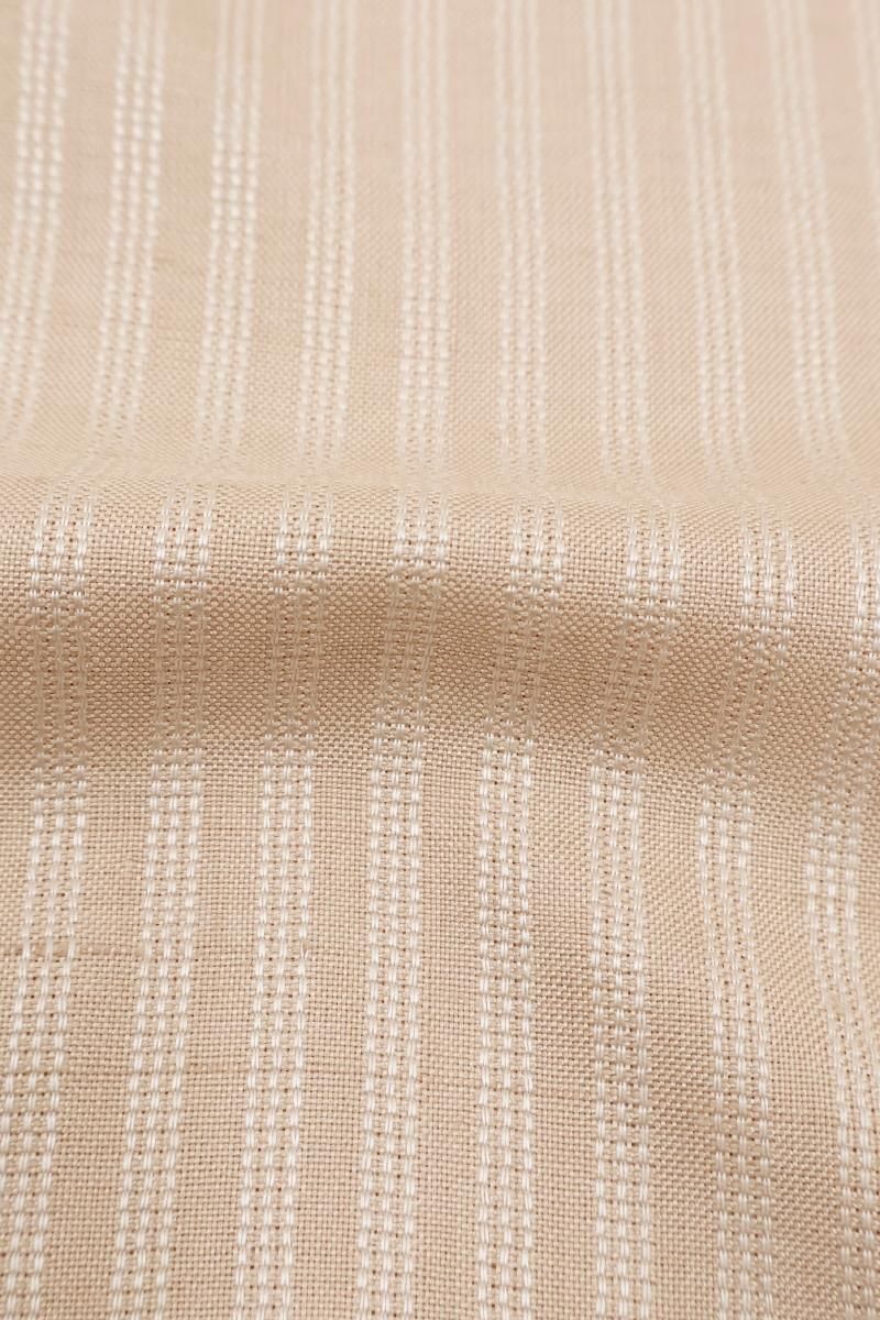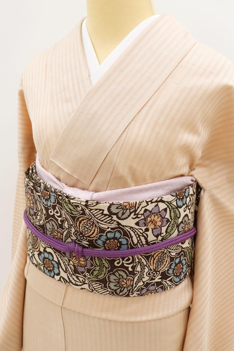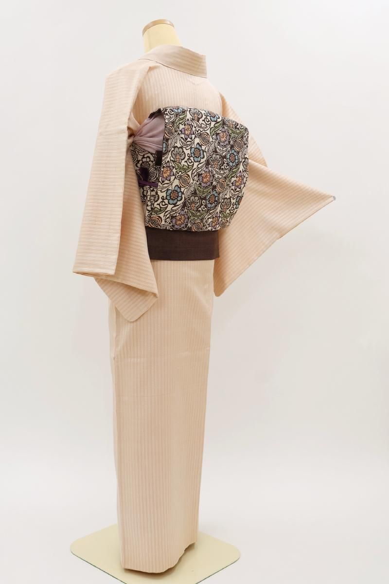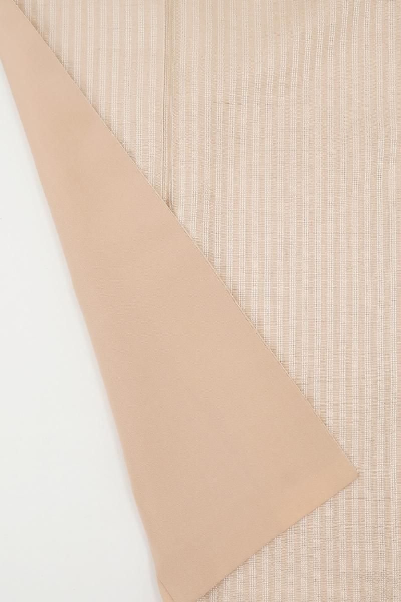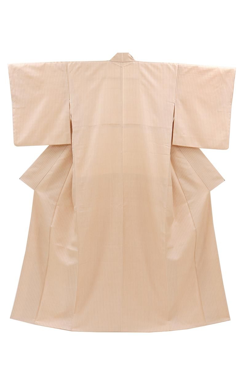 シェルピンク色が近いでしょうか、ピンクベージュの地に竪縞を織りだした紬です。