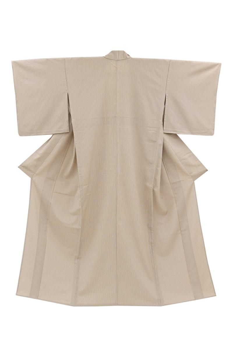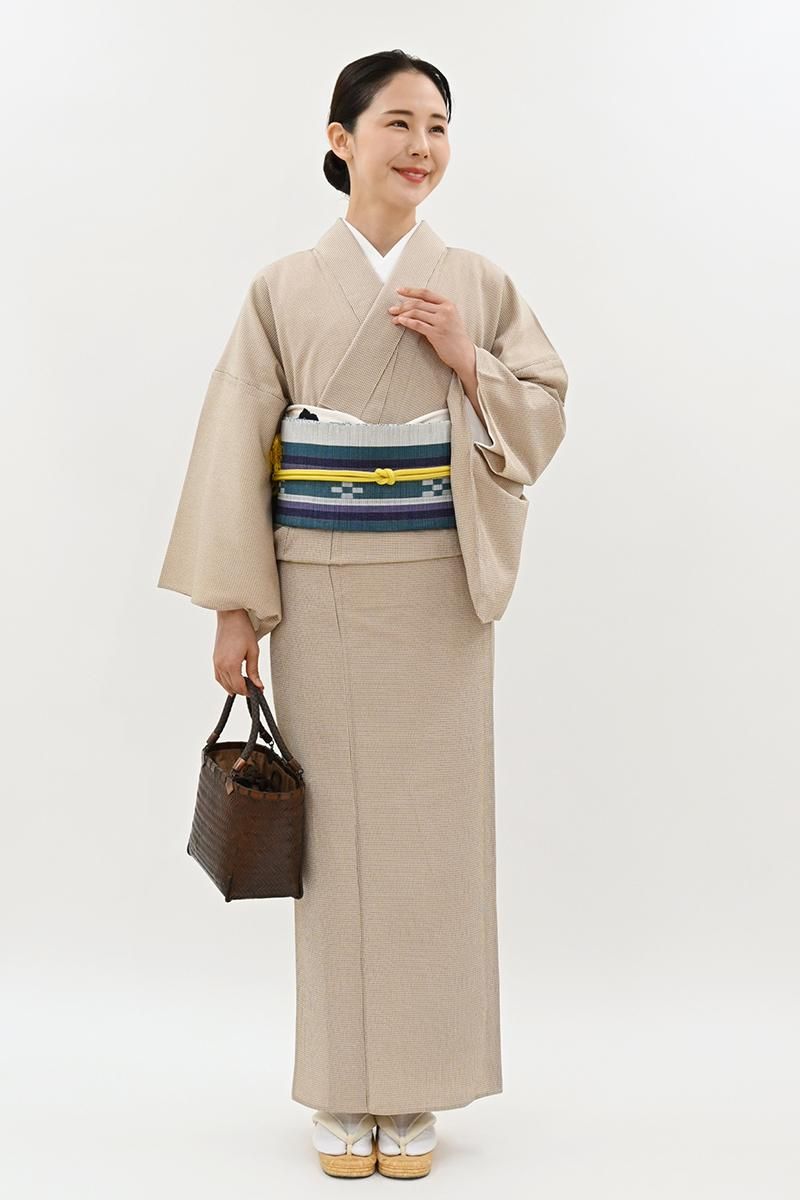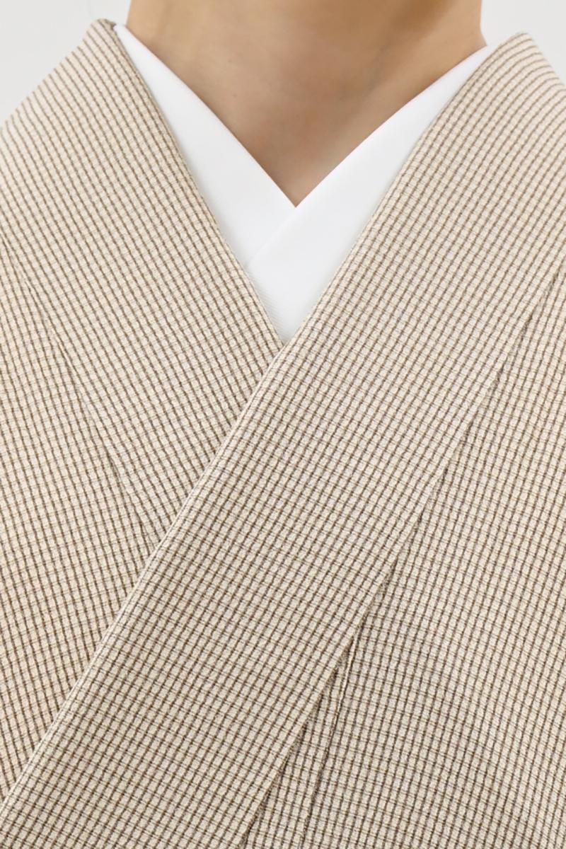 淡いベージュとまろやかな茶色で小格子を織り出した単衣の本塩沢です。