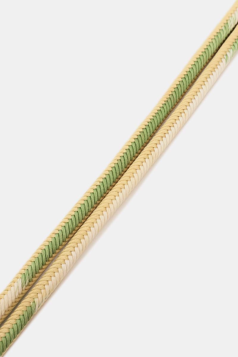 道明さんによれば、奈良組は飛鳥から奈良時代に中国から伝来した組み方で、正倉院の宝物・刀子や楽器、鏡などに付帯する組紐に遺されているとのこと。こちらは灰みの緑色とイエローベージュに白を添わせたお品。しっとりと柔らかな色遣いが装いを気品豊かに引き立ててくれそうですね。帯締めは道明さんでなくては、という方も多いかと思います。きゅっと締まり緩まない、定評ある締め心地をどうぞお楽しみ下さいませ。