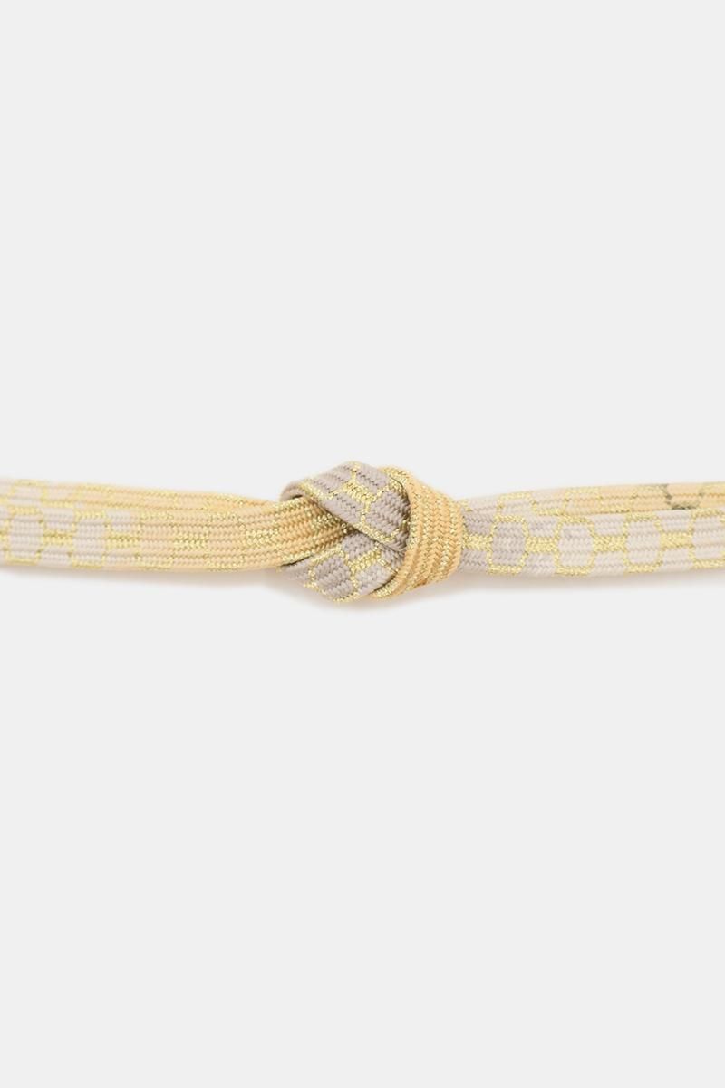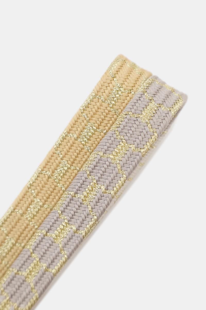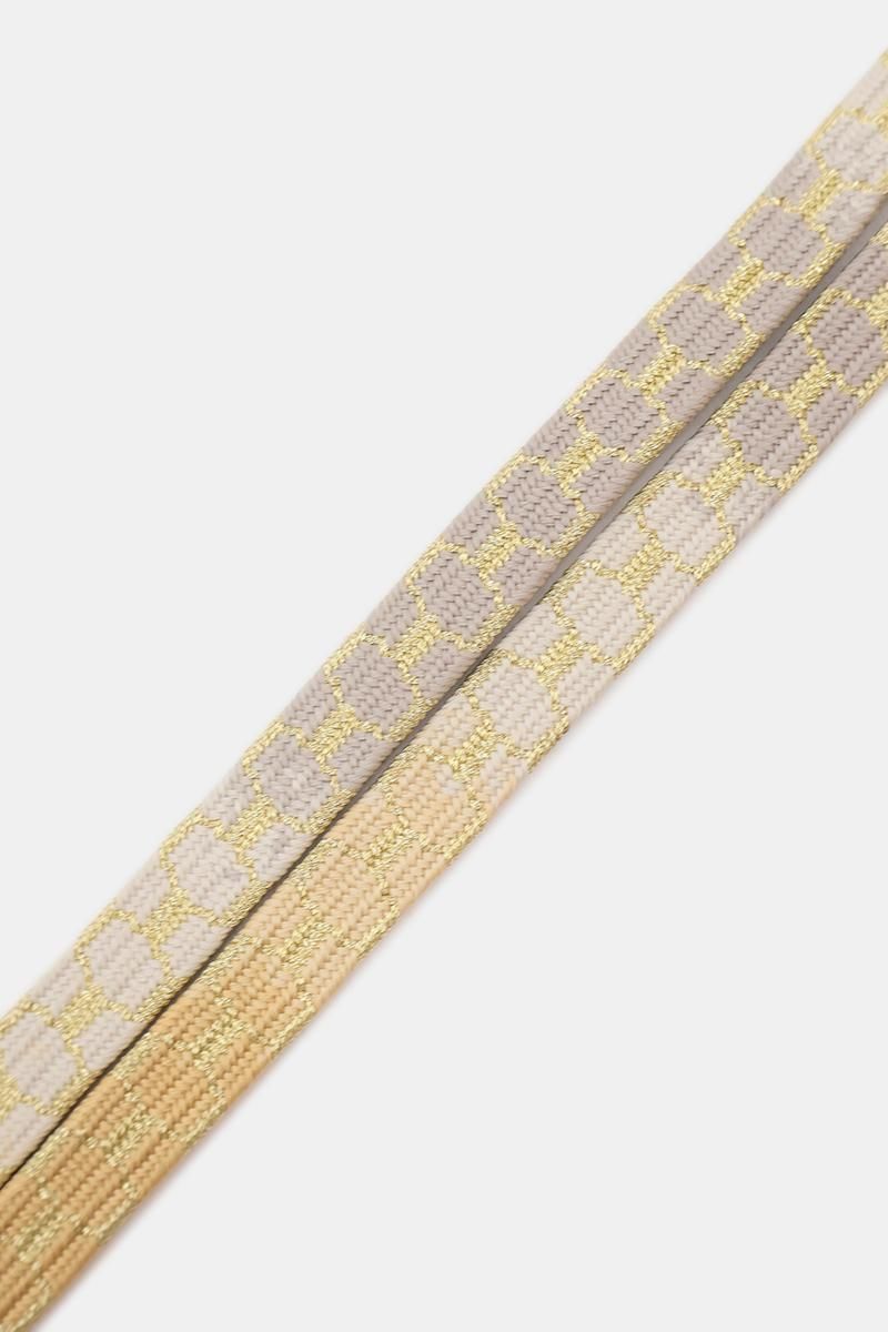 亀甲文様は古くから長寿を象徴する吉祥文様として愛好されています。この組み方は平安時代に完成し、太刀の緒や鎧の緒などに使われてきたとのこと。こちらは淡いオレンジベージュと紫みの淡いグレーに白を挟んだコントラストが美しい暈かしに、金糸の亀甲が組み込まれたお品。上品な華やぎと高い格調を備えており、お祝いのお席などの重厚な装いに美しく映えそうですね。帯締めは道明でなくては、という方も多いかと存じます。きゅっと締まり緩まない、定評ある締め心地をどうぞお楽しみ下さいませ。