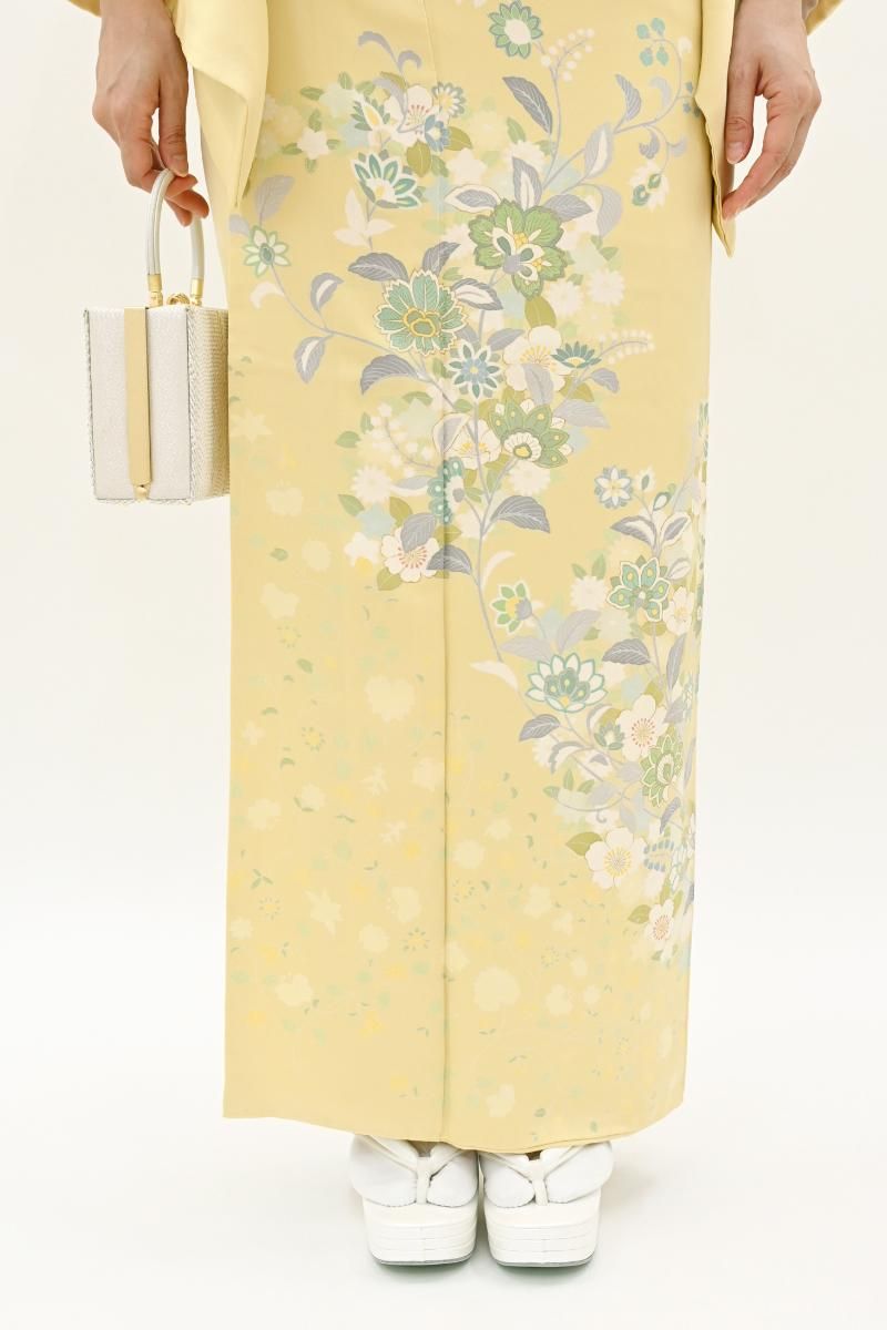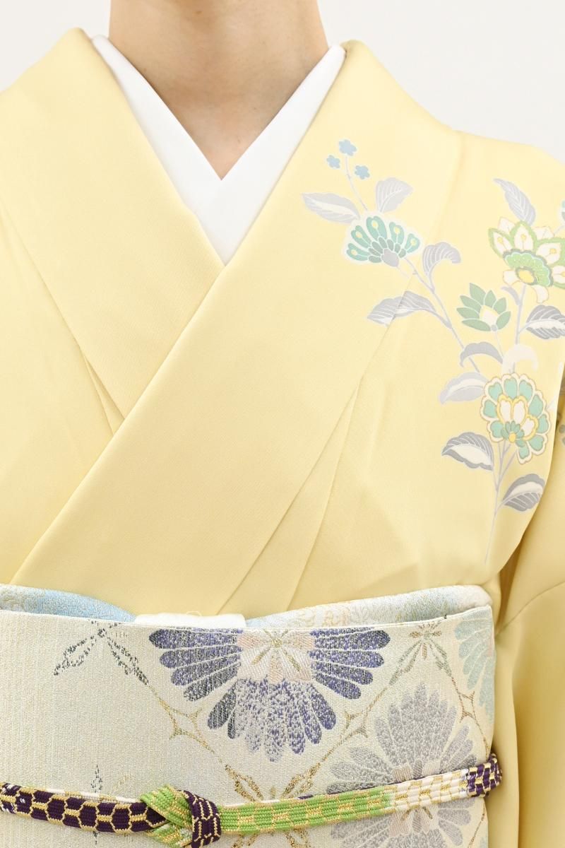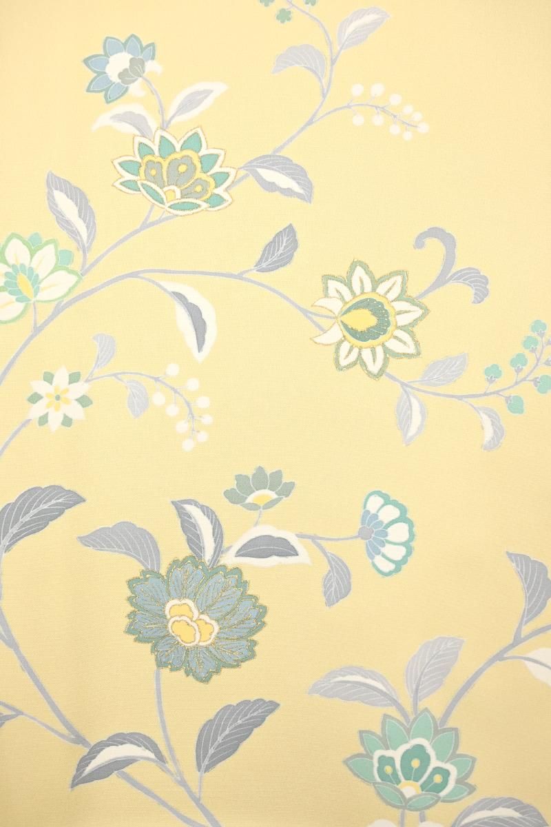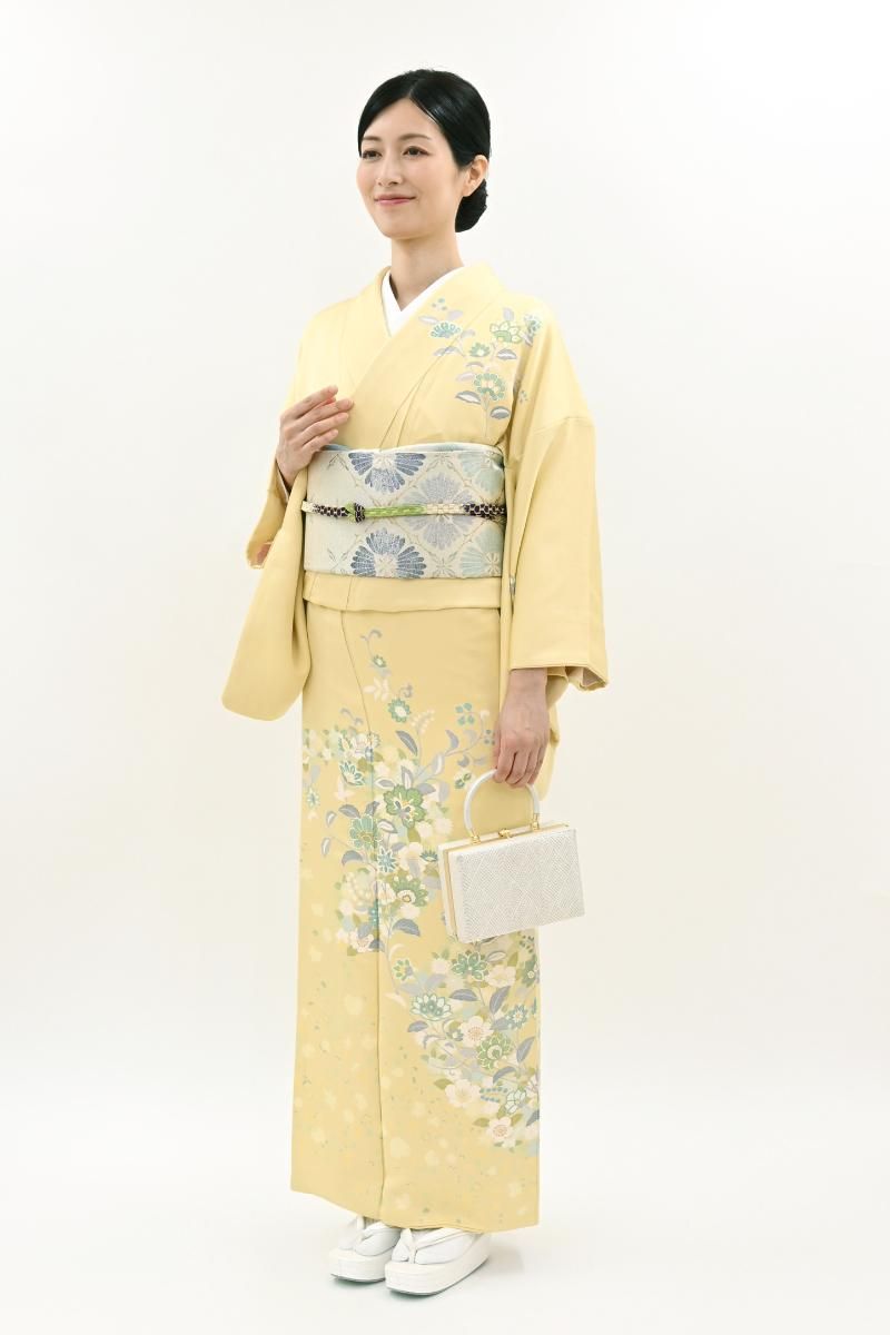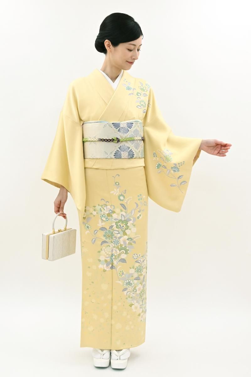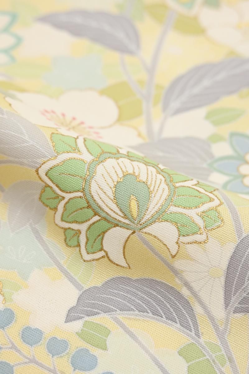 やさしい中間色に、優美な色遣いでゆったりと配されたモチーフが楚々とした雰囲気のお品、装いに大人の愛らしさを添えて、しっとりと引き立ててくれることと思います。金彩の煌めきが一層の華やぎを添えますね。お呼ばれやパーティなどに、好感度の高い装いをお楽しみくださいませ。