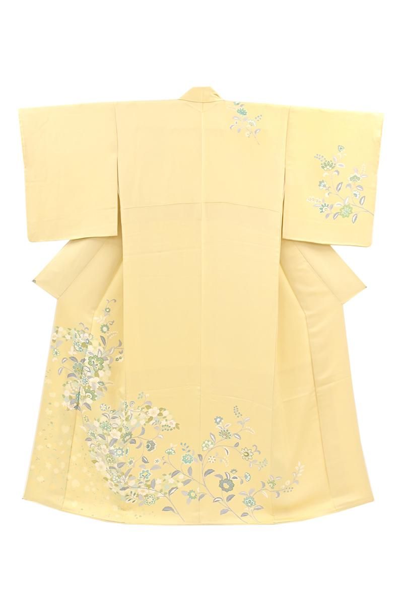 やや明度を上げた蒸栗色が近いでしょうか、淡い黄色の地に、唐花文を描いた訪問着です。