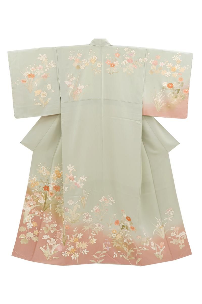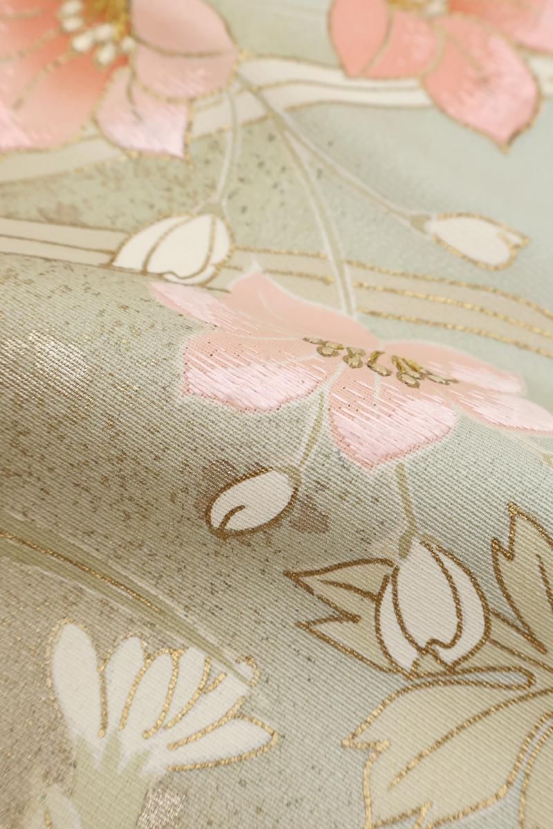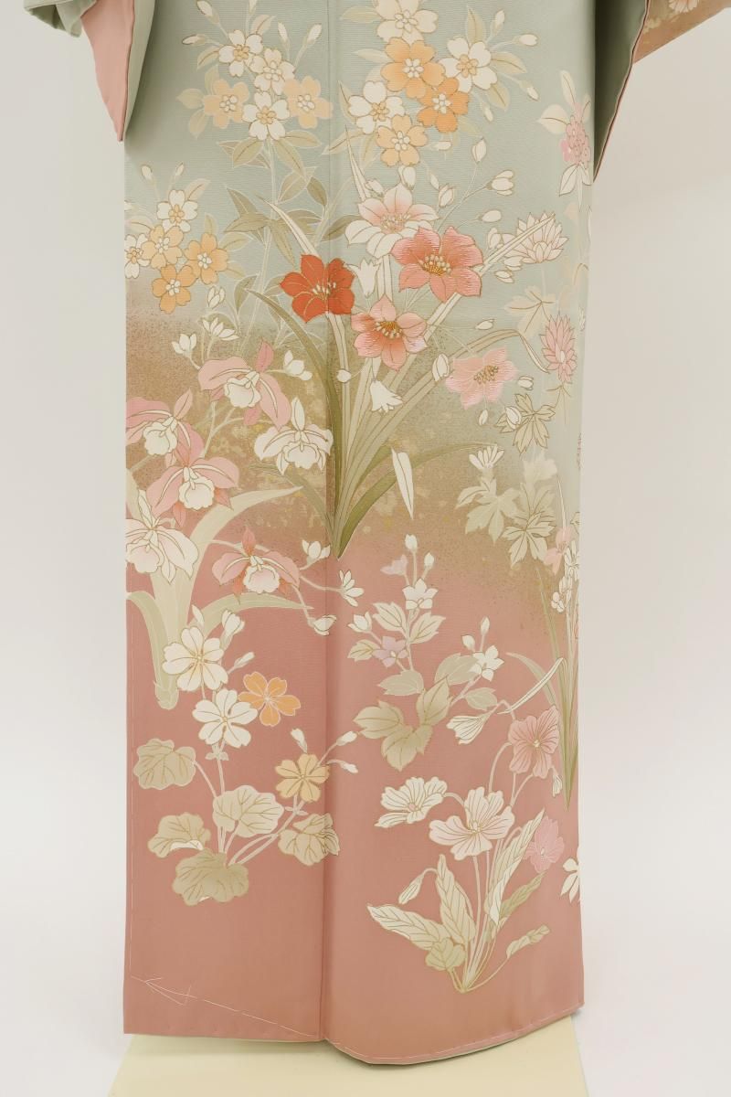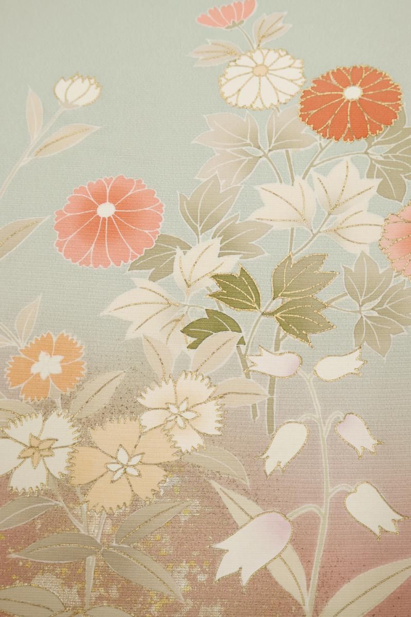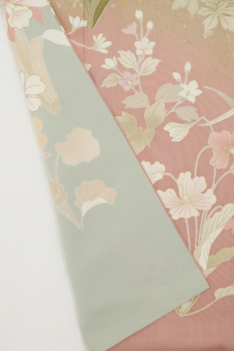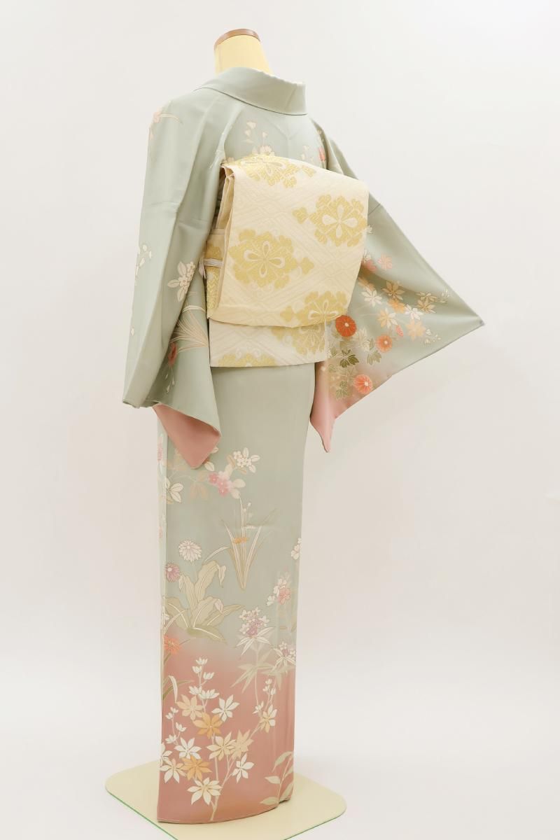 ぐっと色を薄めた裏葉色が近いでしょうか、緑みの淡いグレーの地に灰みのピンク色で暈かしを配し、重ねて四季花を描いた訪問着です。程よく落ち着いたお色目に、優美な色遣いに金彩を添えて表現されたモチーフが楚々とした雰囲気のお品、金彩の煌めきや刺繍の立体感が華やぎを添え、お祝いのお席や改まったお出かけなど、フォーマルな場面での装いを気品豊かに彩ってくれることと思います。ぜひこの機会にいかがでしょうか。