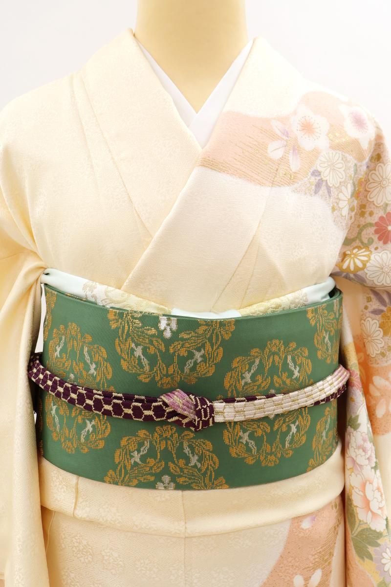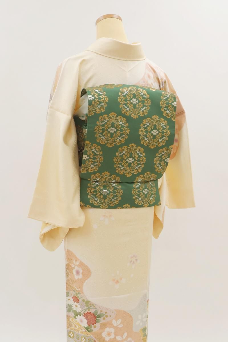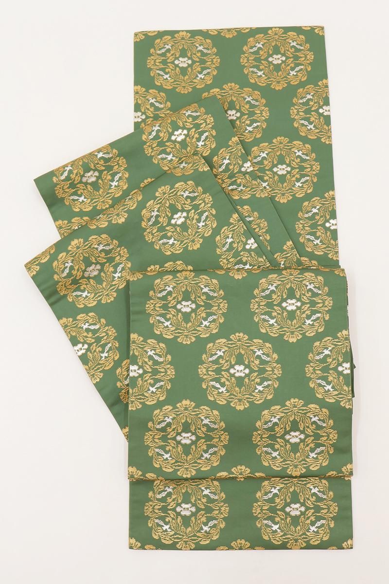 緑青色が近いでしょうか、灰みの青緑系を背景に花葉を緩やかな丸文に置いた、銘「天平花葉丸文錦」です。正倉院に残るモチーフに取材したものでしょうか、流れるような優美なかたちが繊細な平箔の金糸で表現されており、よく見れば四方には尾長鳥の典雅な姿も捉えられますね。精緻な織りによる清々しく端正な景色が、改まったお席の装いを凛と引き立ててくれることと思います。こちらは初代龍村平蔵さんの三男・龍村晋さんの作。父平蔵さんの下で学び培った技術や感性を基に、芸術性のみならず実用性も考えられた帯としてこの方が制作した「傳匠名錦」シリーズは龍村の名に相応しく、どのような場面にも安心してお使いいただける確かな風格を備えた名品です。ぜひこの機会にお手にとってご覧くださいませ。