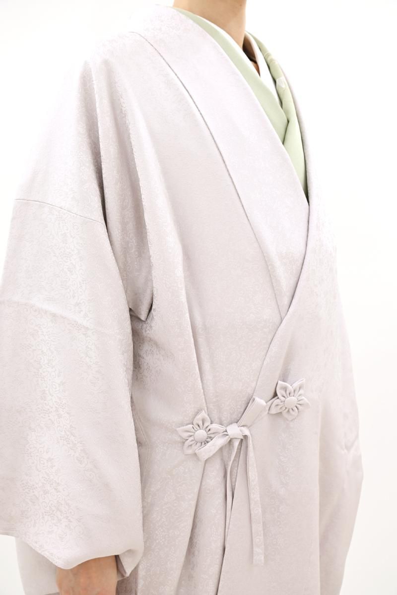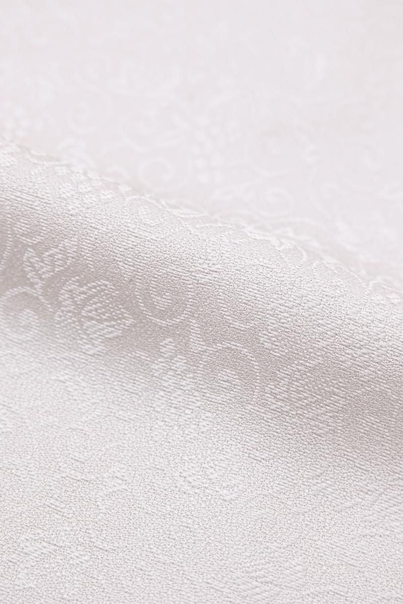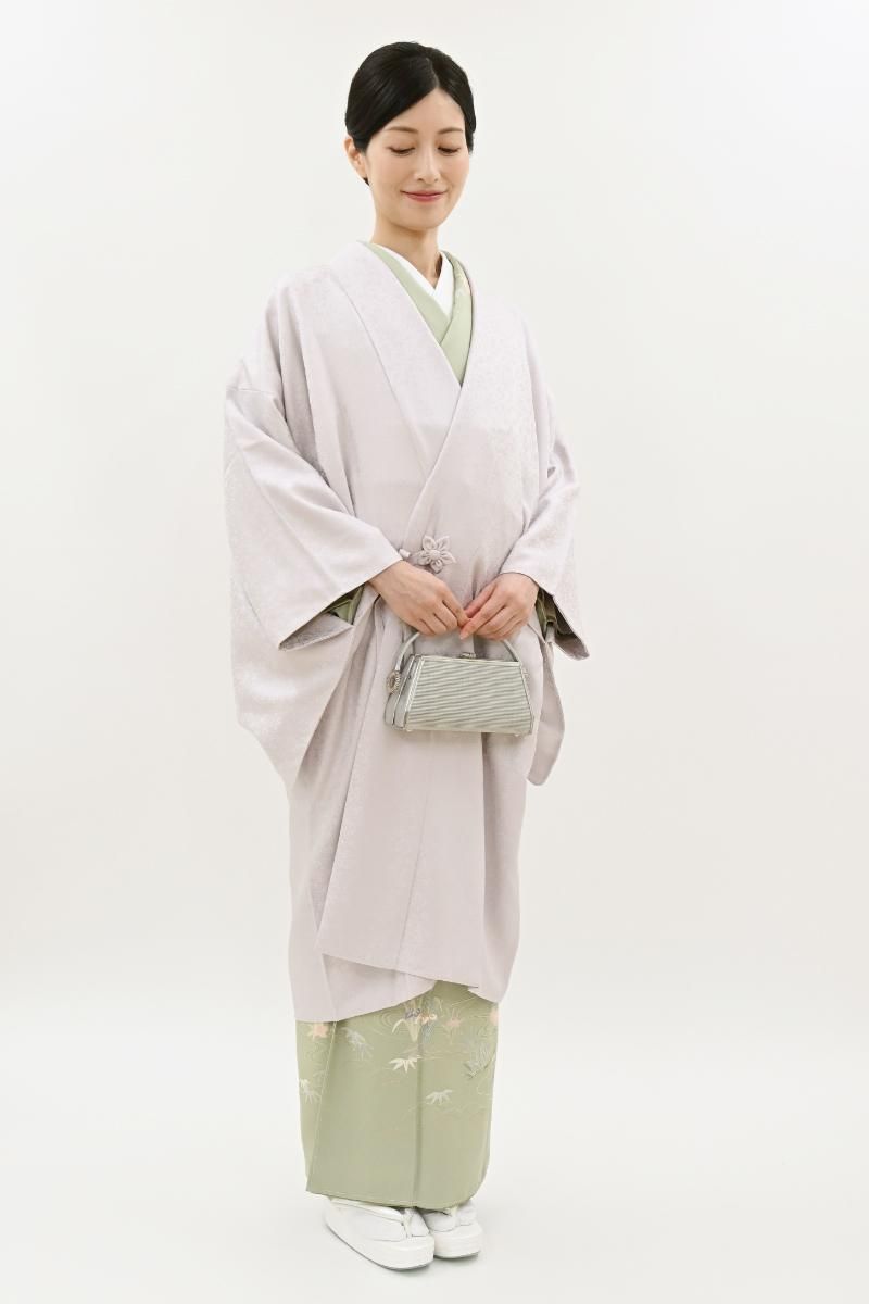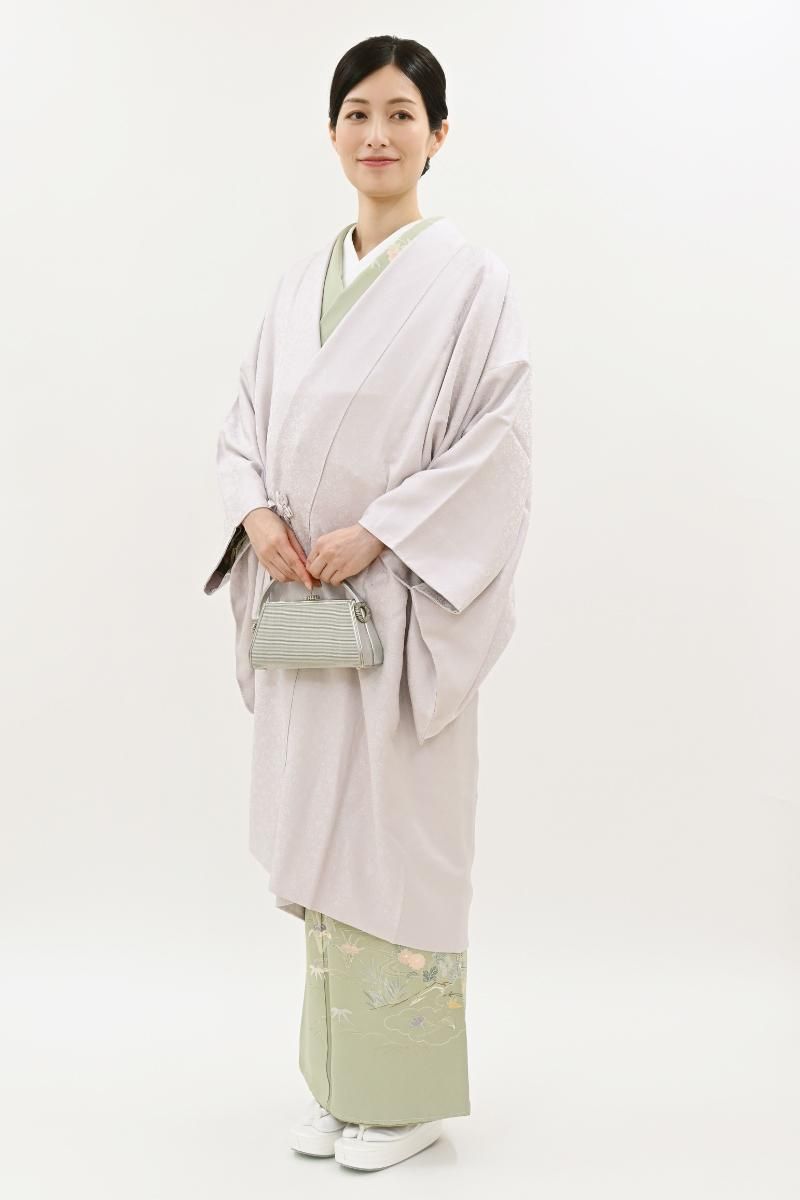 色を薄めたライラック色が近いでしょうか、ほんのり灰みを帯びた淡い薄紫色の地に、葡萄唐草の地紋が浮かぶ道中着です。穏やかな光沢と共に浮かび上がるお柄がエレガントな表情を見せる一枚、女性らしい甘さの薫るお色目が着姿に上品な華を添えて引き立ててくれそうですね。防寒や塵除けとしてはもちろん、装いのアクセントとしても活躍してくれることと思います。この機会にいかがでしょうか。
