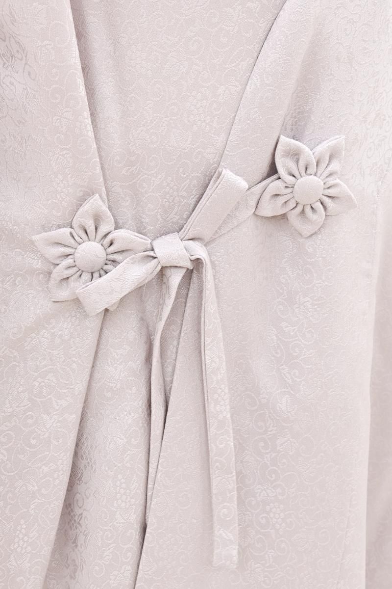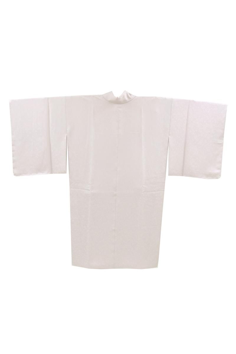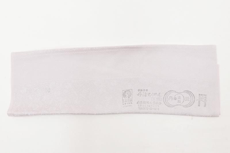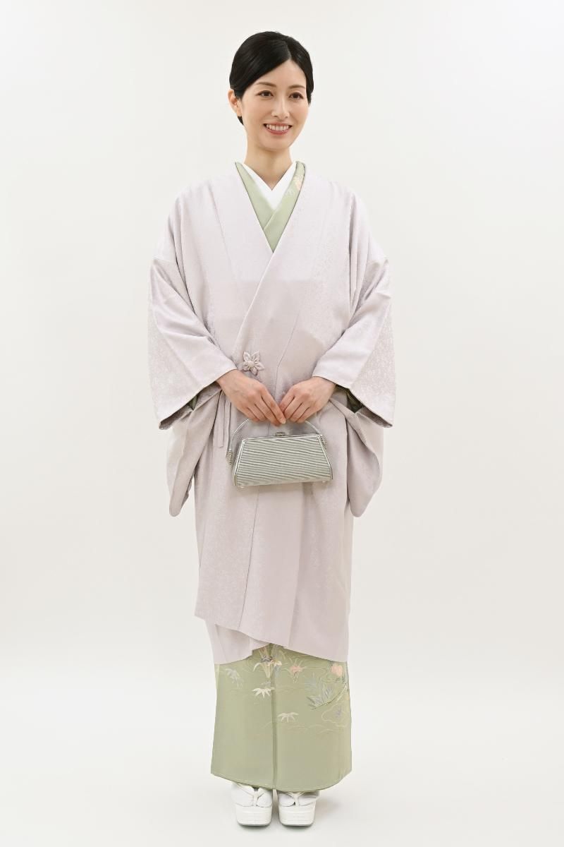 色を薄めたライラック色が近いでしょうか、ほんのり灰みを帯びた淡い薄紫色の地に、葡萄唐草の地紋が浮かぶ道中着です。穏やかな光沢と共に浮かび上がるお柄がエレガントな表情を見せる一枚、女性らしい甘さの薫るお色目が着姿に上品な華を添えて引き立ててくれそうですね。防寒や塵除けとしてはもちろん、装いのアクセントとしても活躍してくれることと思います。この機会にいかがでしょうか。