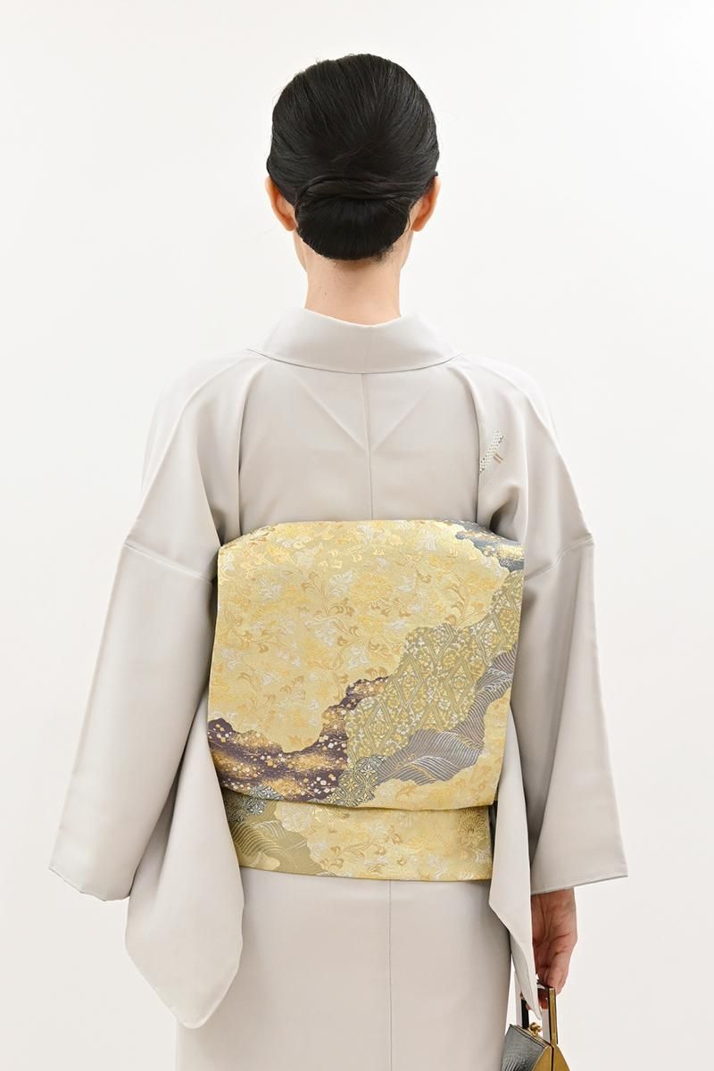 全体の印象としては金色でしょうか、明るい金色の地に、ゆったりとした道長取りに牡丹唐草や切り箔などを織り出した袋帯です。金糸をたっぷりと用いた典雅な彩りが格調高い一品、どのような場面でも安心してお使いいただける正統派古典ならではの気品溢れる表情で、装いを晴れやかに盛り立ててくれることと思います。紋付き色無地や訪問着などに合わせて、改まったお出かけやお祝いのお席にいかがでしょうか。