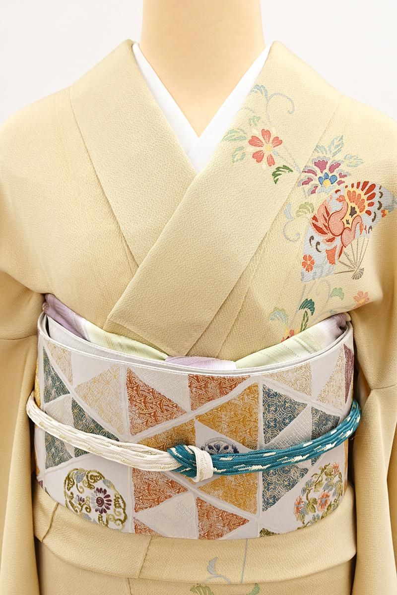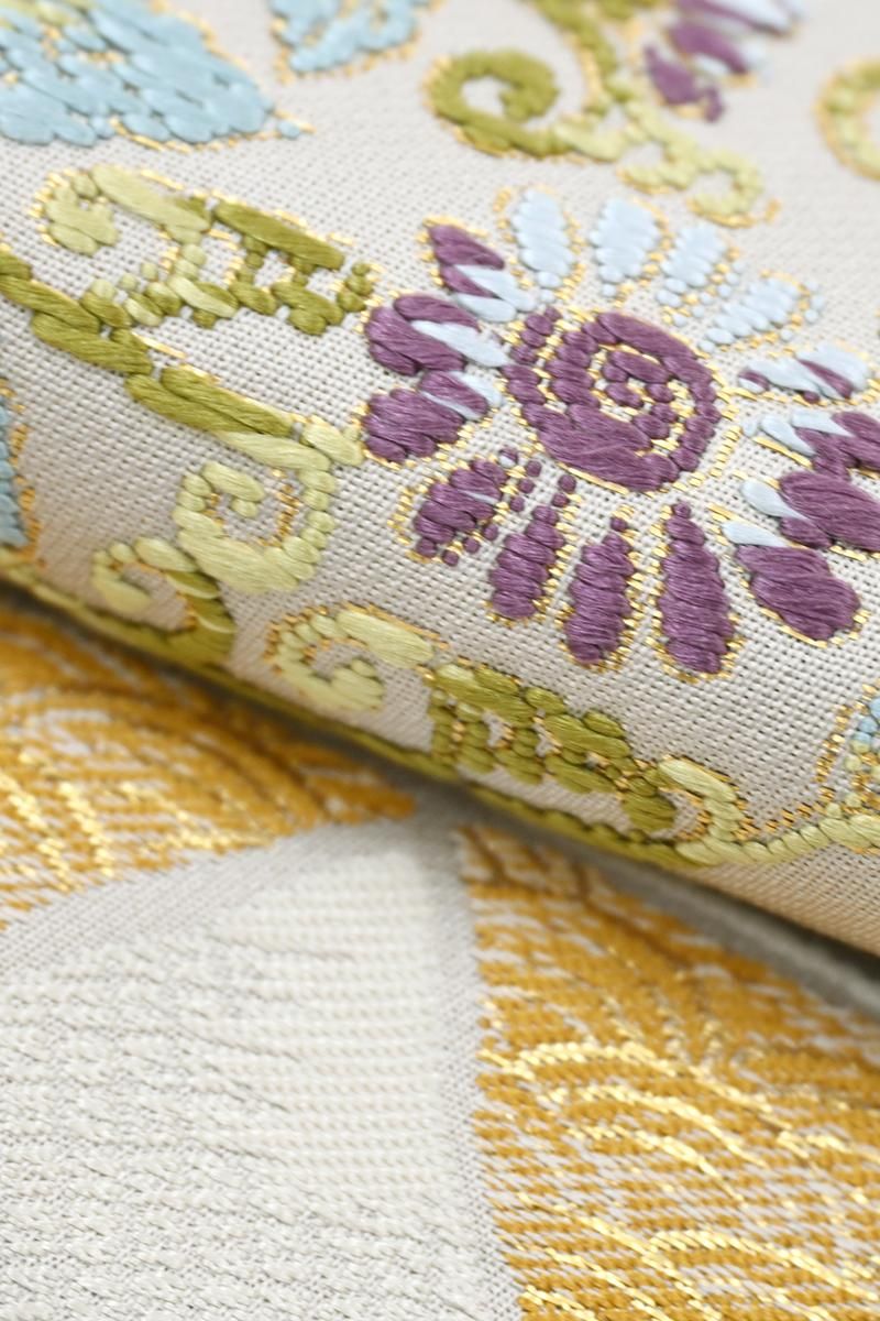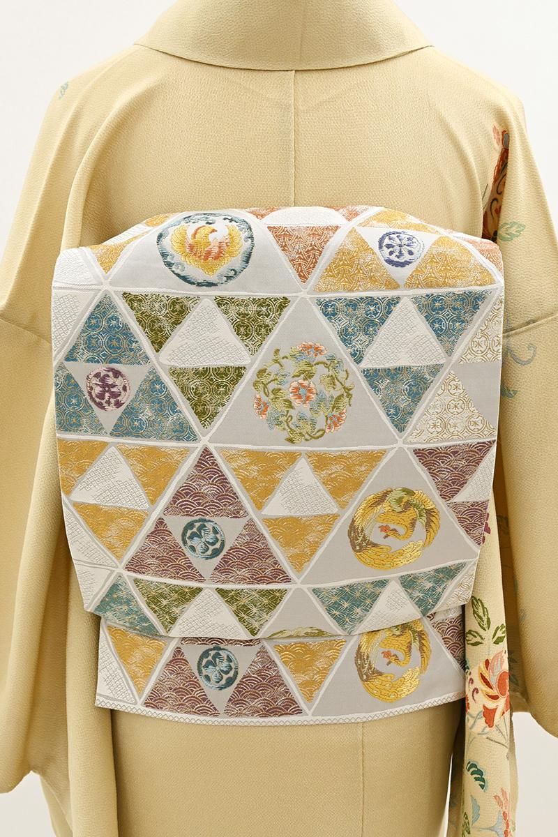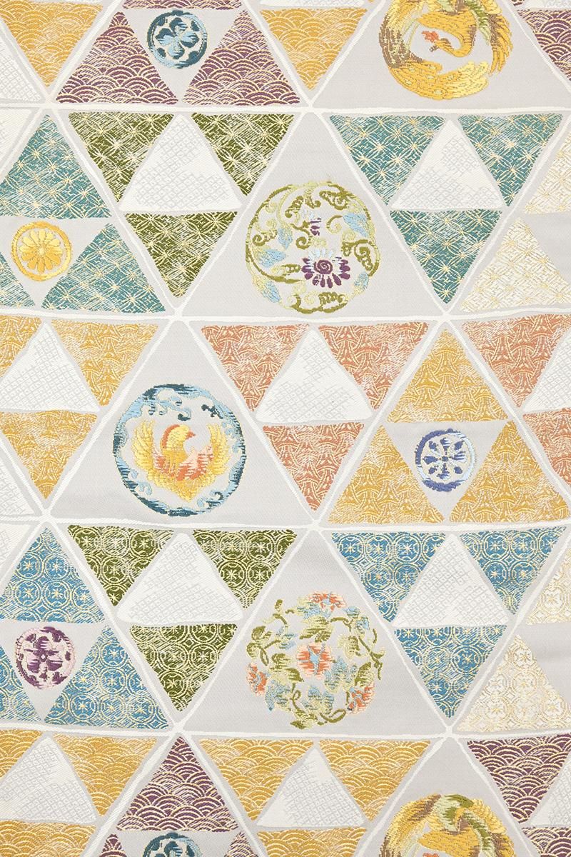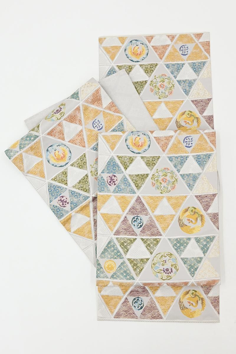 ぐっと色を薄めた桜鼠色が近いでしょうか、淡いグレーの地に、様々な文様を詰めた鱗に鳳凰の丸や花の丸を織り出した袋帯です。こちらはモダンな色遣いで表現された意匠が端正な表情のお品、金糸の煌めきが一層の気品を添え、装いを格調高く引き立ててくれることと思います。正統派の古典文様の帯はお出かけやお呼ばれなど何かと活躍の機会が多いものですね。この機会にいかがでしょうか。