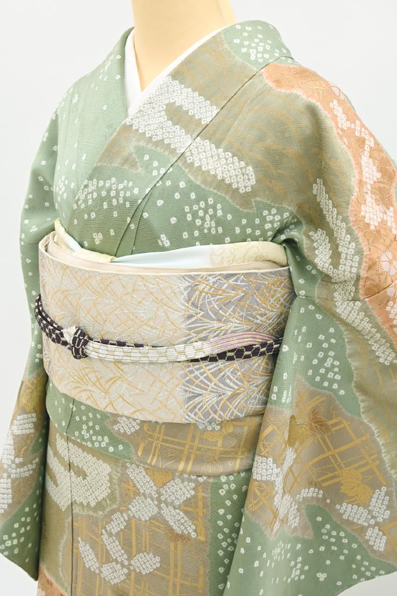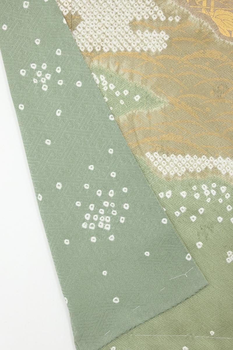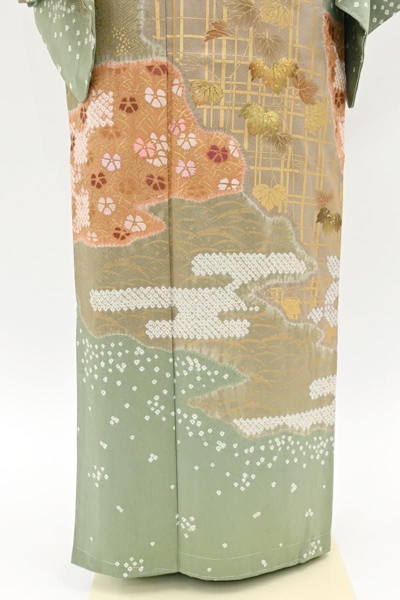 やや黄みを足した裏葉色が近いでしょうか、紗綾形の浮かぶ灰みの薄黄緑系の地に、絞り染めでゆったりとした霞や疋田のヱ霞を配し、金彩で垣根に蔦や露芝、撫子などを表した訪問着です。