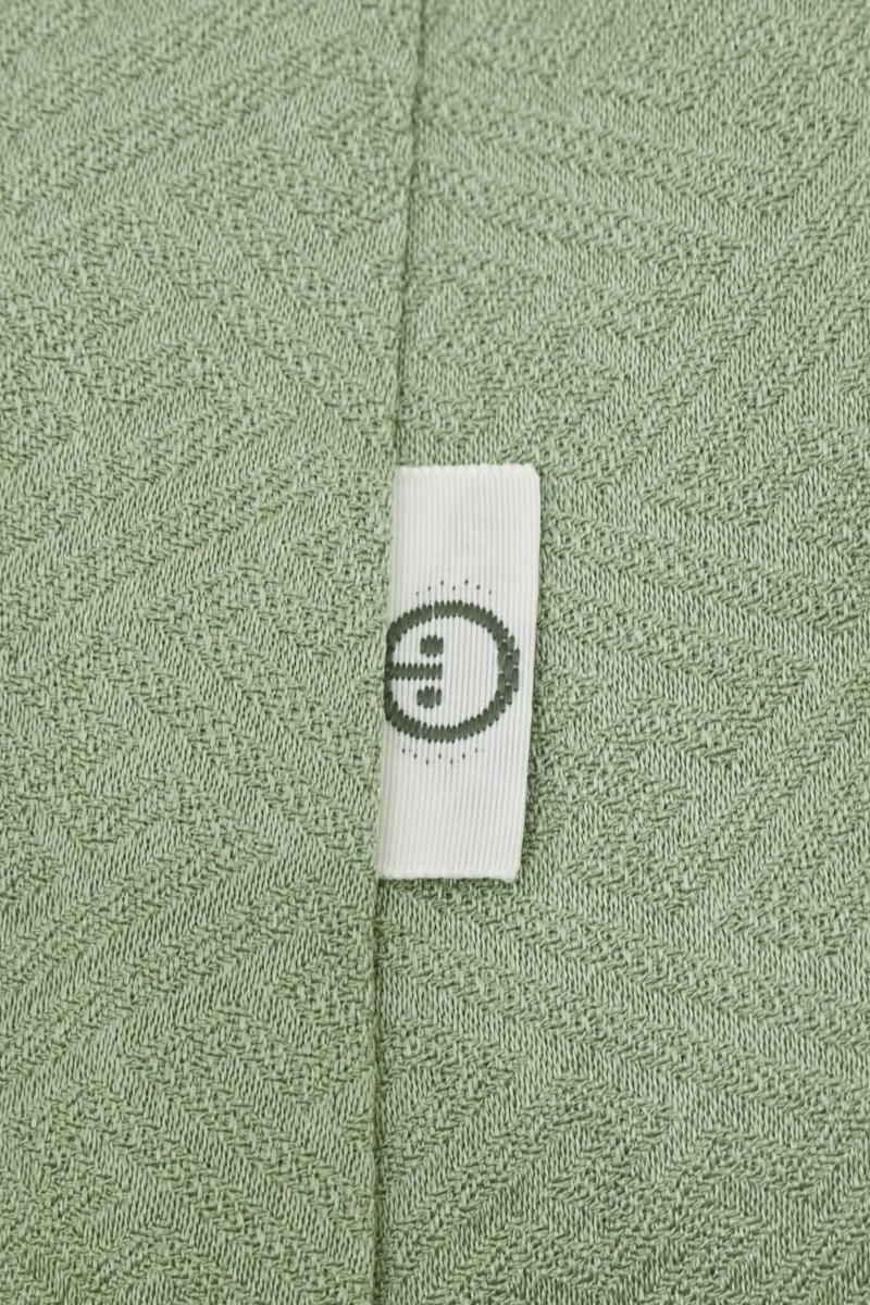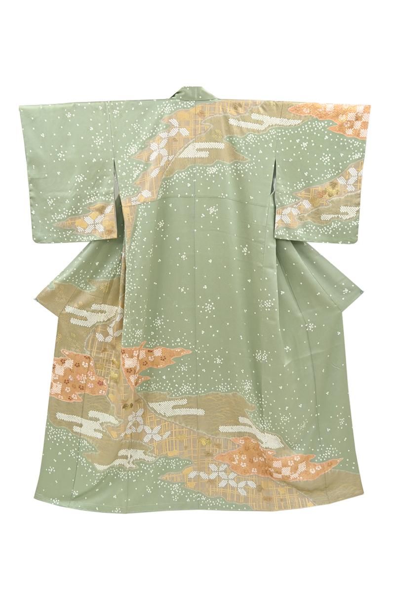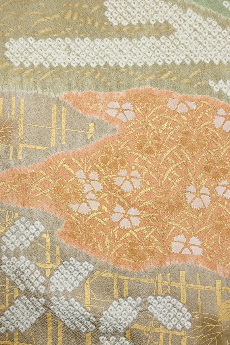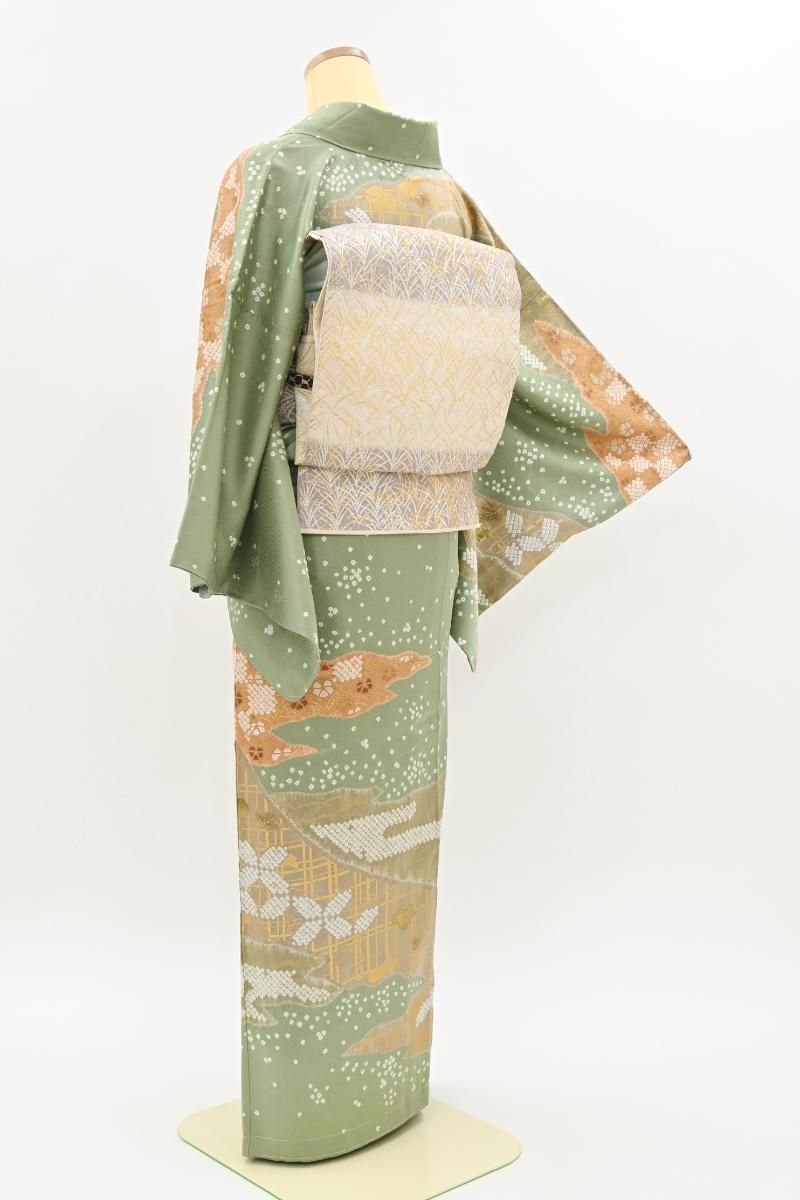 やや黄みを足した裏葉色が近いでしょうか、紗綾形の浮かぶ灰みの薄黄緑系の地に、絞り染めでゆったりとした霞や疋田のヱ霞を配し、金彩で垣根に蔦や露芝、撫子などを表した訪問着です。