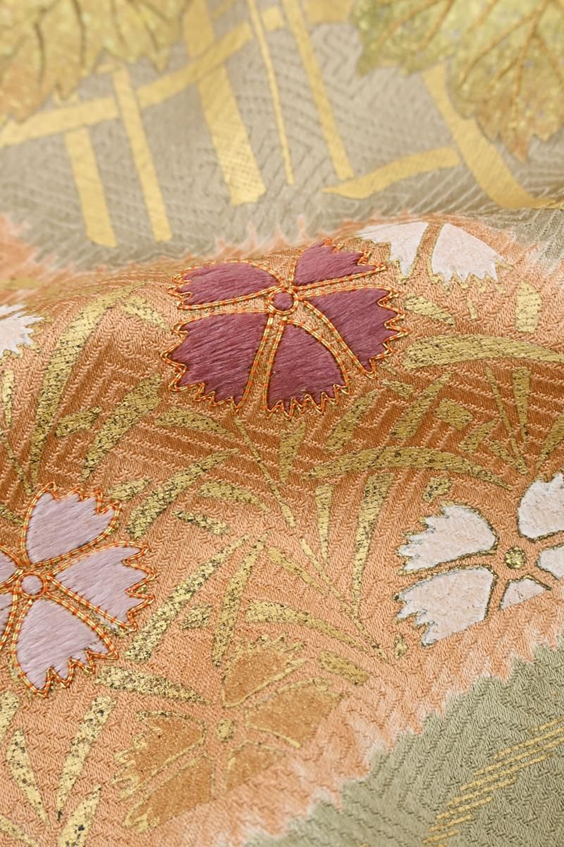 穏やかな光沢を帯びた地風に、優美な彩りに金彩や金糸を添えて表現された古典意匠が華やかに目を惹くお品、存在感たっぷりに晴れの日の装いを盛り立ててくれることと思います。お呼ばれの増えるこれからの季節にいかがでしょうか。