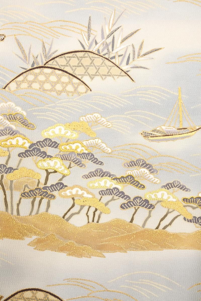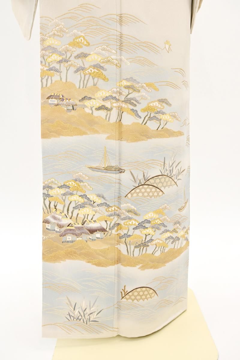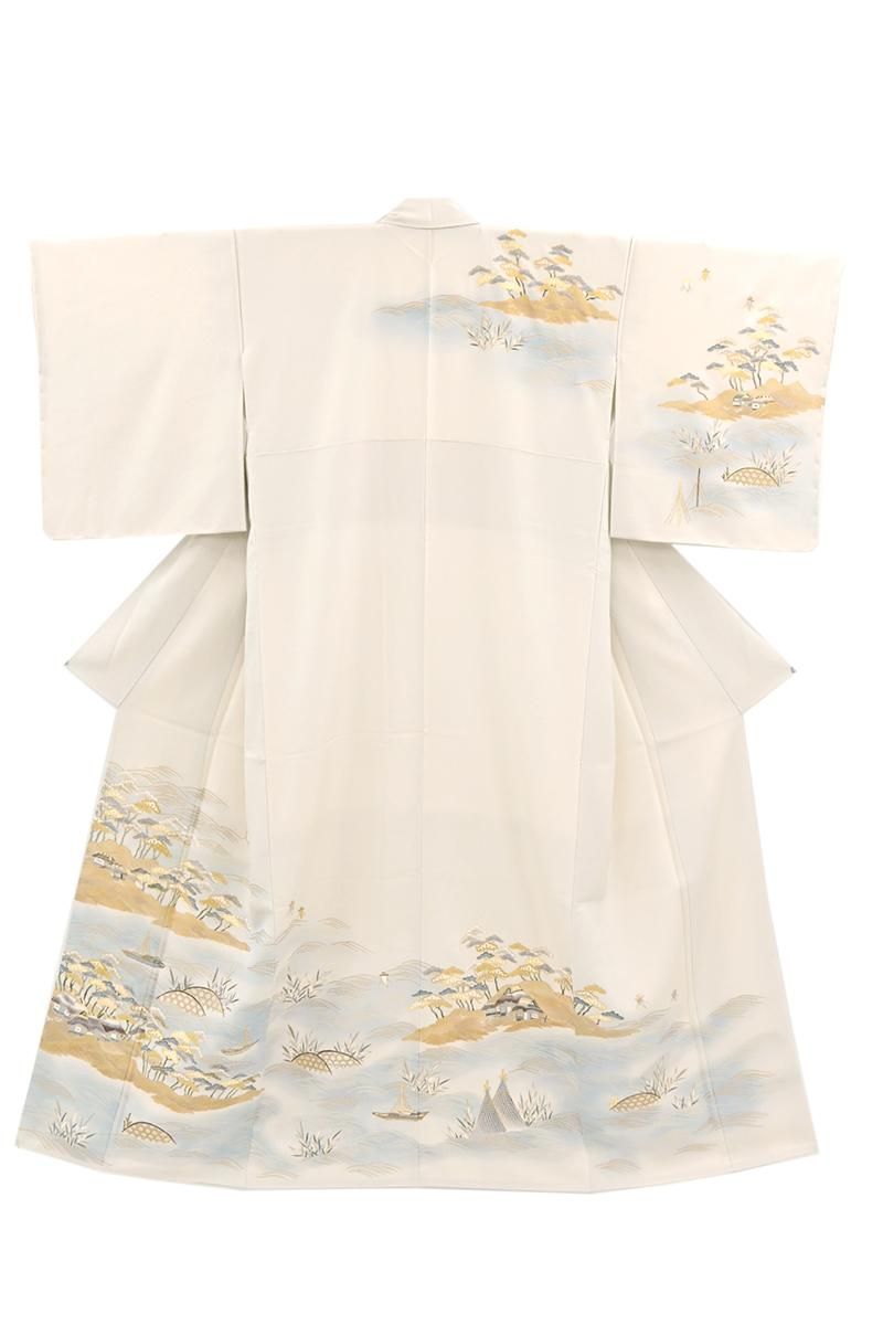 ほのかに灰みを含んだ淡いクリーム色の地に、松の並ぶ浜辺に、苫屋や小舟、蛇篭などを配した訪問着です。