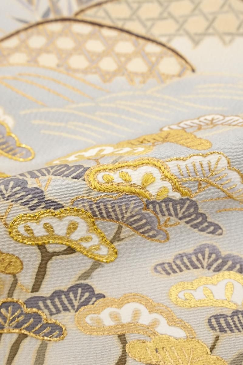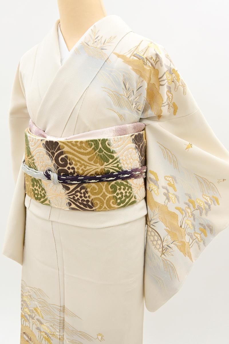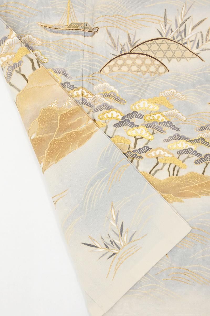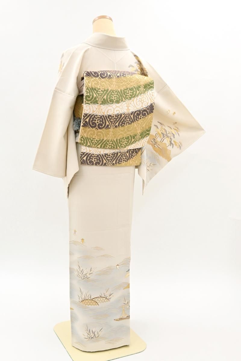 ほのかに灰みを含んだ淡いクリーム色の地に、松の並ぶ浜辺に、苫屋や小舟、蛇篭などを配した訪問着です。