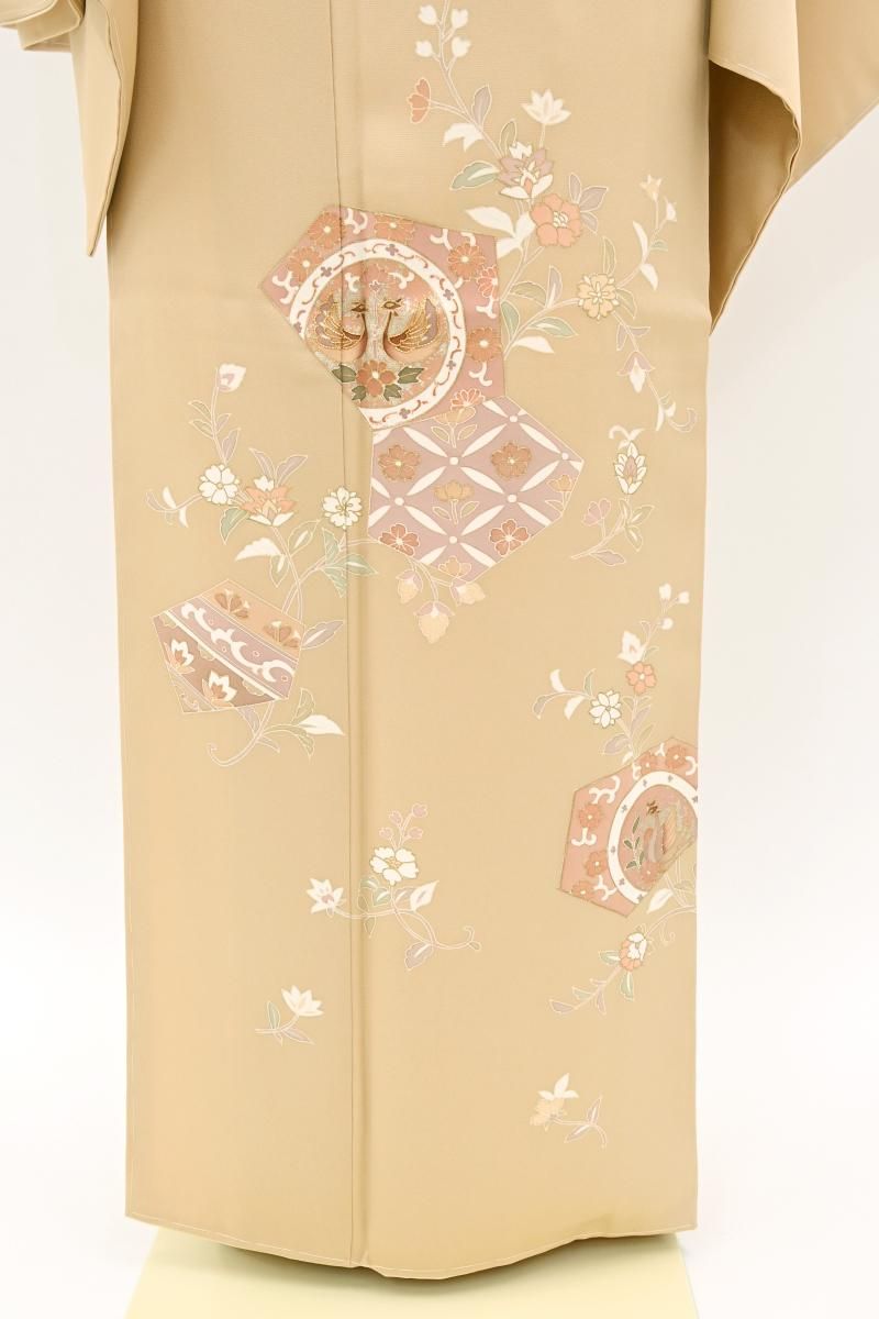 ほのかに灰みを含んだオレンジベージュの地に、亀甲や更紗調の花鳥文を配した訪問着です。