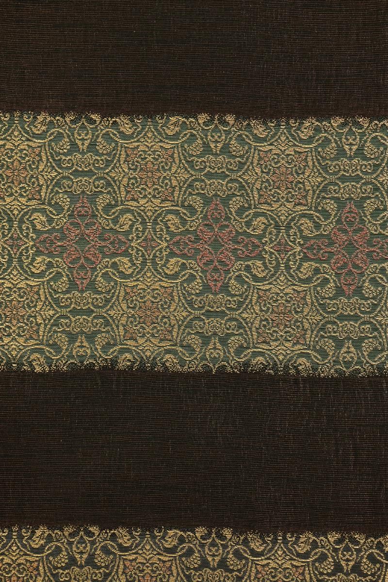 全体の印象としては桧皮色が近いでしょうか、ブロンズの箔糸を通した黒色の地に、深い緑の横段に金糸で葡萄唐草華文を織り出した格調高い趣のお品、揺らぎのある繊細な織りの表情と金糸の煌めきが相俟って陰影ある景色を創り出していますね。はっきりとした透け感はございませんが、軽くしなやかな風合いは真夏と真冬を除く季節に体感に合わせて長くお使いいただけることと思います。改まったお席の装いに存在感ある一本をいかがでしょうか。