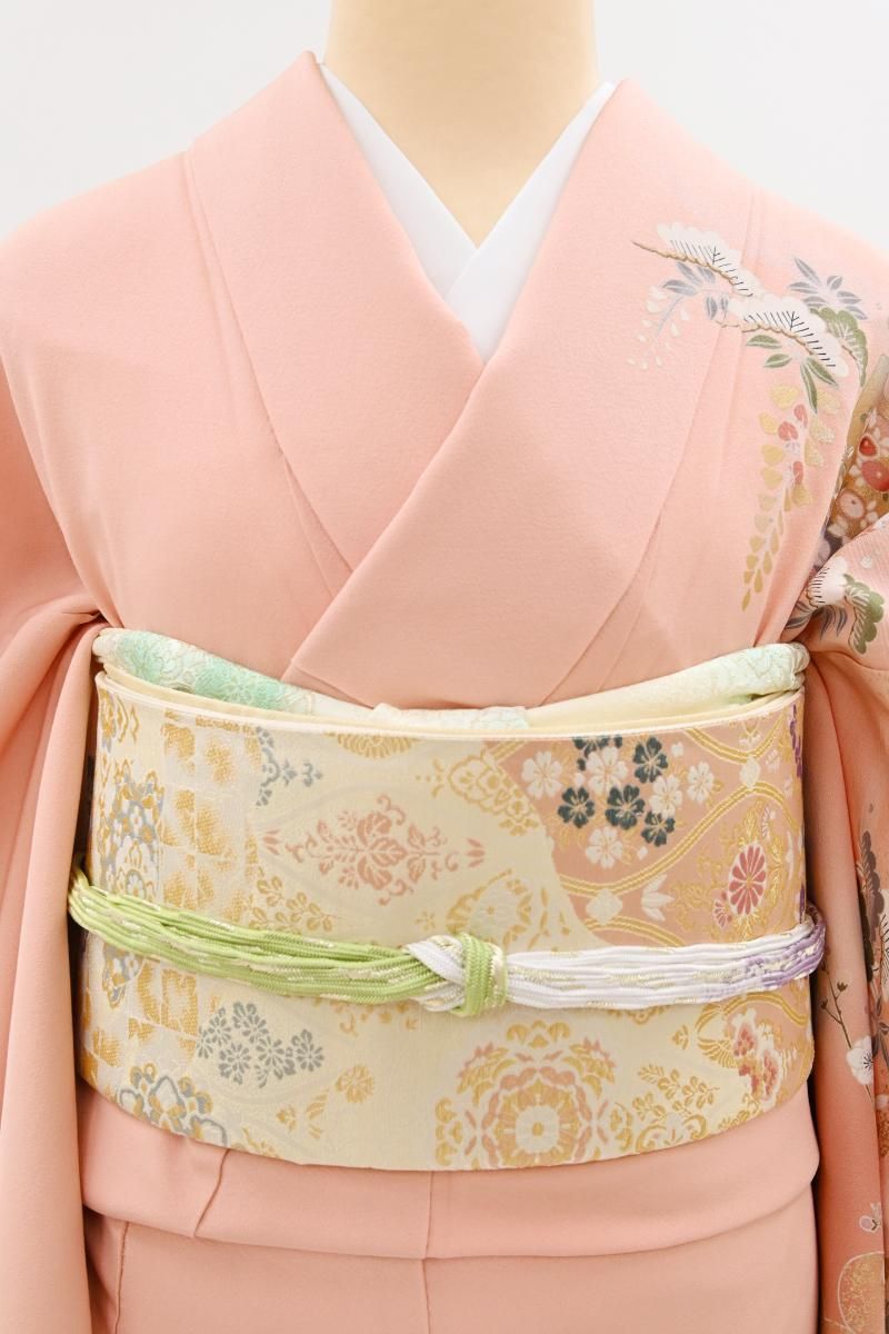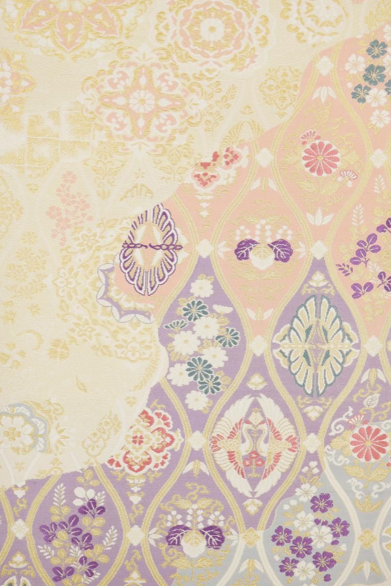 鳥の子色が近いでしょうか、明るいクリームイエローの地に道長取りに向かい鶴などをあしらった立涌や華文などを配した袋帯です。