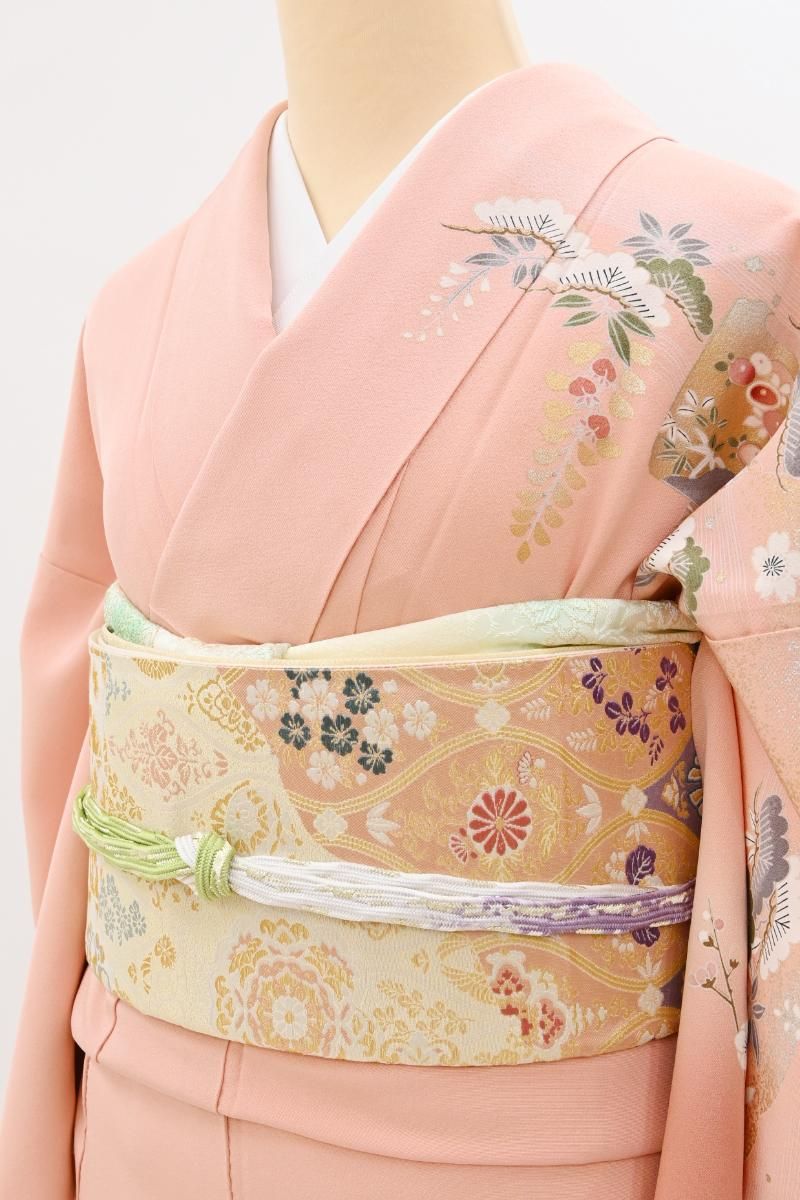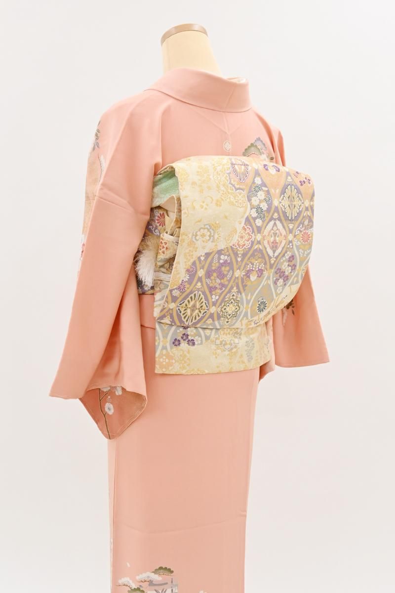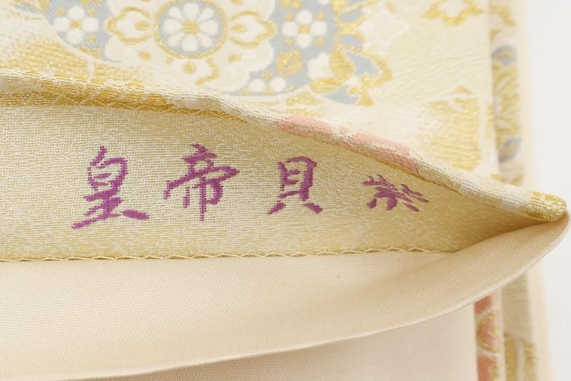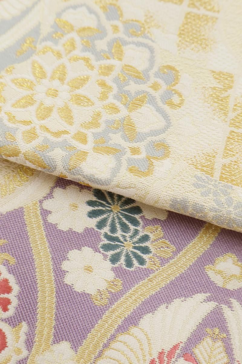 豊かな色彩と煌びやかな金糸使いで表現された典雅な意匠を、帝王紫の美しく気品豊かな紫色が一層の華やぎを添えて引き立てるお品、晴れの日に相応しい格調と存在感あふれる装いをお楽しみ頂けることと思います。色無地や訪問着などに合わせて改まったお席やお祝いのお席にいかがでしょうか。