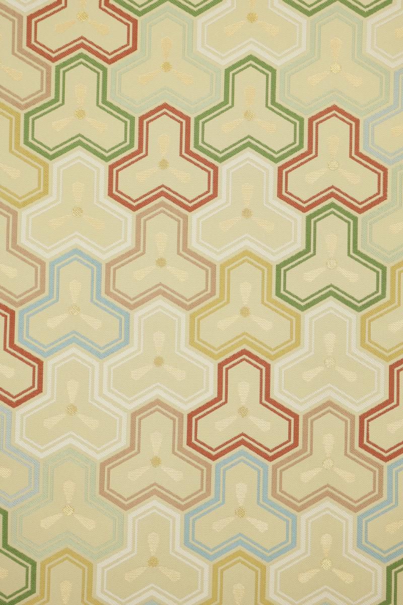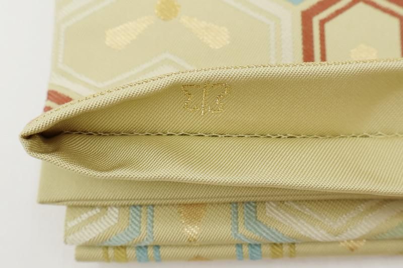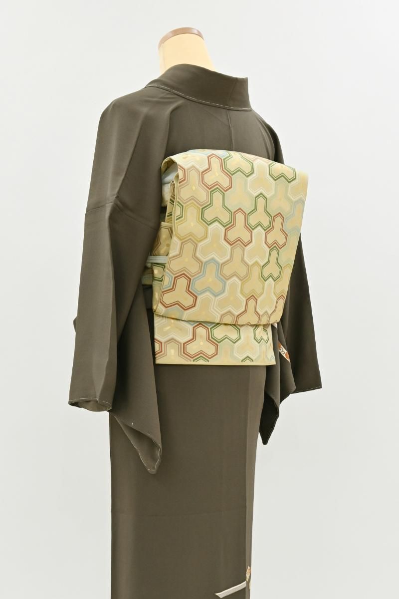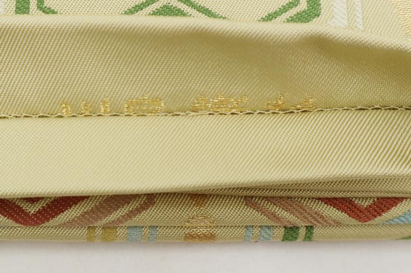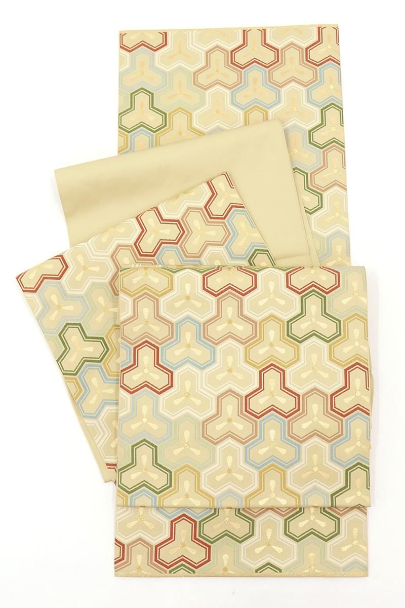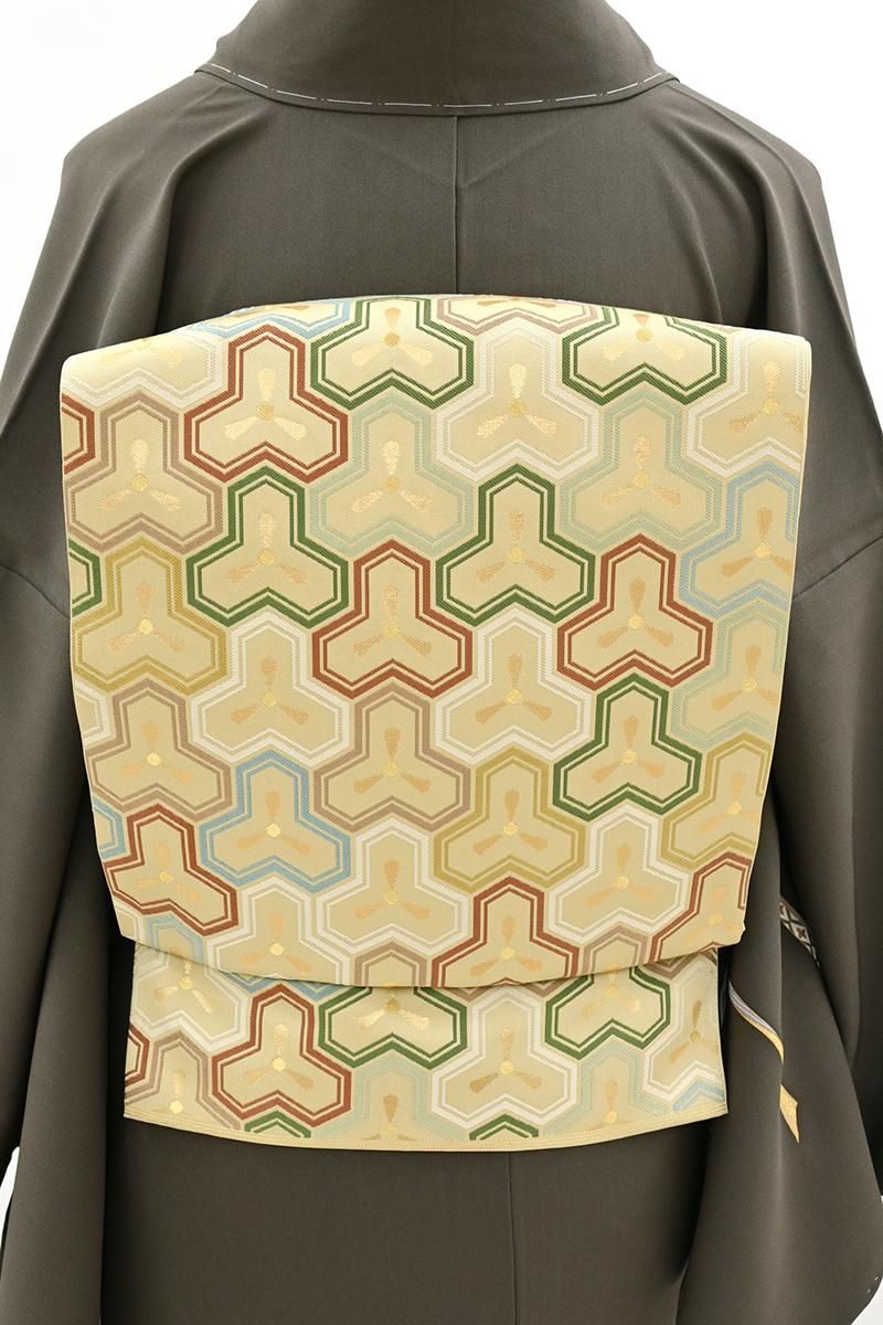 青朽葉色が近いでしょうか、灰みの淡い黄緑系の地に、水色や灰緑、赤など色とりどりの毘沙門亀甲文の並ぶ本袋帯です。
