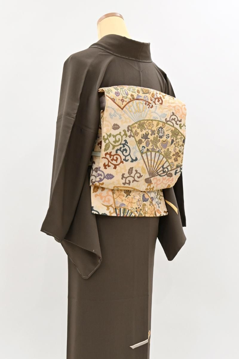 灰みを含んだ淡いベージュの地に、彩り豊かな唐草を背に、宝尽くしをあしらった扇面文を配した袋帯です。