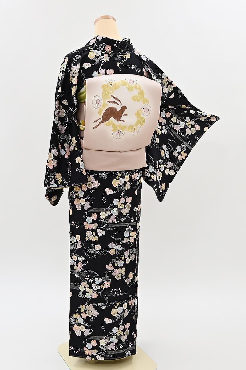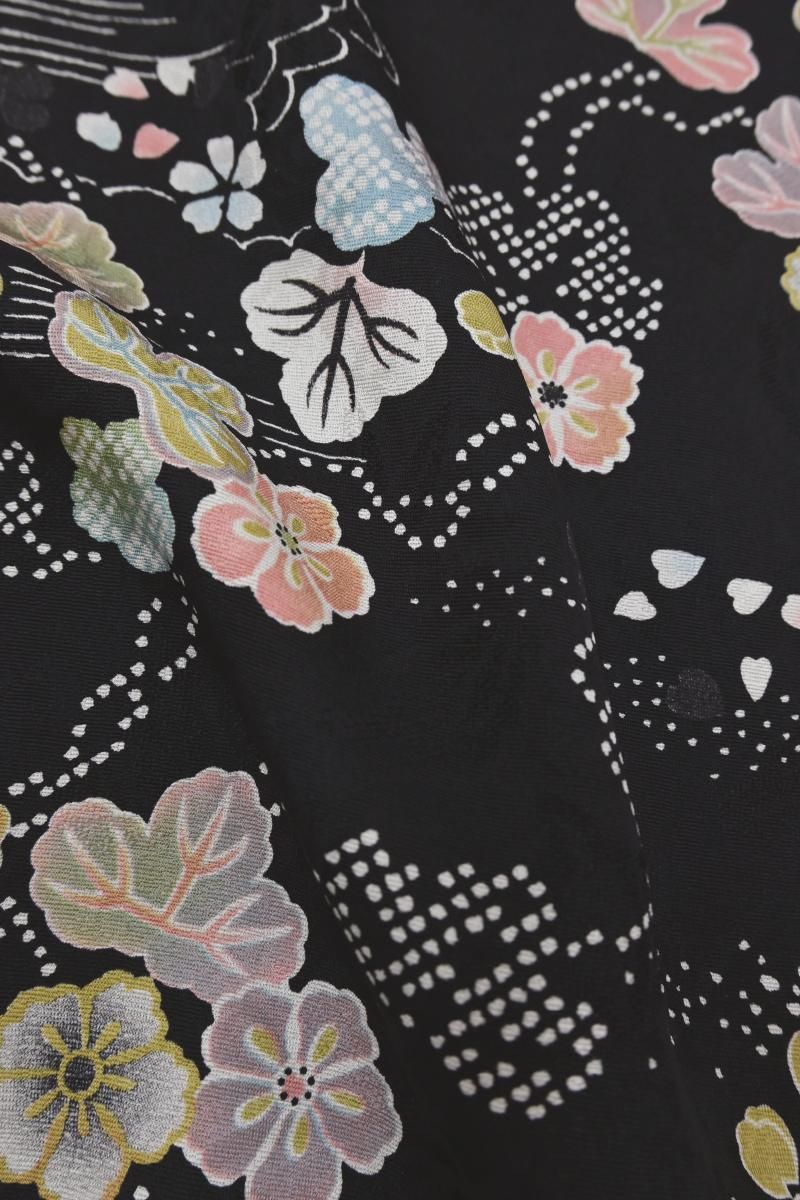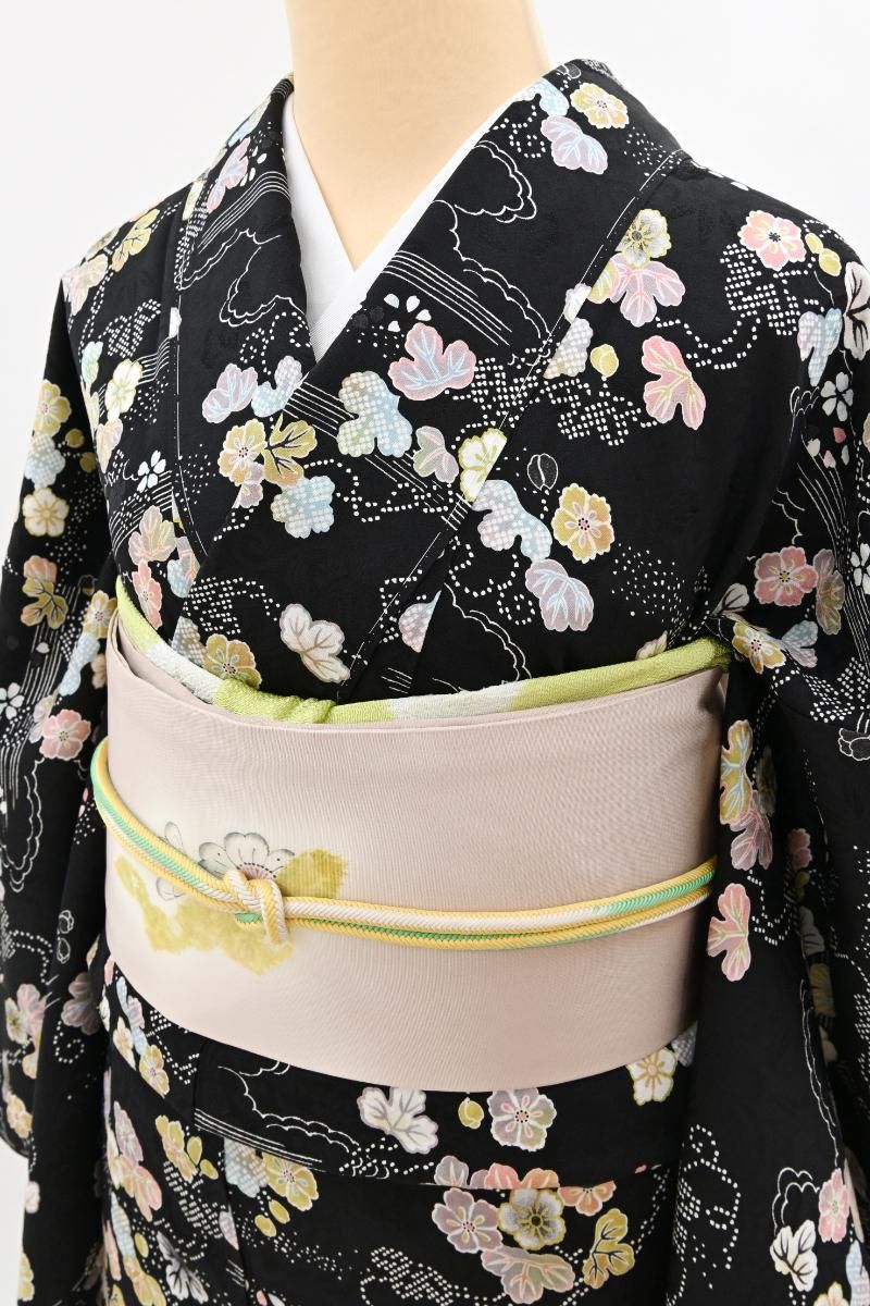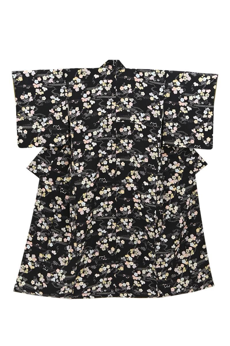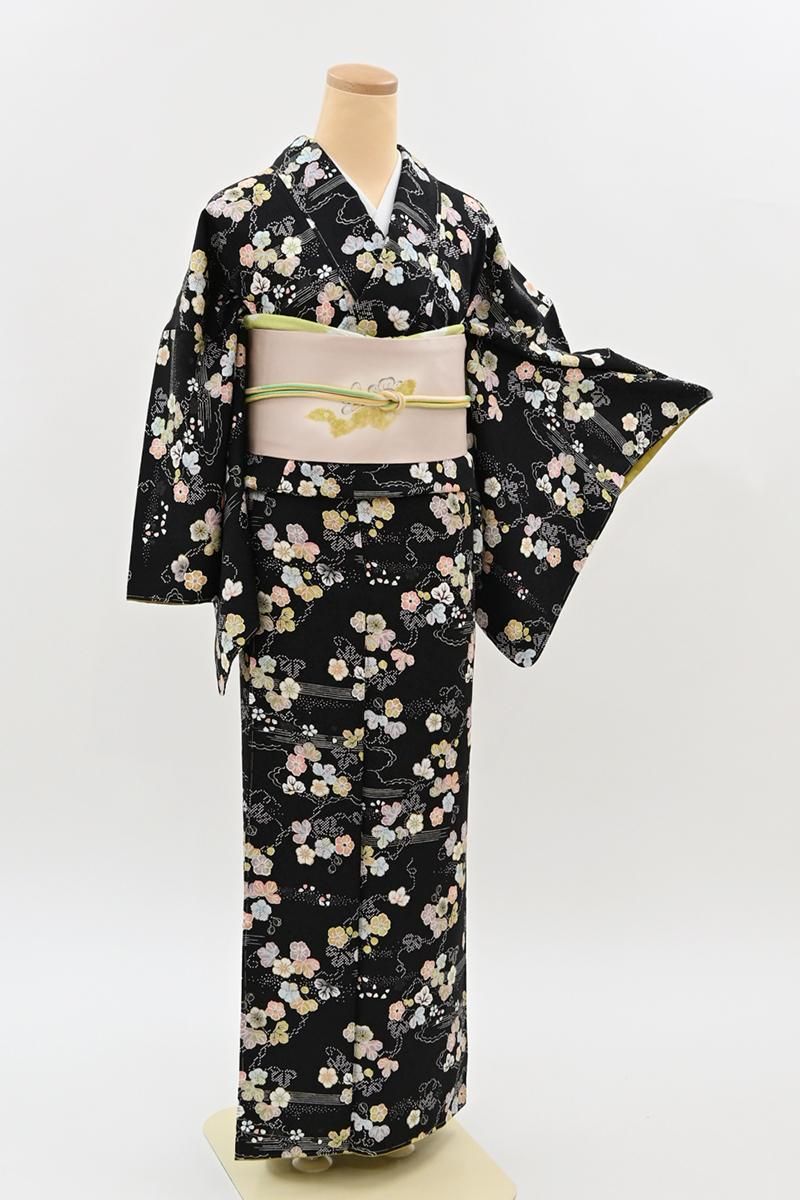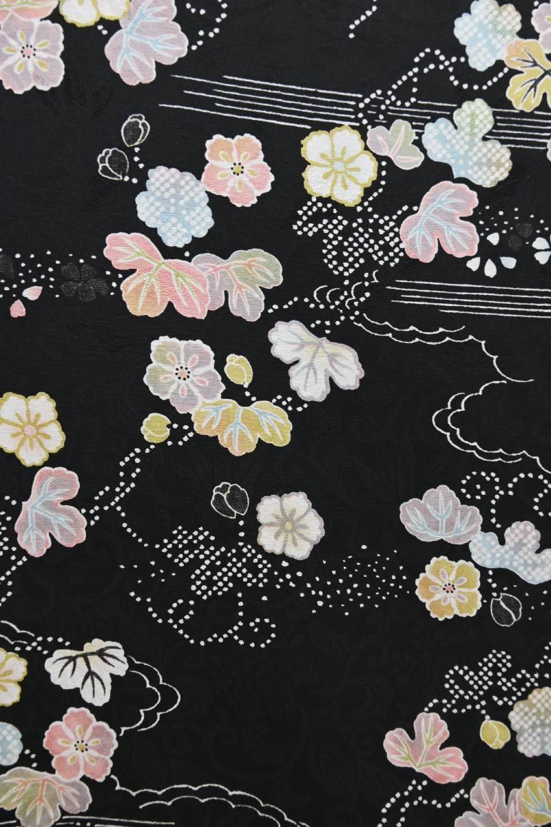 笹唐草の地紋の浮かぶまろやかな黒色の地に、桜や蔦を思わせる意匠を全体に配した小紋です。シックなお色目に、柔らかく優美な彩りで表現された意匠がくっきりと映えるお品、装いをはんなりと女性らしく引き立ててくれることと思います。季節の染め帯からモダンな洒落袋帯など帯合わせも様々に、お友達とのお出かけやお食事会などにいかがでしょうか。