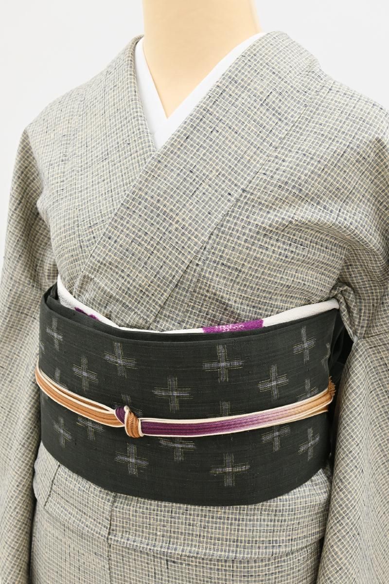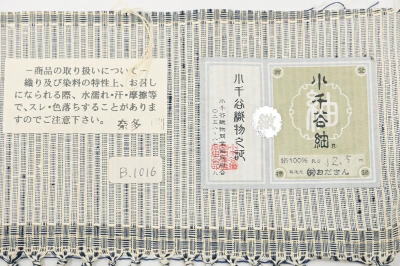 こちらは新潟県小千谷市で制作をなさる日本工芸会準会員 小田島克明さんの作品、深い紺とベージュの糸の織り交ざる景色が、素朴ながら味わい深い景色を創り出していますね。無地感覚で合わせる帯も幅広く、現代の街並みにもすっと馴染むすっきりとした装いをお楽しみいただけることと思います。小千谷紬は自然風土を大切に縮の技法を生かした織物、その独特のふんわりと柔らかな風合いを、ぜひお手に取ってご覧くださいませ。