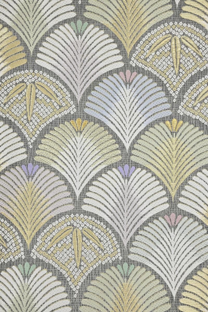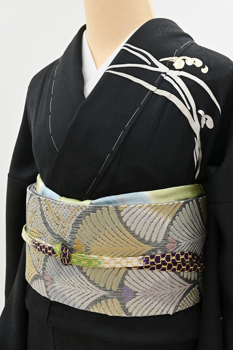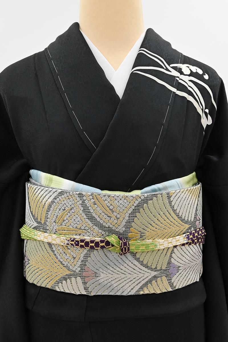 全体の印象としては鳩羽鼠色が近いでしょうか、やや紫みを含んだ金通しのグレーの地に、多彩な松葉青海波が整然と織り出された袋帯です。すっきりとしたお色目に、優美な彩りで表現された古典意匠が祝意溢れるお品、正統的な古典意匠ならではの高い格調が装いを気品豊かに引き立ててくれることと思います。色無地や付下げ、訪問着などに合わせて、改まったお席やお出かけなどにいかがでしょうか。