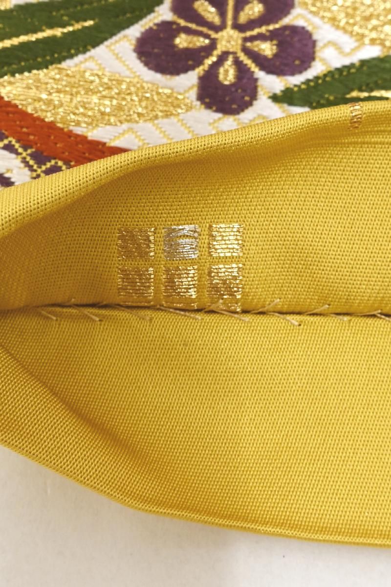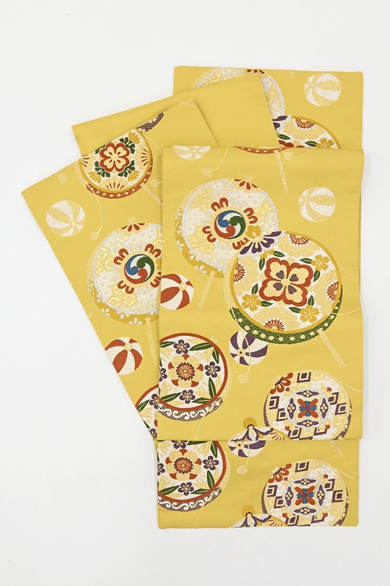 金糸雀色が近いでしょうか、僅かに灰みを含んだ黄色の地に、花菱や梅、桜などをあしらったでんでん太鼓や紙風船の意匠を織り出した袋帯です。