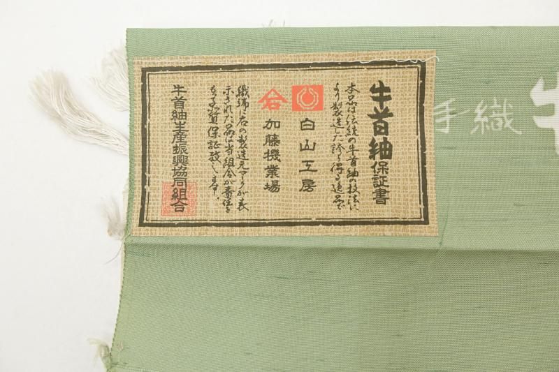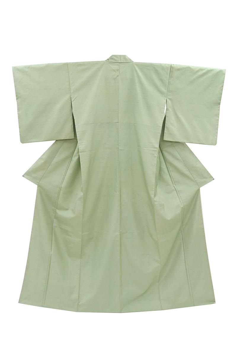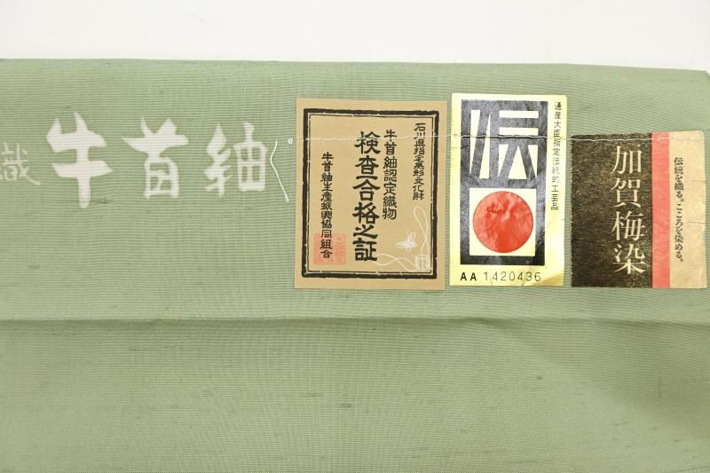 こちらは加賀染振興協会の厳しい落款制度の認可を得た本加賀友禅作家、岡本幸治さんが染めを手掛けた作品、染め下地には玉繭からのべ引きした稀少な糸を緯糸に用い、手機で丹念に織り上げられた白山工房製の牛首紬を使用しています。無地ながら節立った糸が程良い野趣のある印象的な景色を創っていますね。落ち着いたお色目の無地紬は合わせる帯を選ばず、また帯次第で街着から少し改まったお席まで、幅広い場面でお楽しみ頂けます。お探しの方、ぜひこの機会にお手に取ってご覧くださいませ。