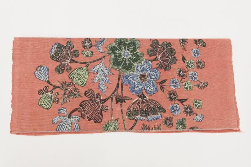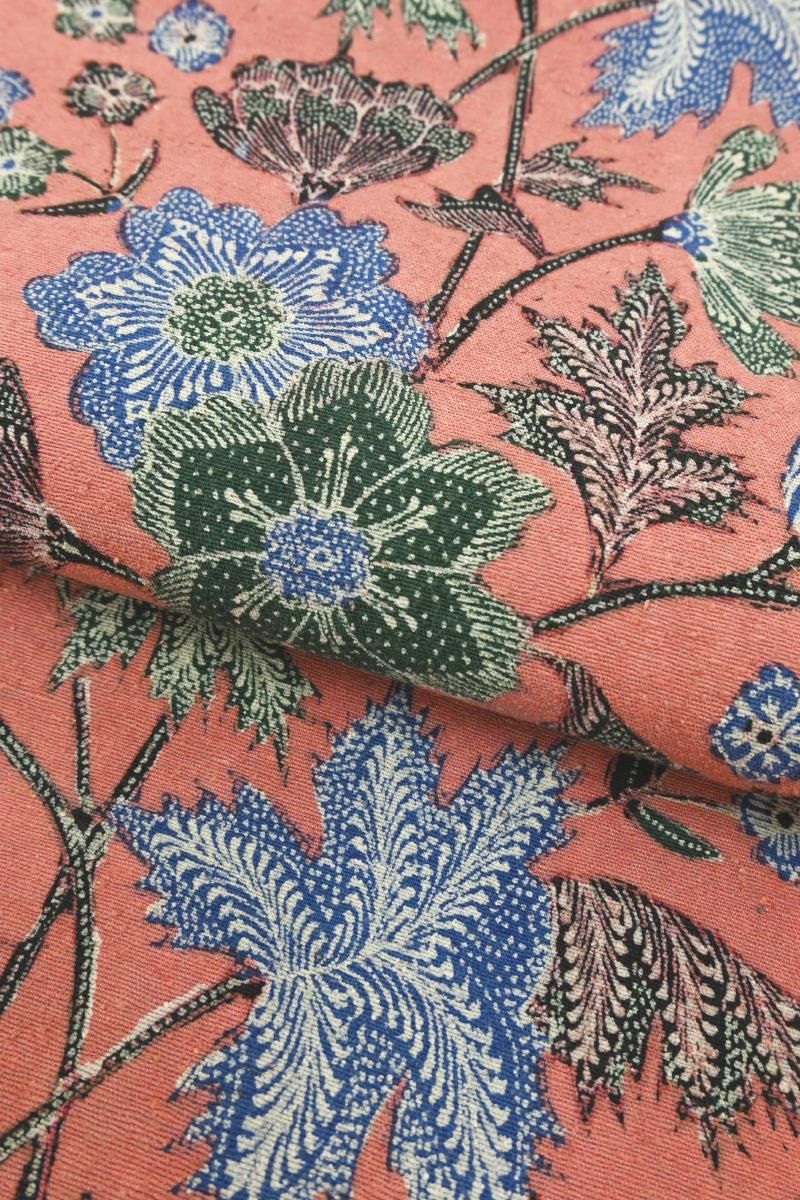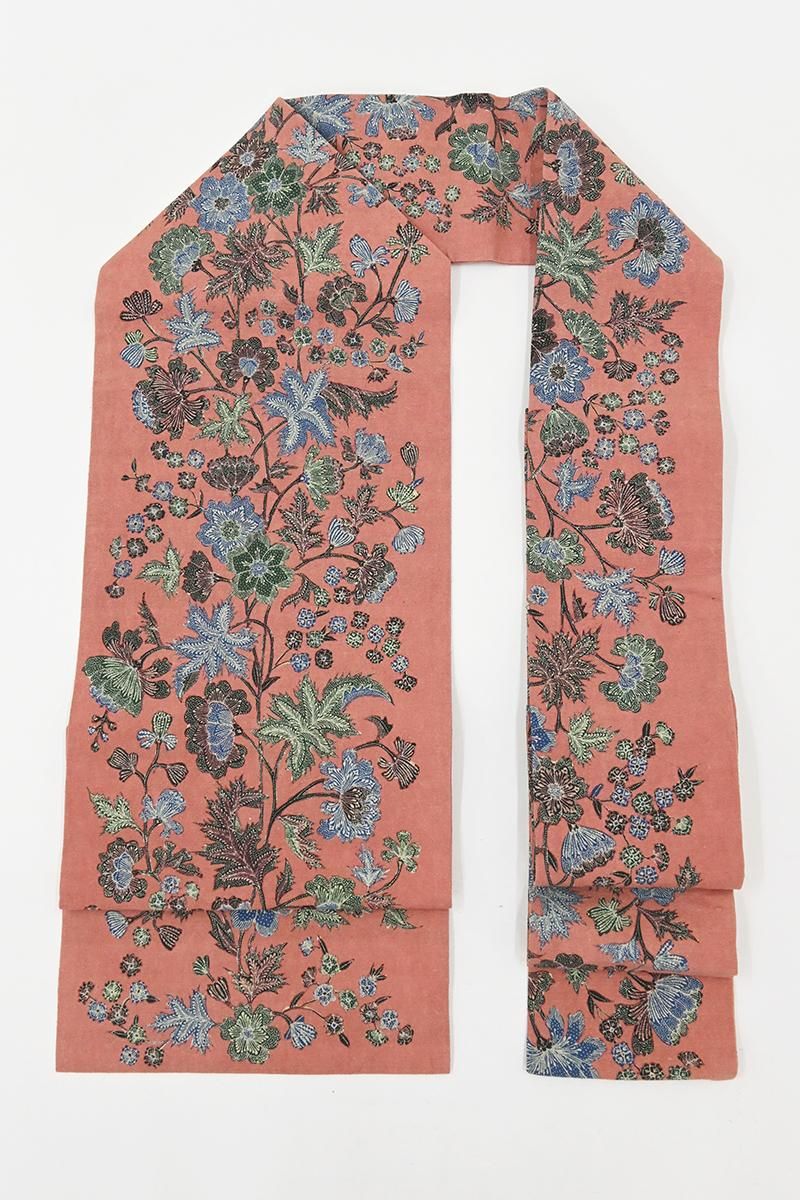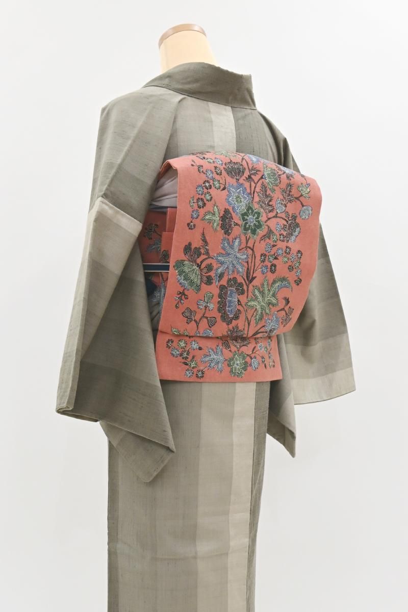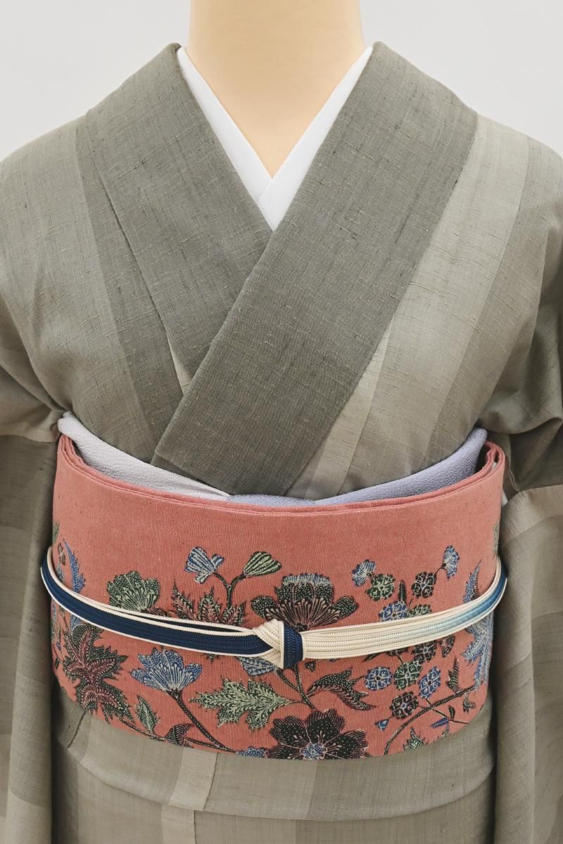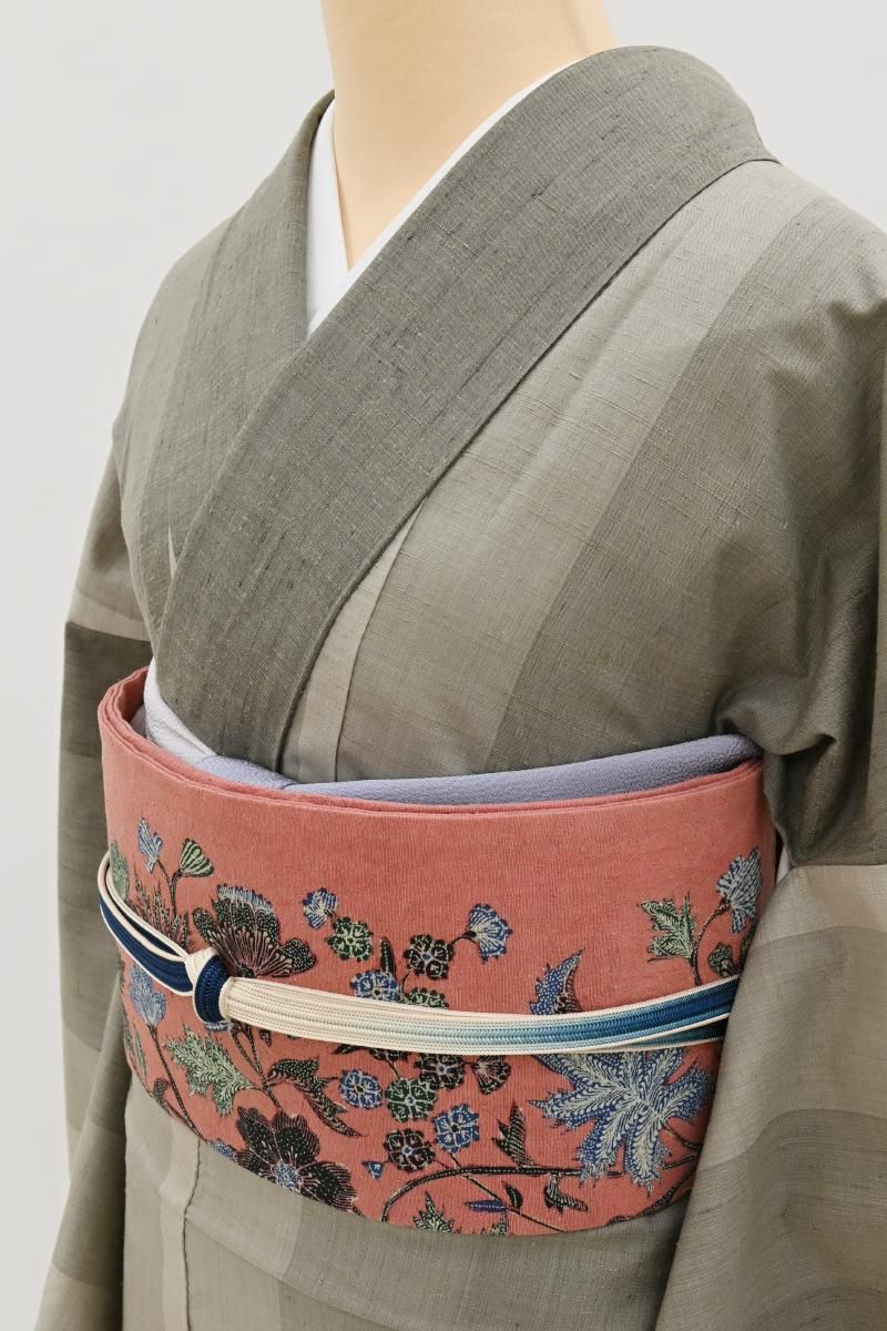 長春色が近いでしょうか、くすんだ黄みの赤系の紬地に、細やかな更紗花文を表現した染名古屋帯です。こちらはインドネシアで地元の職人さんと共に上質な手描きのジャワ更紗の伝統を守る、藤井礼子さんの作品。