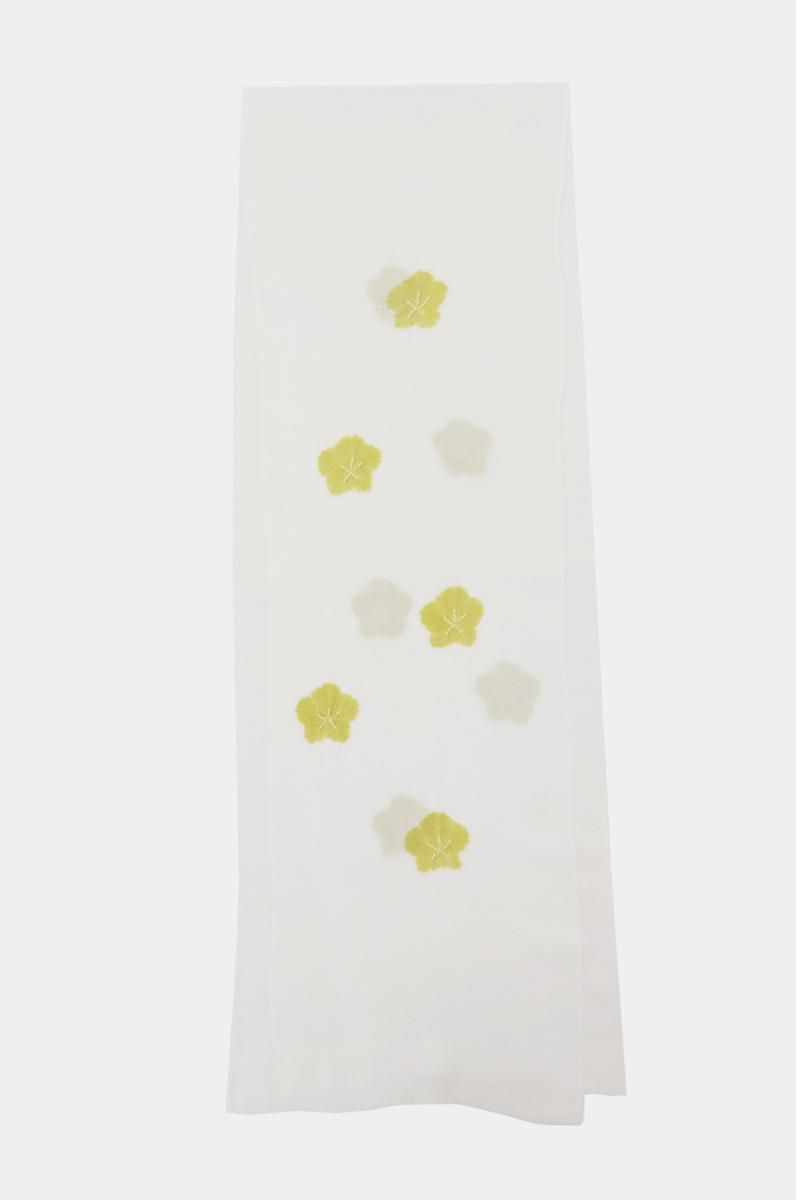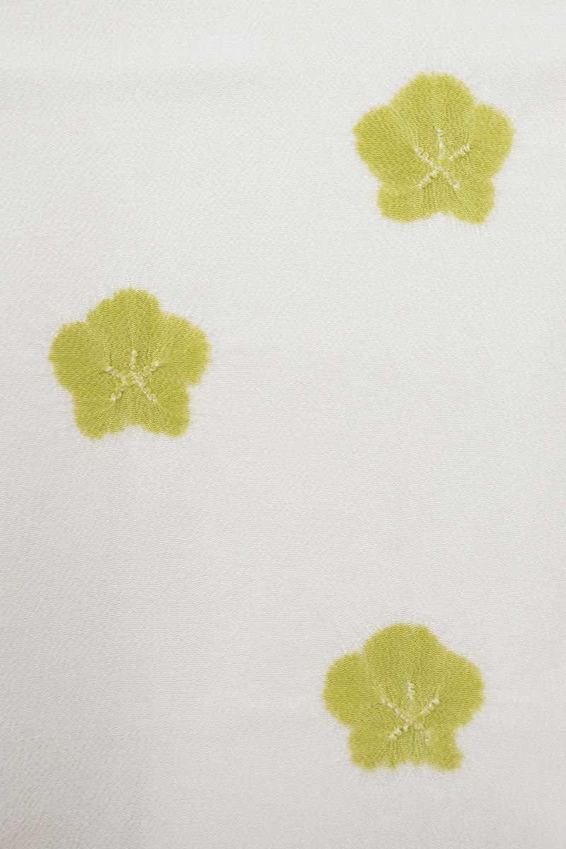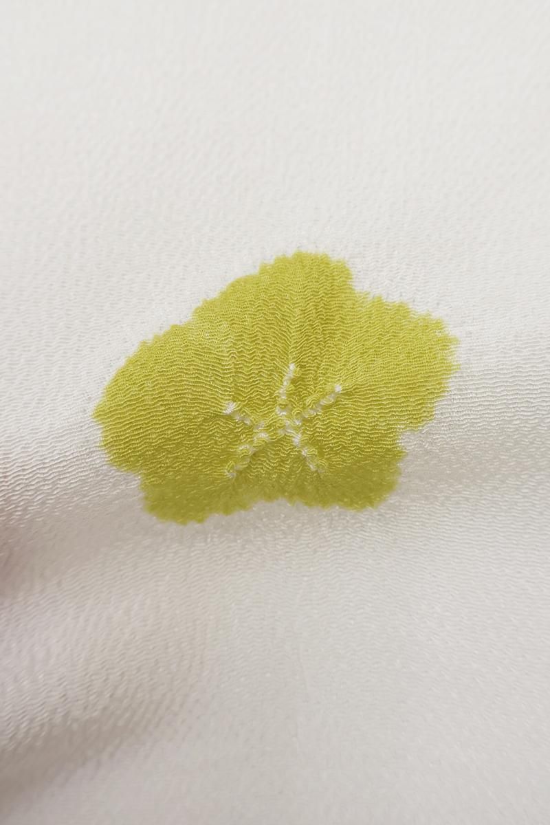 お色目は穏やかな白色を背景に、緑みのある落ち着いた黄色の取り合わせ。紬や小紋などに合わせて、飛び絞りならではのはんなりとしたかわいらしさをお楽しみ下さいませ。