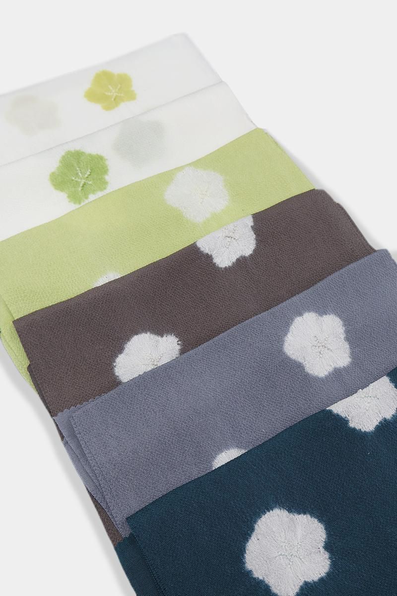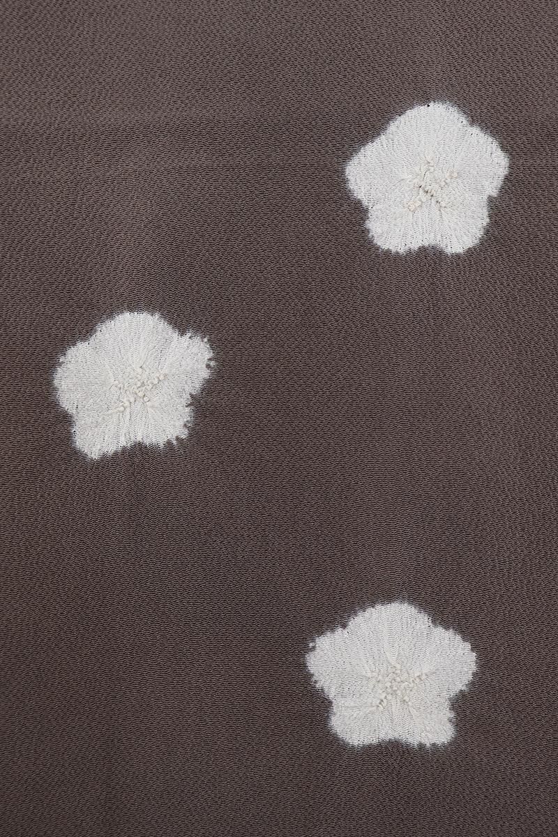こちらはふっくらとしたしぼのある縮緬地に絞りで梅花を散らした飛び絞りのお品、胸元やお太鼓脇からちらりと覗く美しい彩りが、装いに優しい趣きを添えてくれますね。