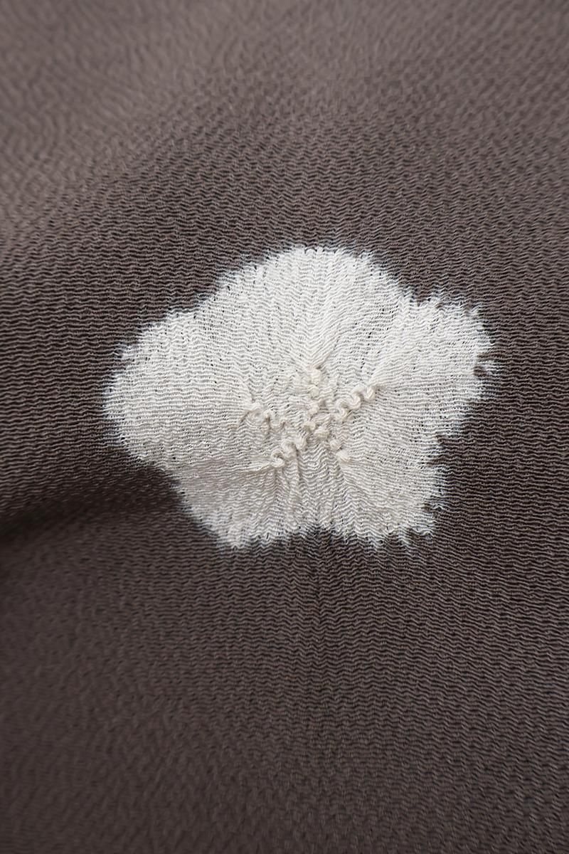 お色目は深みのある落ち着いた茶色を背景に、凛々しさを添える白色の取り合わせ。紬や小紋などに合わせて、飛び絞りならではのはんなりとした華をお楽しみ下さいませ。