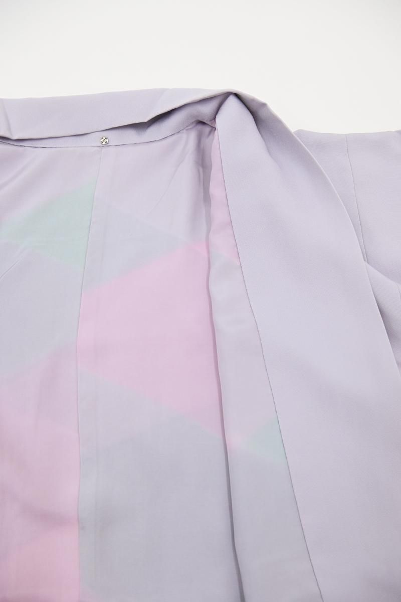 薄紫色の地に、同系色の濃淡で遠山暈しを配した道中着です。