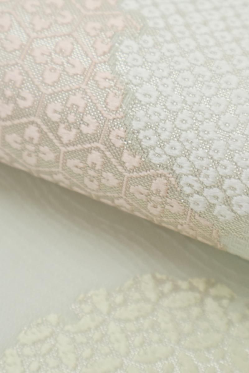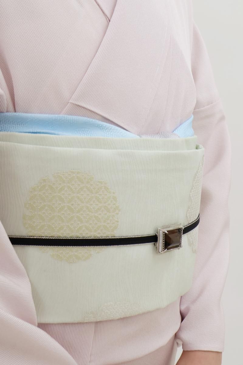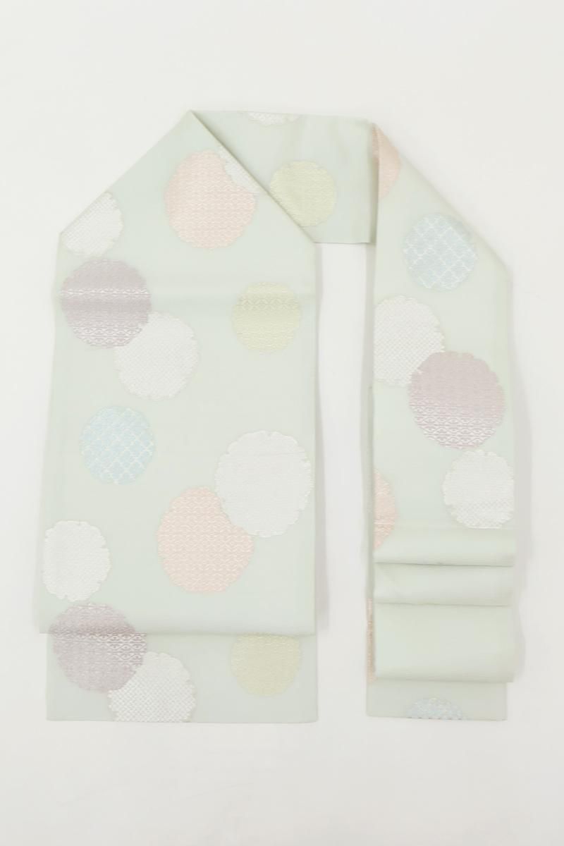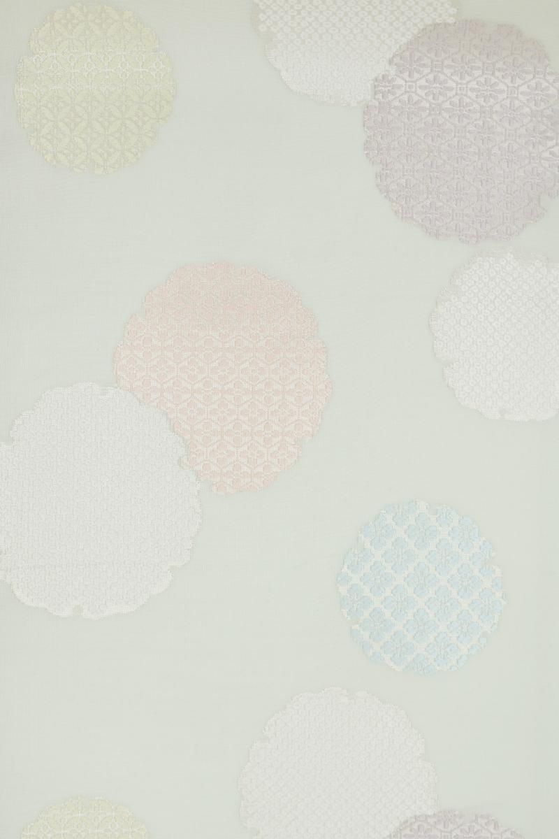 こちらはぐっと色を薄めた白緑色が近いでしょうか、流線の地紋の浮かぶごく淡い薄緑色系の地に、匹田や七宝、亀甲などを詰めた雪輪文を配したお品、穏やかな彩りや銀糸を用いて表した愛らしさのある古典的なモチーフが品良い華やぎで、装いを爽やかに引き立ててくれることと思います。こちらは軽い透け感がありますので単衣時期から夏を通して長い期間、気候に合わせてお楽しみいただけることと思います。格高の小紋から色無地、付下げなどに合わせていかがでしょうか。