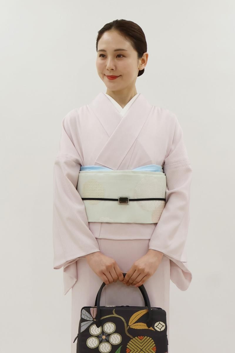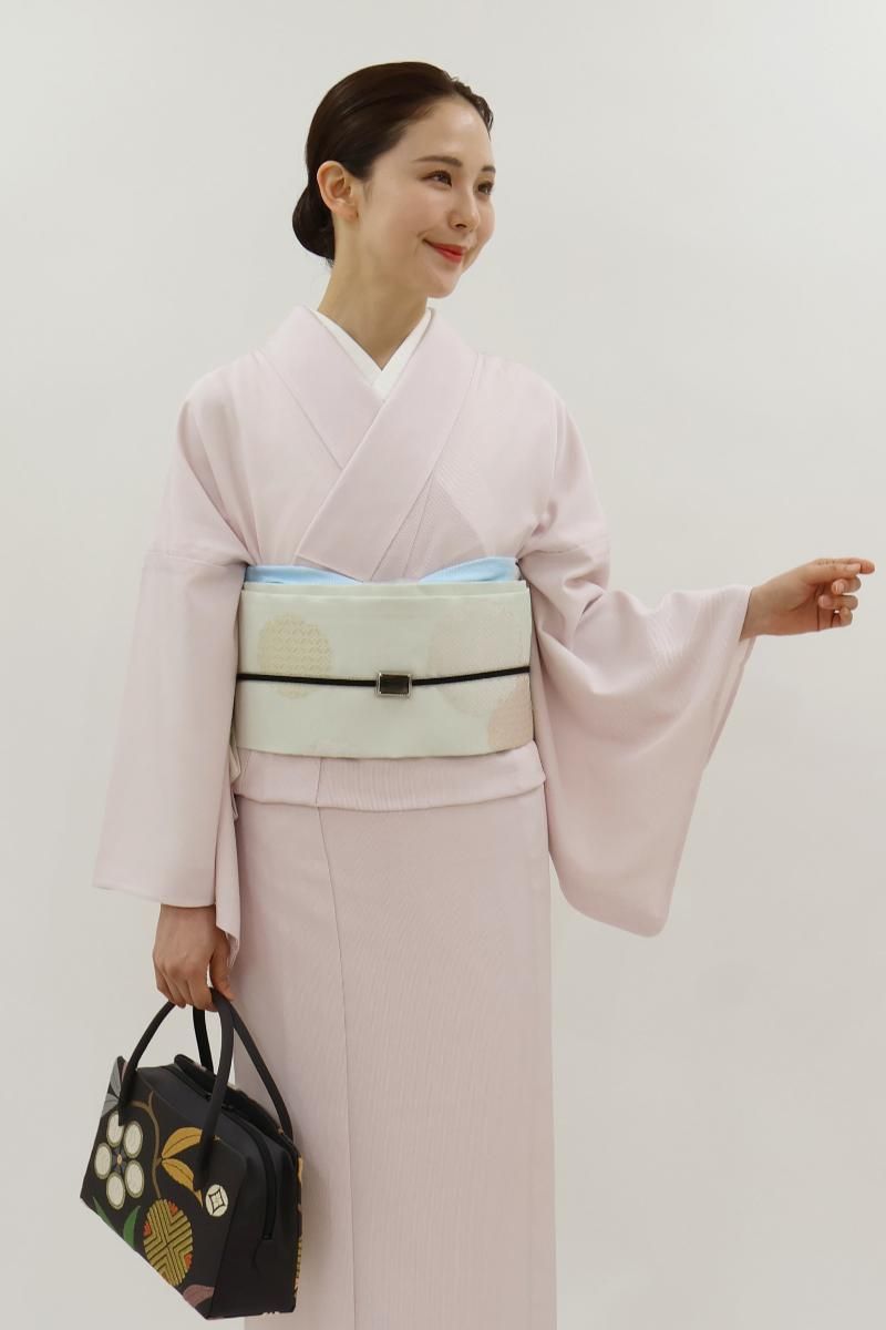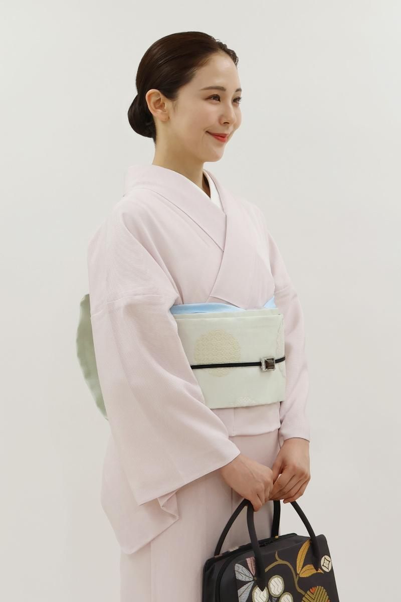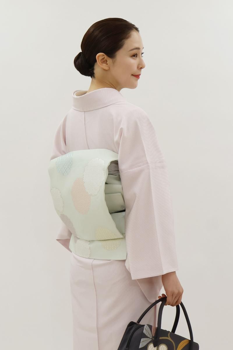 こちらはぐっと色を薄めた白緑色が近いでしょうか、流線の地紋の浮かぶごく淡い薄緑色系の地に、匹田や七宝、亀甲などを詰めた雪輪文を配したお品、穏やかな彩りや銀糸を用いて表した愛らしさのある古典的なモチーフが品良い華やぎで、装いを爽やかに引き立ててくれることと思います。こちらは軽い透け感がありますので単衣時期から夏を通して長い期間、気候に合わせてお楽しみいただけることと思います。格高の小紋から色無地、付下げなどに合わせていかがでしょうか。