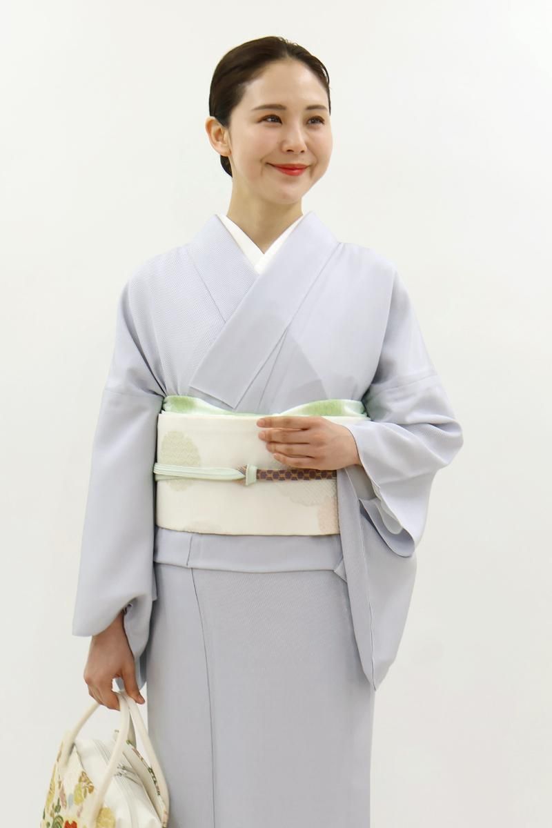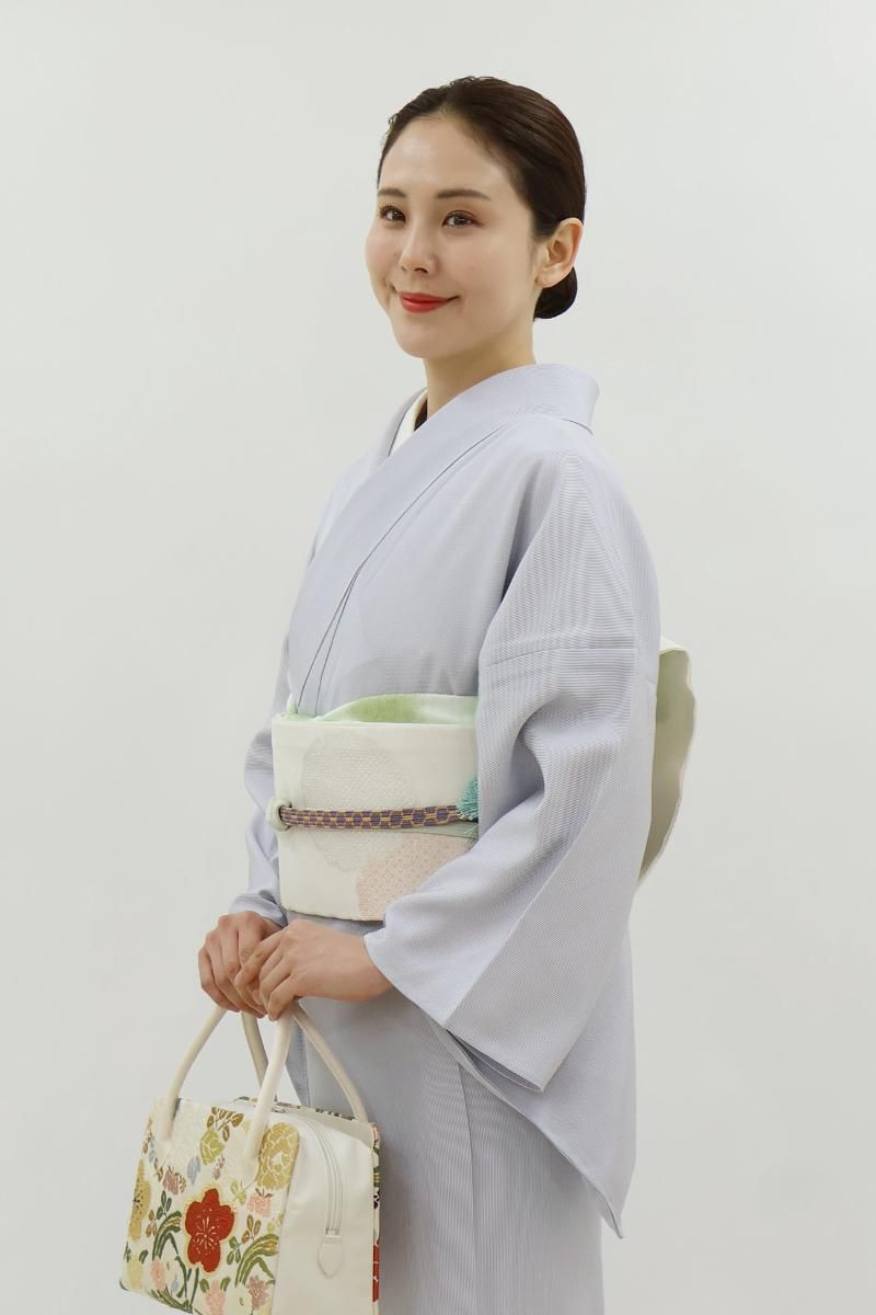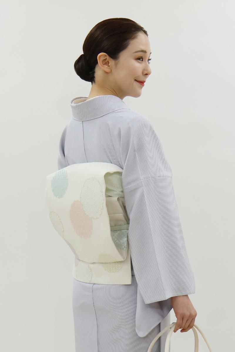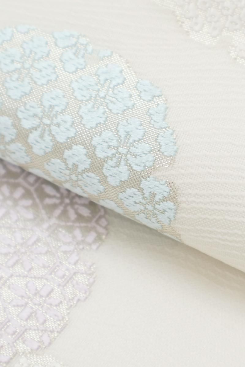 こちらは流線の地紋の浮かぶオフホワイトの地に、匹田や七宝、亀甲などを詰めた雪輪文を配したお品、穏やかな彩りや銀糸を用いて表した愛らしさのある古典的なモチーフが品良い華やぎで、装いを爽やかに引き立ててくれることと思います。こちらは軽い透け感がありますので単衣時期から夏を通して長い期間、気候に合わせてお楽しみいただけることと思います。格高の小紋から色無地、付下げなどに合わせていかがでしょうか。